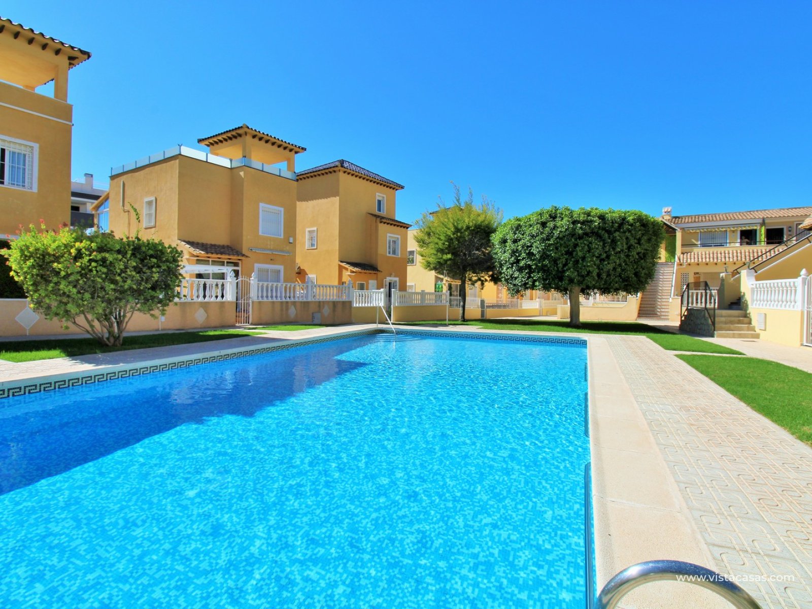 Außenbereich mit gefliestem Garten, Parkplatz und Zugang zum Gemeinschaftspool.