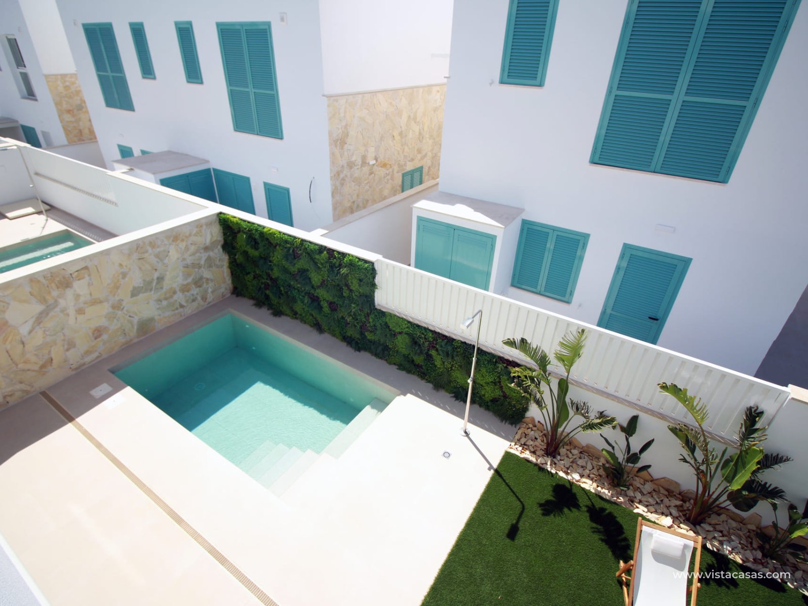 Auch das Äußere bleibt in Bezug auf Annehmlichkeiten nicht zurück. Jeder Bungalow verfügt über einen privaten Garten, ideal, um das mediterrane Klima das ganze Jahr über zu genießen. Die Terrasse ist der perfekte Ort für Abendessen im Freien oder einfach zum Entspannen mit einem guten Buch. Darüber hinaus haben die Bewohner Zugang zu einem Solarium, das freie Ausblicke bietet und die Möglichkeit, in völliger Privatsphäre zu sonnen. Und wenn die Hitze drückt, gibt es nichts Besseres, als in Ihrem eigenen privaten Pool zu entspannen, einem persönlichen Oasis, um sich zu erfrischen und den Sommer in vollen Zügen zu genießen.