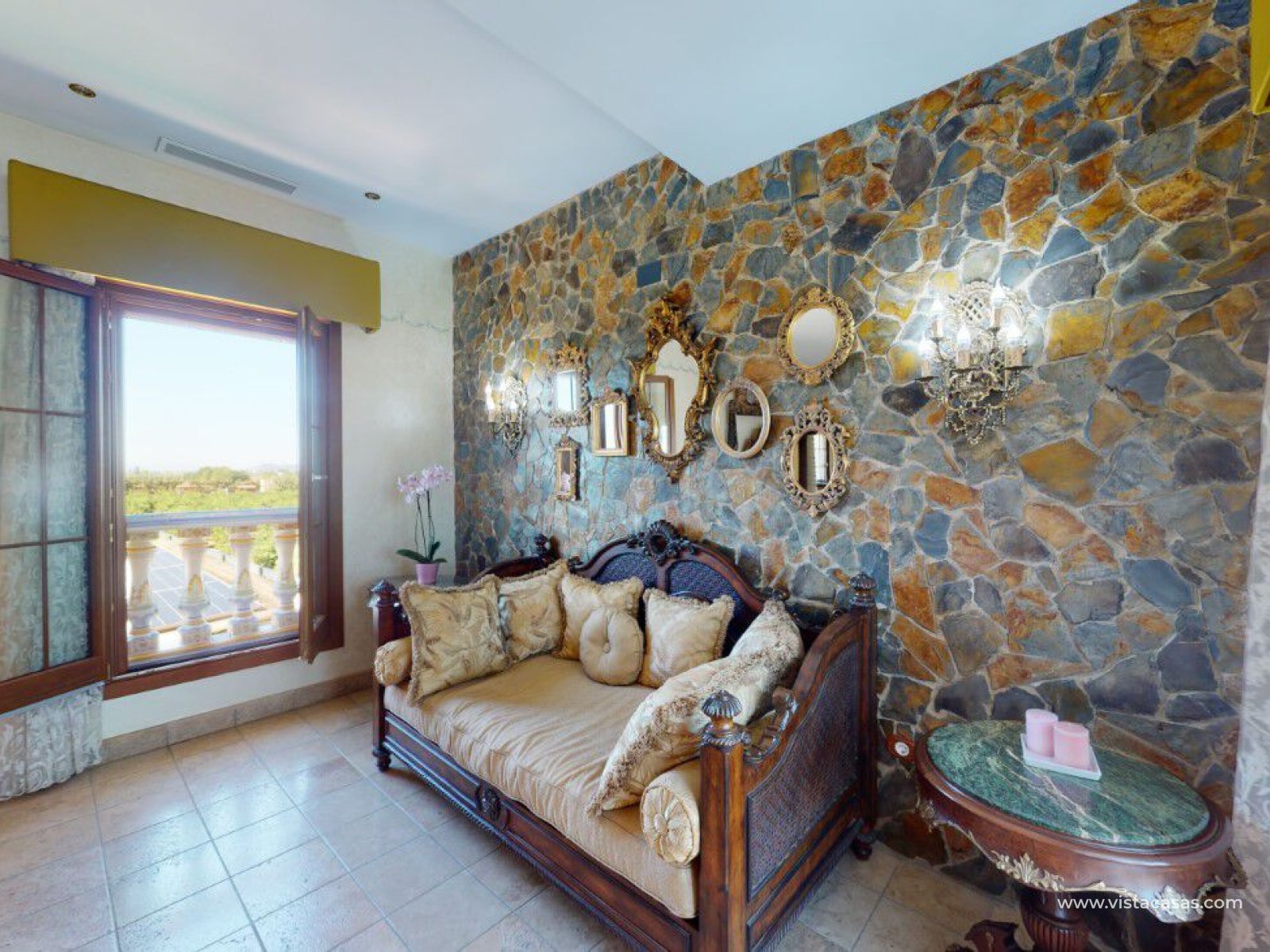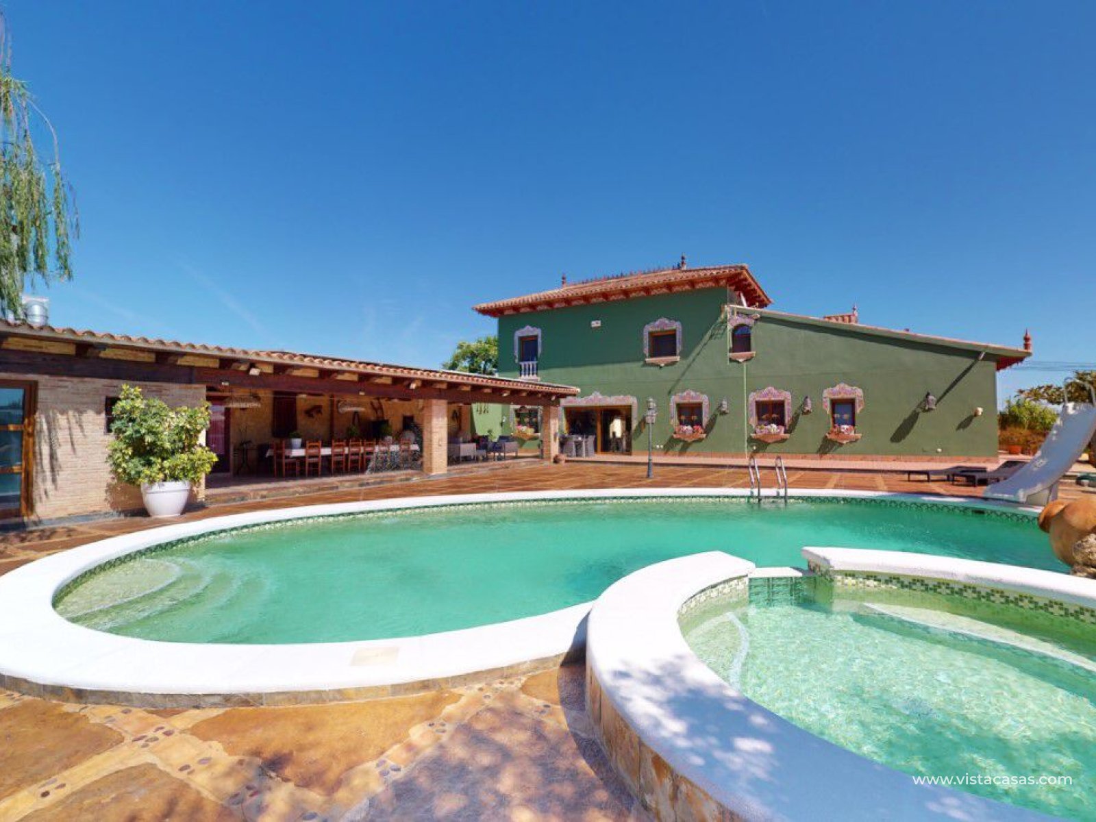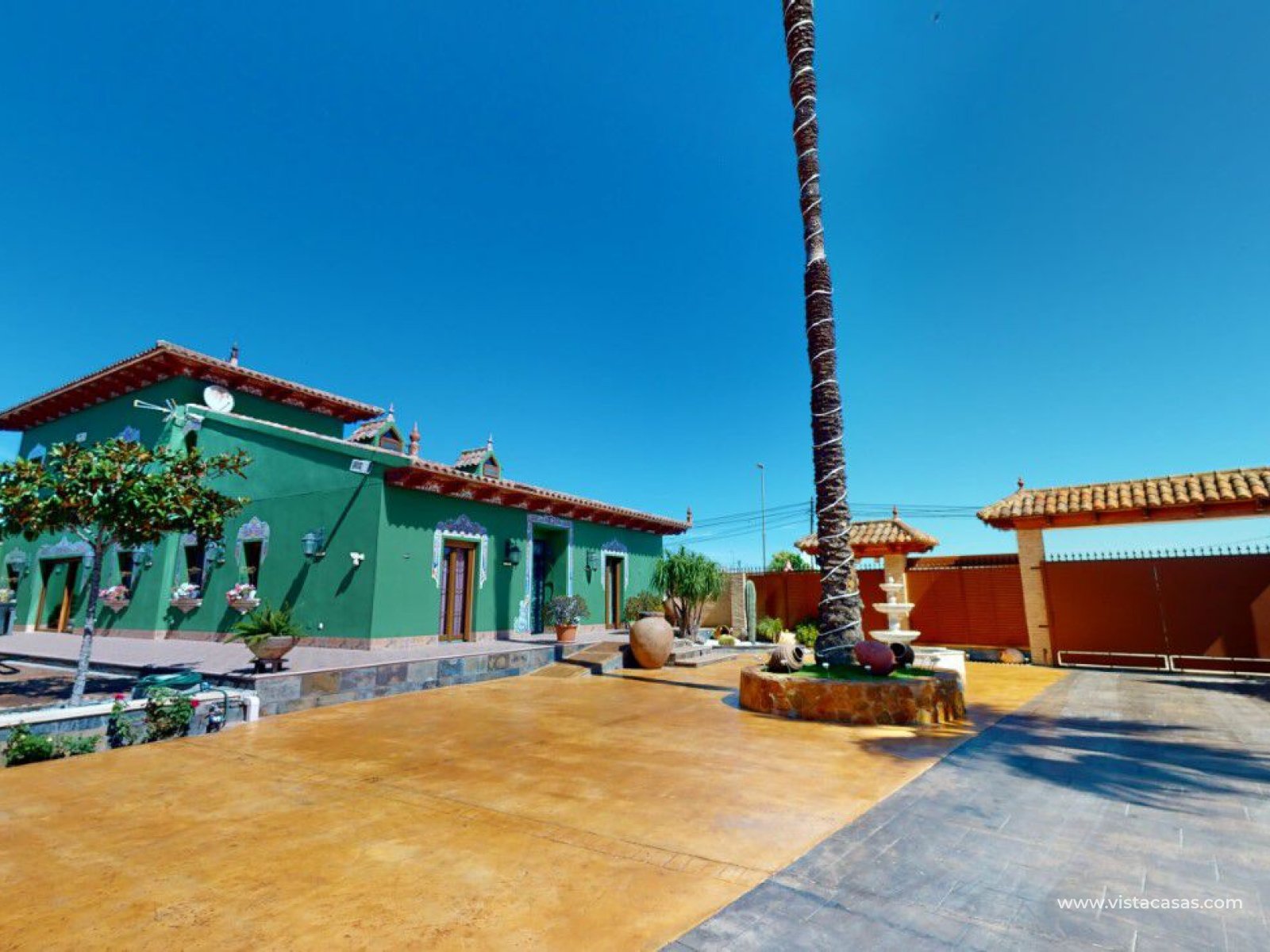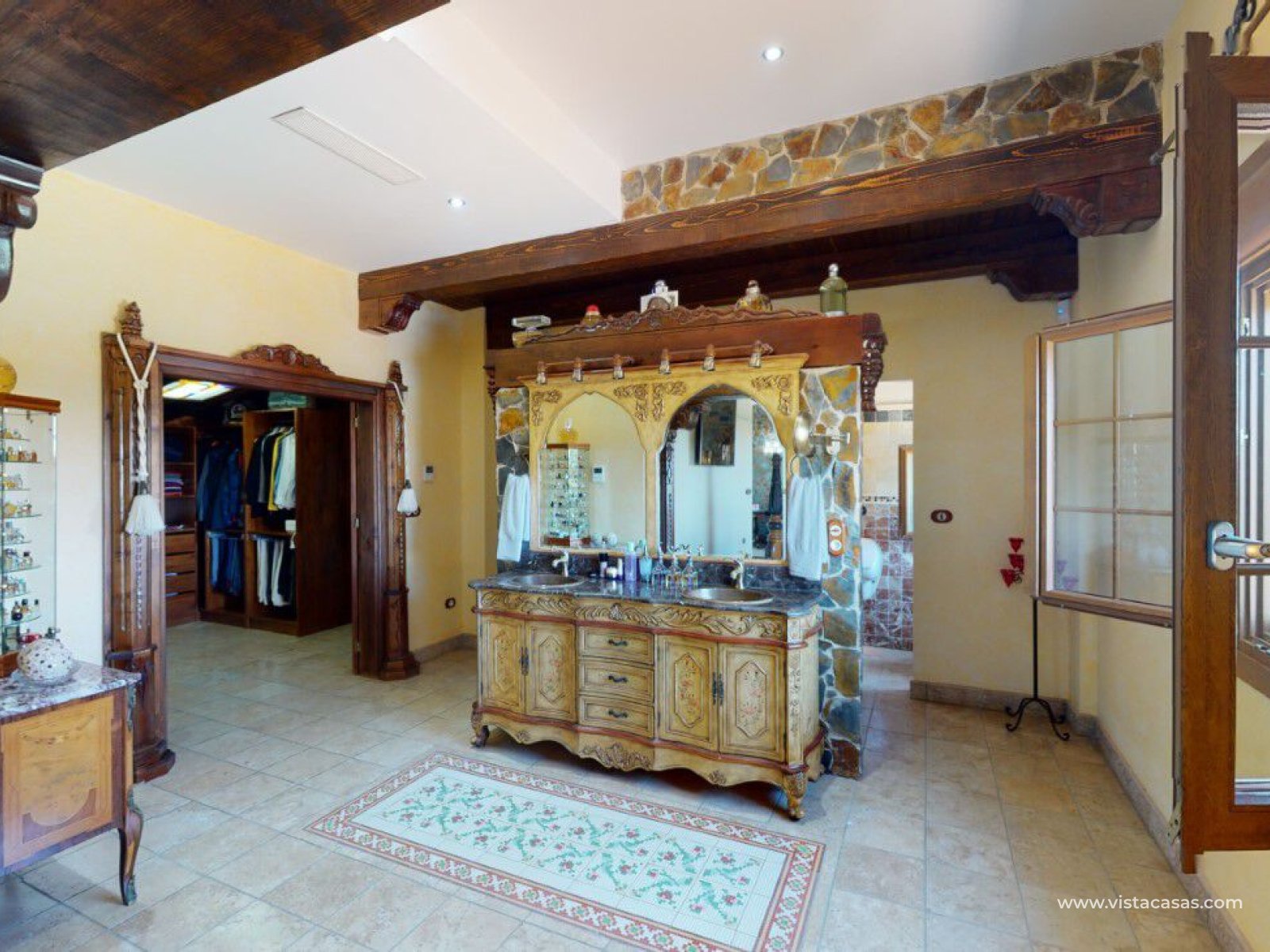 Phenomenal detached villa with a construction size of almost 500m 2 and a private pool on a plot of approximately 7,000m 2 . This detailed and well maintained gem of a property was designed by the current owners with all of the home's features carefully chosen to best represent the beautiful architecture. Entering the main entrance hallway, a handmade floor design is presented to replicate a hallway from an old Andalusian palace. The ground floor offers 3 large bedrooms, all of them with surprising private bathrooms. Further down, a bright and spacious living room with high quality craftsmanship including a fireplace built around an original Galician piece. Also a dining room, a bathroom (toilet and sink) and a fully equipped open plan kitchen with a large pantry. The first floor offers the master bedroom. The entire floor is dedicated to this room and is divided into 5 areas; The first of which is a living room with a beautiful wall with beautiful views of the Orihuela mountain range, a floating wall TV, a private bathroom with separate bath and shower, a dressing room with plenty of storage space and a safe room! The safe room door is undetectable when closed and its handle is in a secret location for your maximum security. The house itself was raised one and a half meters, thus avoiding humidity and its structure is anti-seismic. All doors are handmade, glass windows are custom designed (which future owners may have changed), all blinds are electric and the property also features marble floors with underground heating, air, CWC windows and Solar panels over the outdoor kitchen producing 13.6kw of electricity. Its privileged exterior of more than 7,000m 2 is divided into 3 main areas; A large terrace accessed through the kitchen door consisting of a laundry room and a large storage room with all large electronic devices to keep the noise level inside to a minimum. A private swimming pool (6m x 12m) with jacuzzi and slide, an external building with storage room, bathroom and a large shower room for the pool, a fully equipped outdoor kitchen with barbecue, a large dining room, a fountain and a driveway with Electric entry gates leading to a garage with space for 3 large vehicles. Finally, the property comes with around 6,500m2 of various orchards and right next to the property there is a stream which the owners use to water the orchard for free. If you would like to see the property in more detail, we have a 360° video tour below. Or call, book a showing with one of our agents and find the home of your dreams today!