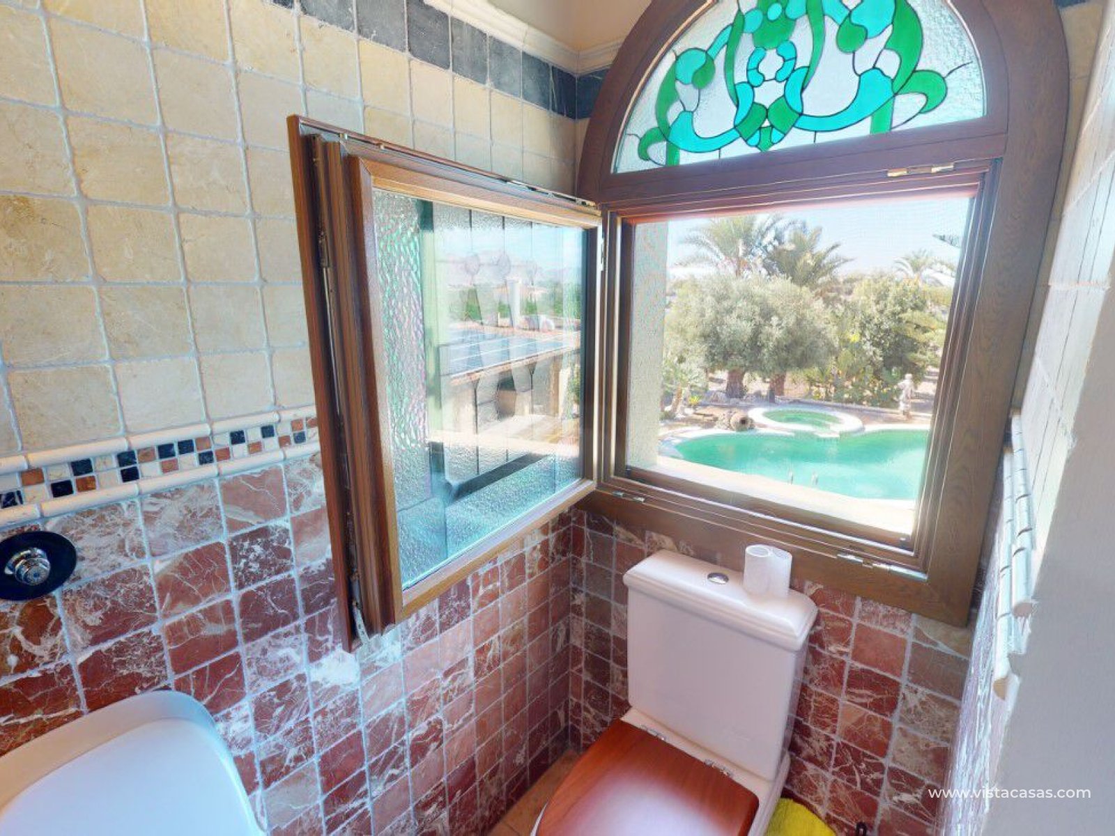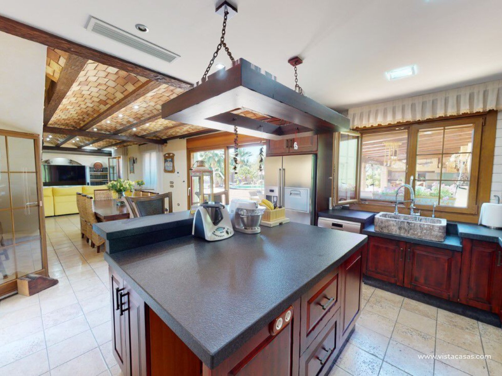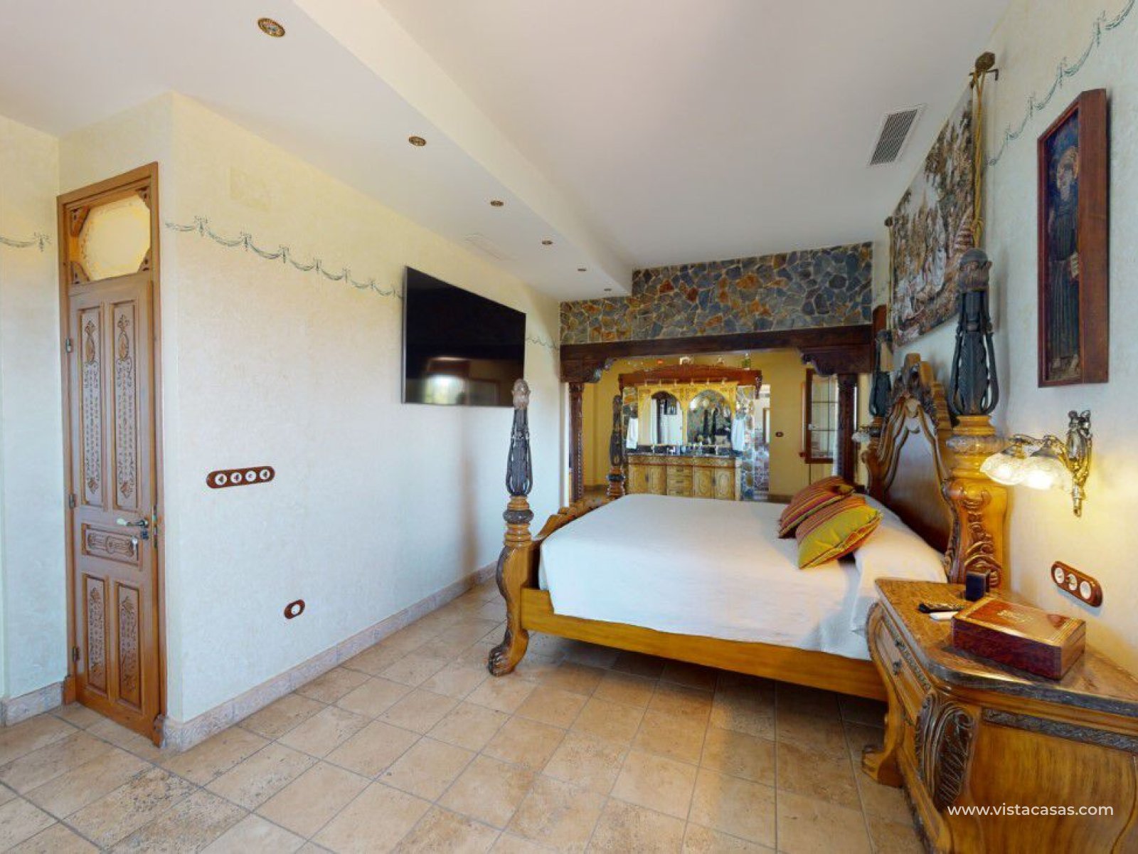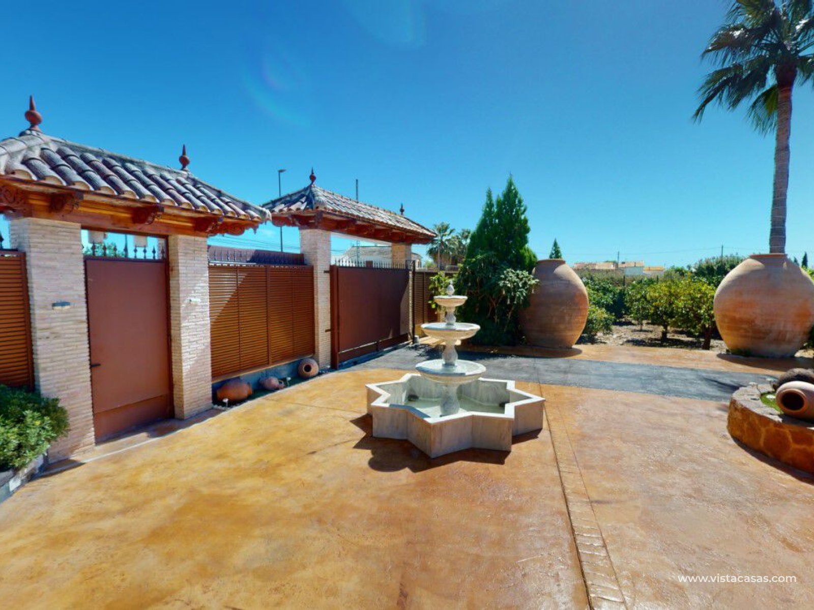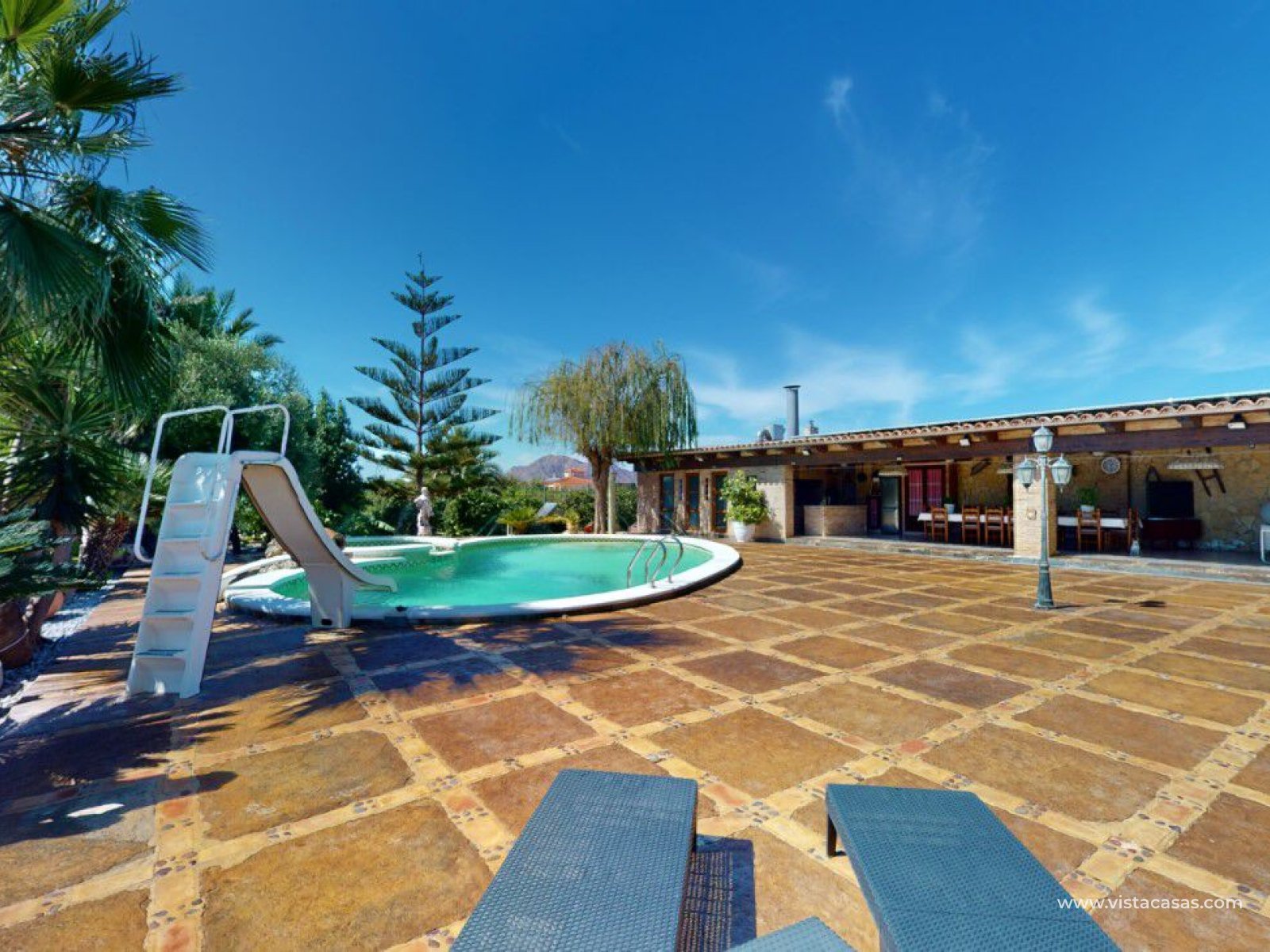 Phenomenal detached villa with a construction size of almost 500m 2 and a private pool on a plot of approximately 7,000m 2 . This detailed and well maintained gem of a property was designed by the current owners with all of the home's features carefully chosen to best represent the beautiful architecture. Entering the main entrance hallway, a handmade floor design is presented to replicate a hallway from an old Andalusian palace. The ground floor offers 3 large bedrooms, all of them with surprising private bathrooms. Further down, a bright and spacious living room with high quality craftsmanship including a fireplace built around an original Galician piece. Also a dining room, a bathroom (toilet and sink) and a fully equipped open plan kitchen with a large pantry. The first floor offers the master bedroom. The entire floor is dedicated to this room and is divided into 5 areas; The first of which is a living room with a beautiful wall with beautiful views of the Orihuela mountain range, a floating wall TV, a private bathroom with separate bath and shower, a dressing room with plenty of storage space and a safe room! The safe room door is undetectable when closed and its handle is in a secret location for your maximum security. The house itself was raised one and a half meters, thus avoiding humidity and its structure is anti-seismic. All doors are handmade, glass windows are custom designed (which future owners may have changed), all blinds are electric and the property also features marble floors with underground heating, air, CWC windows and Solar panels over the outdoor kitchen producing 13.6kw of electricity. Its privileged exterior of more than 7,000m 2 is divided into 3 main areas; A large terrace accessed through the kitchen door consisting of a laundry room and a large storage room with all large electronic devices to keep the noise level inside to a minimum. A private swimming pool (6m x 12m) with jacuzzi and slide, an external building with storage room, bathroom and a large shower room for the pool, a fully equipped outdoor kitchen with barbecue, a large dining room, a fountain and a driveway with Electric entry gates leading to a garage with space for 3 large vehicles. Finally, the property comes with around 6,500m2 of various orchards and right next to the property there is a stream which the owners use to water the orchard for free. If you would like to see the property in more detail, we have a 360° video tour below. Or call, book a showing with one of our agents and find the home of your dreams today!
