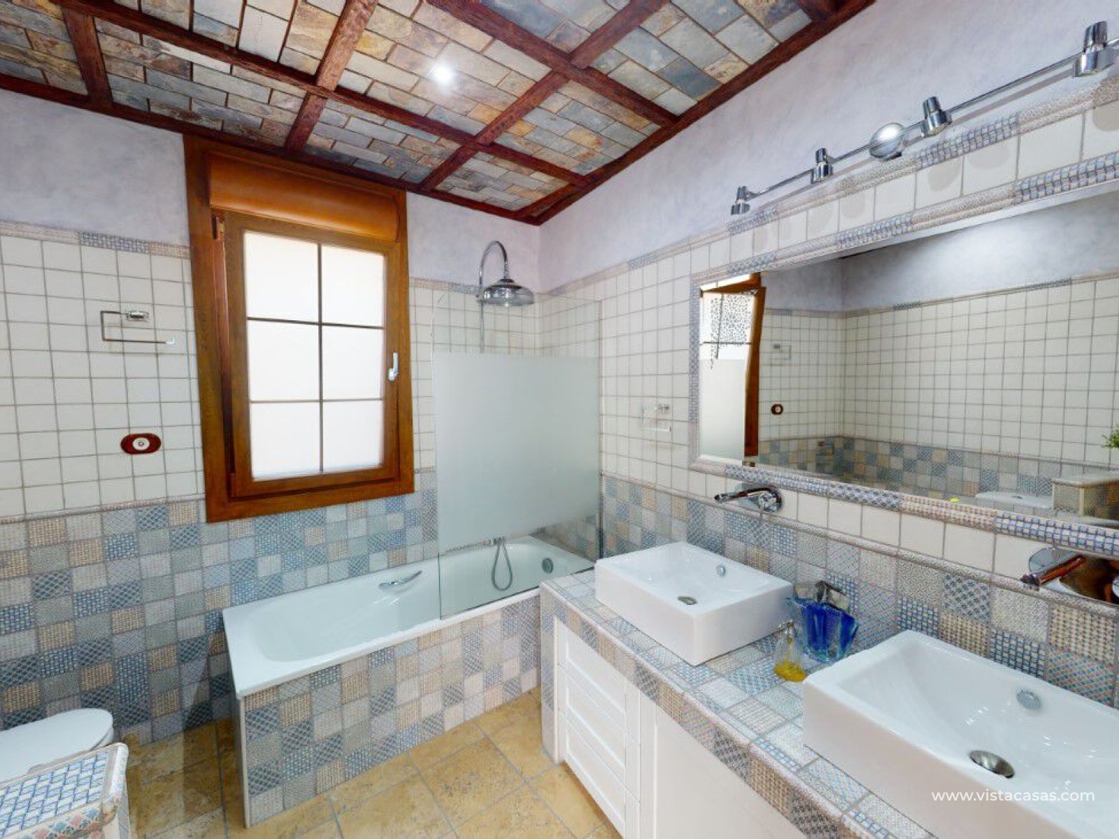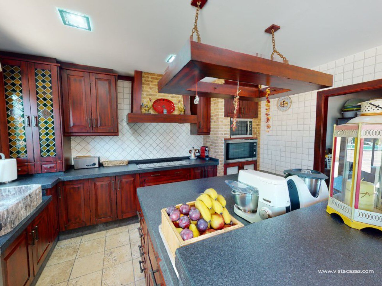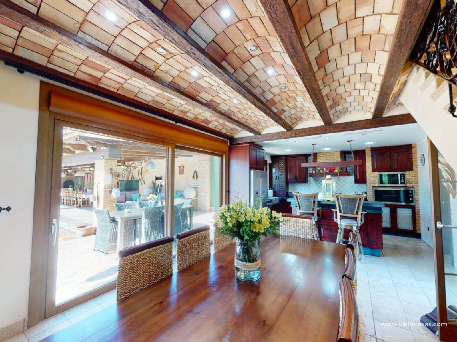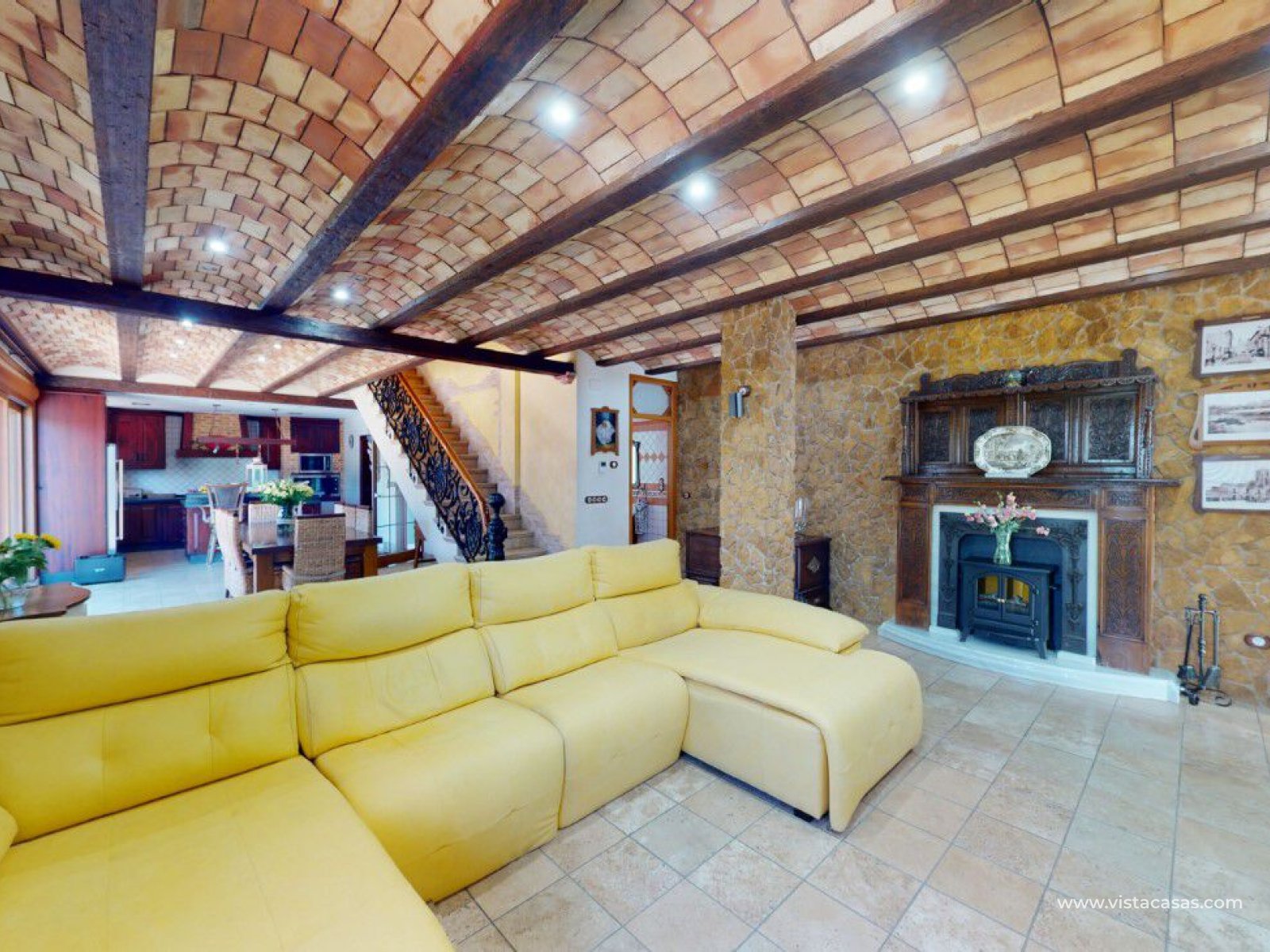 Phenomenal detached villa with a construction size of almost 500m 2 and a private pool on a plot of approximately 7,000m 2 . This detailed and well maintained gem of a property was designed by the current owners with all of the home's features carefully chosen to best represent the beautiful architecture. Entering the main entrance hallway, a handmade floor design is presented to replicate a hallway from an old Andalusian palace. The ground floor offers 3 large bedrooms, all of them with surprising private bathrooms. Further down, a bright and spacious living room with high quality craftsmanship including a fireplace built around an original Galician piece. Also a dining room, a bathroom (toilet and sink) and a fully equipped open plan kitchen with a large pantry. The first floor offers the master bedroom. The entire floor is dedicated to this room and is divided into 5 areas; The first of which is a living room with a beautiful wall with beautiful views of the Orihuela mountain range, a floating wall TV, a private bathroom with separate bath and shower, a dressing room with plenty of storage space and a safe room! The safe room door is undetectable when closed and its handle is in a secret location for your maximum security. The house itself was raised one and a half meters, thus avoiding humidity and its structure is anti-seismic. All doors are handmade, glass windows are custom designed (which future owners may have changed), all blinds are electric and the property also features marble floors with underground heating, air, CWC windows and Solar panels over the outdoor kitchen producing 13.6kw of electricity. Its privileged exterior of more than 7,000m 2 is divided into 3 main areas; A large terrace accessed through the kitchen door consisting of a laundry room and a large storage room with all large electronic devices to keep the noise level inside to a minimum. A private swimming pool (6m x 12m) with jacuzzi and slide, an external building with storage room, bathroom and a large shower room for the pool, a fully equipped outdoor kitchen with barbecue, a large dining room, a fountain and a driveway with Electric entry gates leading to a garage with space for 3 large vehicles. Finally, the property comes with around 6,500m2 of various orchards and right next to the property there is a stream which the owners use to water the orchard for free. If you would like to see the property in more detail, we have a 360° video tour below. Or call, book a showing with one of our agents and find the home of your dreams today!