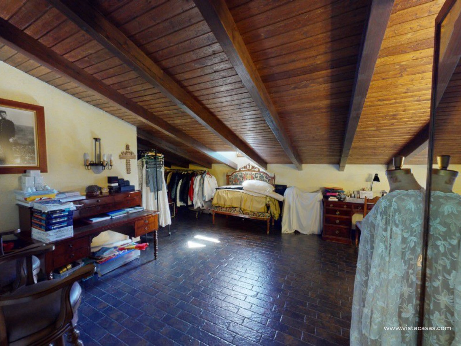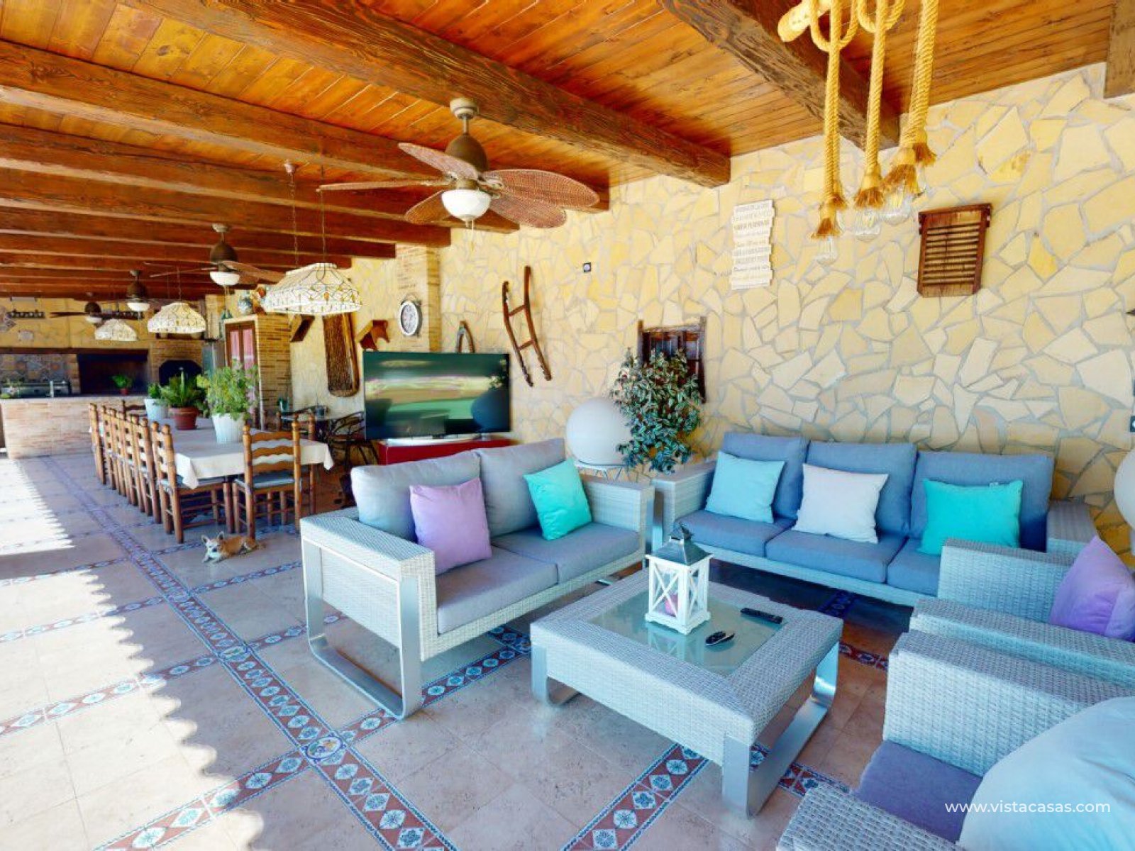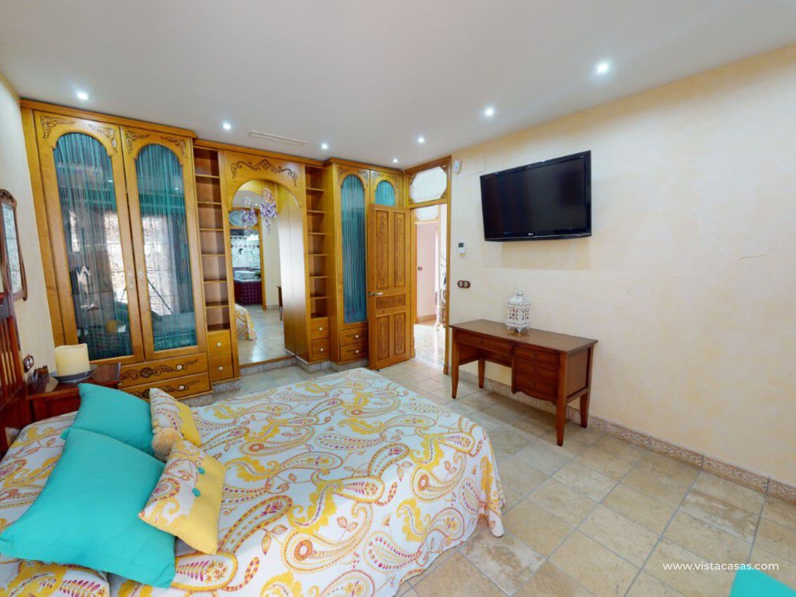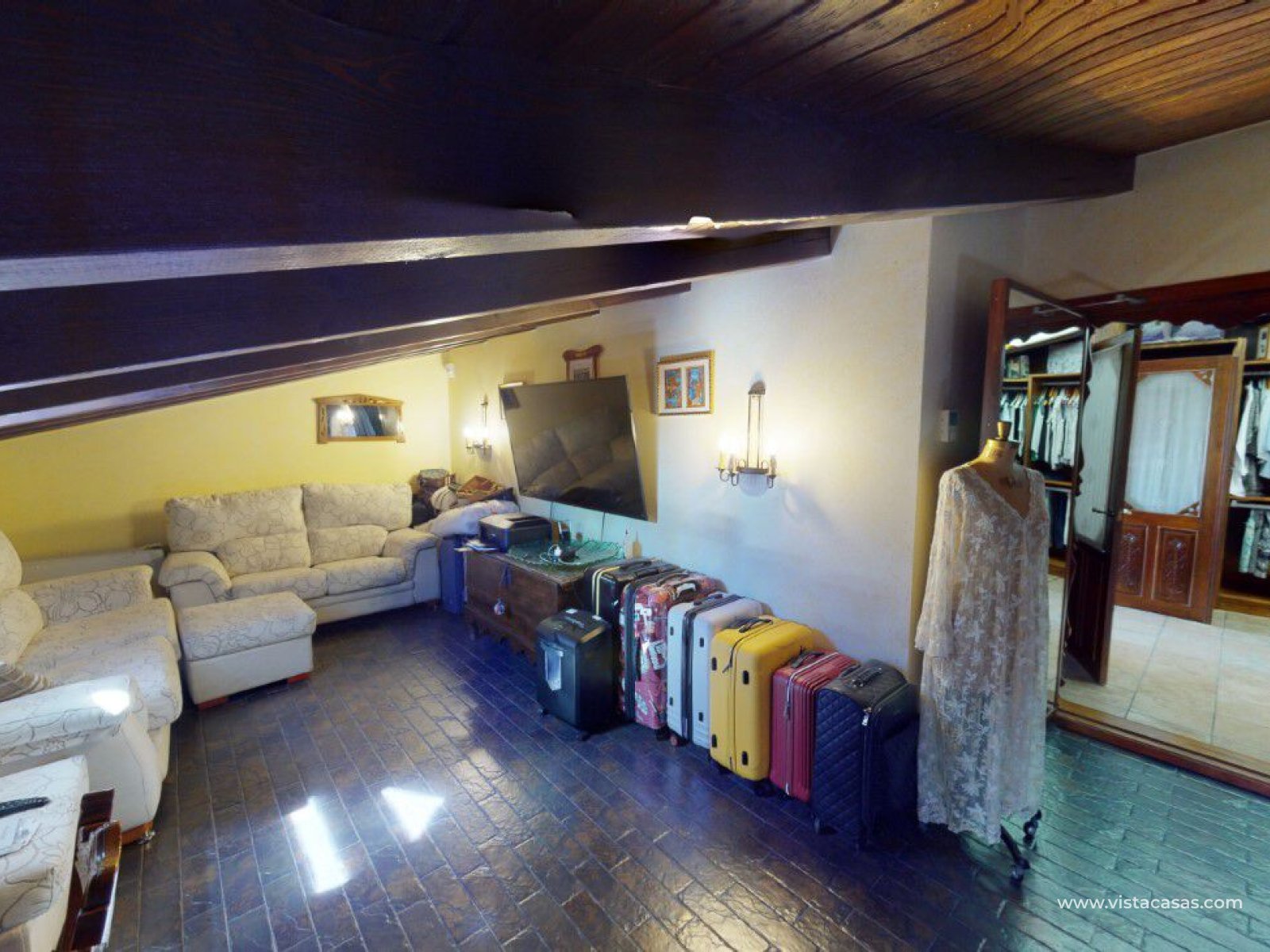 Phenomenal detached villa with a construction size of almost 500m 2 and a private pool on a plot of approximately 7,000m 2 . This detailed and well maintained gem of a property was designed by the current owners with all of the home's features carefully chosen to best represent the beautiful architecture. Entering the main entrance hallway, a handmade floor design is presented to replicate a hallway from an old Andalusian palace. The ground floor offers 3 large bedrooms, all of them with surprising private bathrooms. Further down, a bright and spacious living room with high quality craftsmanship including a fireplace built around an original Galician piece. Also a dining room, a bathroom (toilet and sink) and a fully equipped open plan kitchen with a large pantry. The first floor offers the master bedroom. The entire floor is dedicated to this room and is divided into 5 areas; The first of which is a living room with a beautiful wall with beautiful views of the Orihuela mountain range, a floating wall TV, a private bathroom with separate bath and shower, a dressing room with plenty of storage space and a safe room! The safe room door is undetectable when closed and its handle is in a secret location for your maximum security. The house itself was raised one and a half meters, thus avoiding humidity and its structure is anti-seismic. All doors are handmade, glass windows are custom designed (which future owners may have changed), all blinds are electric and the property also features marble floors with underground heating, air, CWC windows and Solar panels over the outdoor kitchen producing 13.6kw of electricity. Its privileged exterior of more than 7,000m 2 is divided into 3 main areas; A large terrace accessed through the kitchen door consisting of a laundry room and a large storage room with all large electronic devices to keep the noise level inside to a minimum. A private swimming pool (6m x 12m) with jacuzzi and slide, an external building with storage room, bathroom and a large shower room for the pool, a fully equipped outdoor kitchen with barbecue, a large dining room, a fountain and a driveway with Electric entry gates leading to a garage with space for 3 large vehicles. Finally, the property comes with around 6,500m2 of various orchards and right next to the property there is a stream which the owners use to water the orchard for free. If you would like to see the property in more detail, we have a 360° video tour below. Or call, book a showing with one of our agents and find the home of your dreams today!