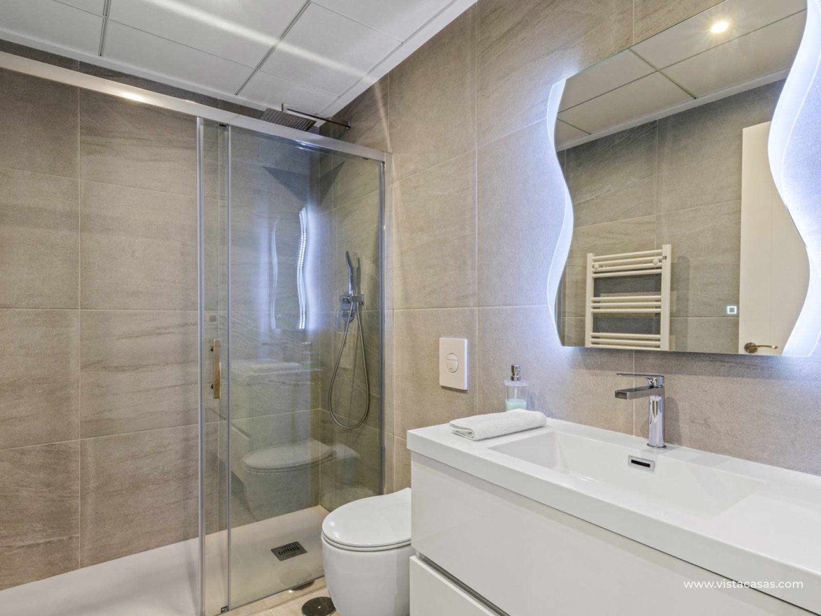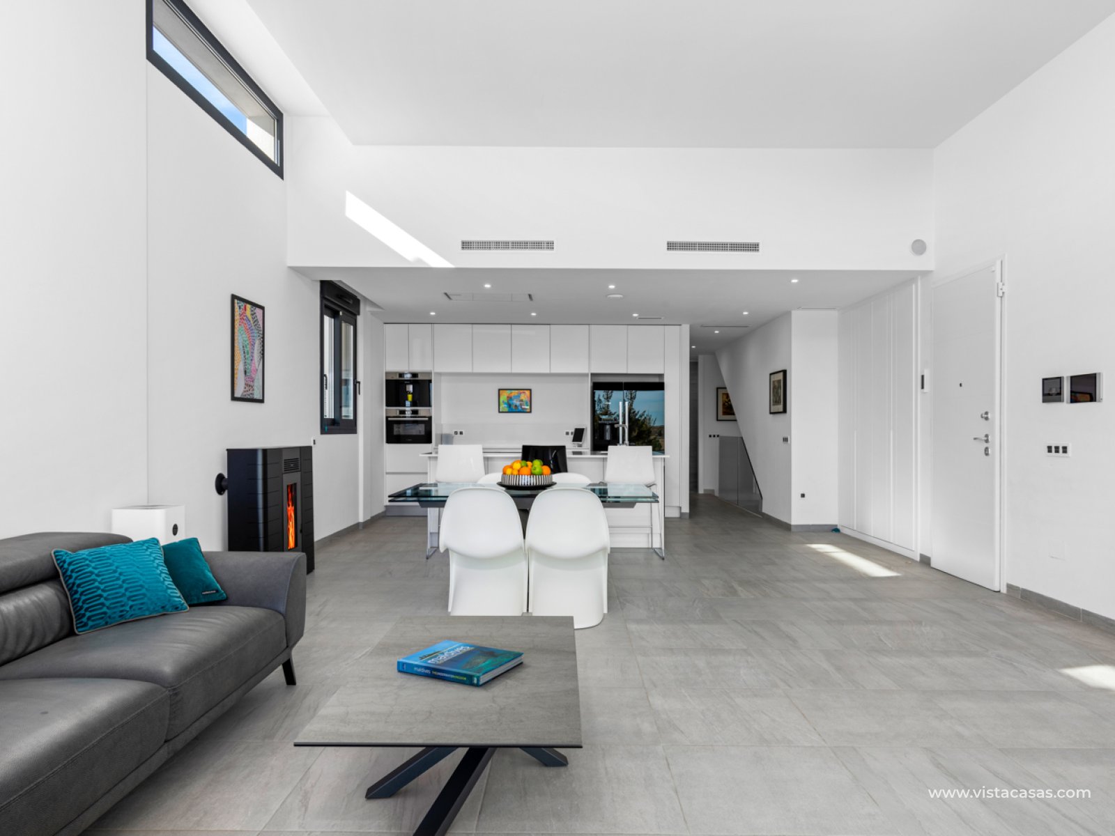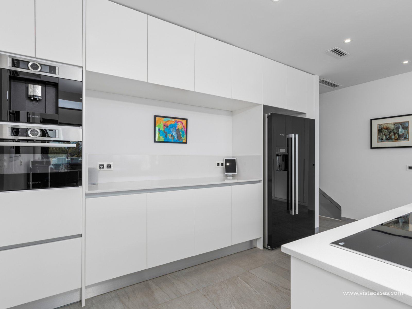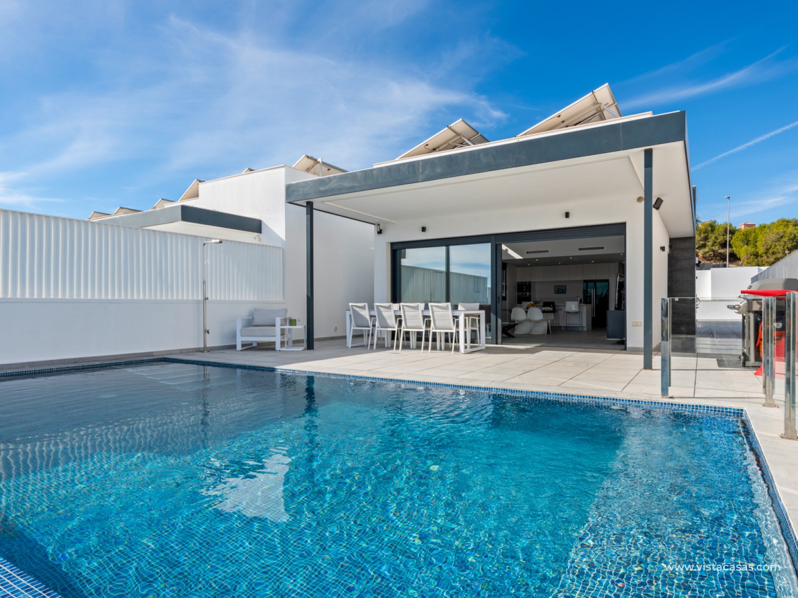 Estamos orgullosos de presentar esta exclusiva villa independiente de alta gama con espectaculares vistas ininterrumpidas al mar.¡Si usted está buscando una casa que es de alta tecnología y caminar en listo, a continuación, reservar su visita a esta propiedad increíble hoy!Al entrar en la villa directamente en el plan abierto de cocina / sala de estar se dará cuenta de inmediato lo luminoso y espacioso que es. El salón de 60m ² tiene un techo elevado de 3,5 m y tiene grandes puertas correderas panorámicas en la parte trasera, lo que le permite disfrutar plenamente de las impresionantes vistas al mar. Las puertas conducen a una gran terraza y la hermosa piscina climatizada con cubierta eléctrica. En la parte trasera de la piscina hay una acogedora terraza donde se puede tomar el sol hasta que se ponga. De vuelta al interior de la cocina moderna y elegante que se sorprenderá por la tecnología de esta villa tiene. Todos los electrodomésticos son de alta gama y se pueden controlar con el teléfono a través de WiFi Home Connect. Esto incluye el horno, el microondas, el lavavajillas, la placa de inducción, la campana extractora e incluso la cafetera. Todos los electrodomésticos integrados se mantendrán. Incluso hay un enchufe oculto en la isla. Junto a la puerta principal hay armarios ocultos, ideales para abrigos, zapatos y mucho más.A medida que continuamos explorando este nivel se encuentra un gran aseo independiente totalmente alicatado y el dormitorio principal luminoso con un gran vestidor y un elegante baño principal con doble lavabo y ducha acristalada. Grandes puertas correderas en el dormitorio principal conducen al jardín trasero con una zona de asientos con césped.Al bajar las escaleras, se llega inmediatamente a la segunda sala de estar, que actualmente se utiliza como un gimnasio en casa y zona de juegos para los niños. Las puertas del patio conducen a una zona de patio encantador que también se accede a través de todas las habitaciones. En este nivel hay otros 3 dormitorios fabulosos para explorar. El primero se utiliza actualmente como una amplia oficina. El siguiente dormitorio tiene armarios empotrados, puertas que dan al patio y un moderno cuarto de baño. El último dormitorio es una hermosa suite, comparable a una habitación de hotel de 5 estrellas, con un sinfín de armarios empotrados, un precioso baño con bañera independiente y ducha, así como las puertas del patio de la habitación que conduce al patio antes mencionado.Pero eso no es todo lo que hay aquí abajo, que conduce fuera de la sala de estar es una muy amplia lavandería y cuarto de servicio que también da acceso a un trastero enorme. En toda la casa hay aire acondicionado frío y caliente que se puede controlar en 5 zonas diferentes de aire Daikin por los paneles de control o por su teléfono.Esta impresionante villa tiene aún más que ofrecer: Top de la línea de descalcificador de agua se ha instalado en todo, incluyendo la piscina. La sala de estar del nivel principal tiene un calentador de pellets para ayudar a crear esas noches más acogedoras. Hay mosquiteras y persianas eléctricas en toda la propiedad. Todos los baños tienen radiadores, calefacción por suelo radiante y extractores. La puerta eléctrica conduce a la entrada privada con aparcamiento para 3 coches y un nuevo cargador de coche eléctrico sin usar. La puerta peatonal tiene un video timbre con abrepuertas interno. Arriba en el 60m2 solarium se encuentran 22 paneles solares. Nueva valla de privacidad se ha instalado para garantizar la privacidad. Iluminación exterior y 5 puntos de cámaras de seguridad alrededor de la propiedad.¡Esta villa de lujo está realmente lista para entrar y está esperando para sorprenderle!Esta impresionante villa se encuentra a menos de 5 minutos en coche de la vibrante ciudad de San Miguel de Salinas, donde se pueden encontrar todas las comodidades que usted requiere. Colegios españoles, centro m.