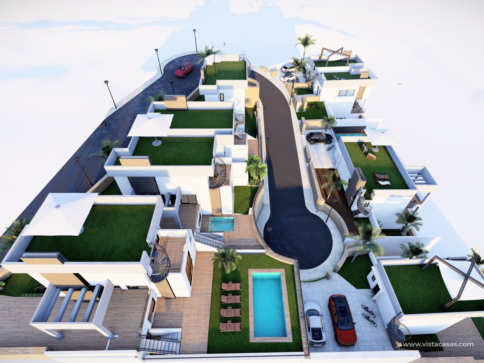 En el exterior, cada propiedad cuenta con una piscina privada, perfecta para disfrutar del sol mediterráneo en la intimidad de su hogar. Las pérgolas no solo aportan un toque estético sino que también ofrecen un espacio sombreado ideal para relajarse al aire libre. Algunas viviendas incluso incluyen un jacuzzi, proporcionando un refugio adicional para el relax y bienestar personal. Las amplias terrazas son perfectas para reuniones con familiares y amigos, mientras que los soláriums disponibles en algunas tipologías permiten disfrutar de las vistas panorámicas del entorno.