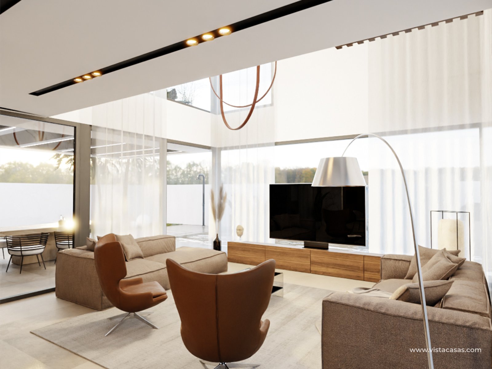 El interior de la villa destaca por su enfoque en la comodidad y el estilo contemporáneo. Los suelos de gres porcelánico no solo aportan un toque moderno, sino que también son fáciles de mantener, haciendo del día a día una experiencia sencilla y agradable. La cocina está equipada con electrodomésticos de alta gama, lo que facilita tanto la preparación de comidas como el entretenimiento. Además, los armarios empotrados en los dormitorios ofrecen un amplio espacio de almacenamiento, manteniendo el orden y la estética. Un sistema de calefacción por suelo radiante asegura que cada estancia se mantenga cálida y acogedora durante los meses más fríos, mientras que el jacuzzi proporciona un espacio adicional para la relajación dentro del hogar.