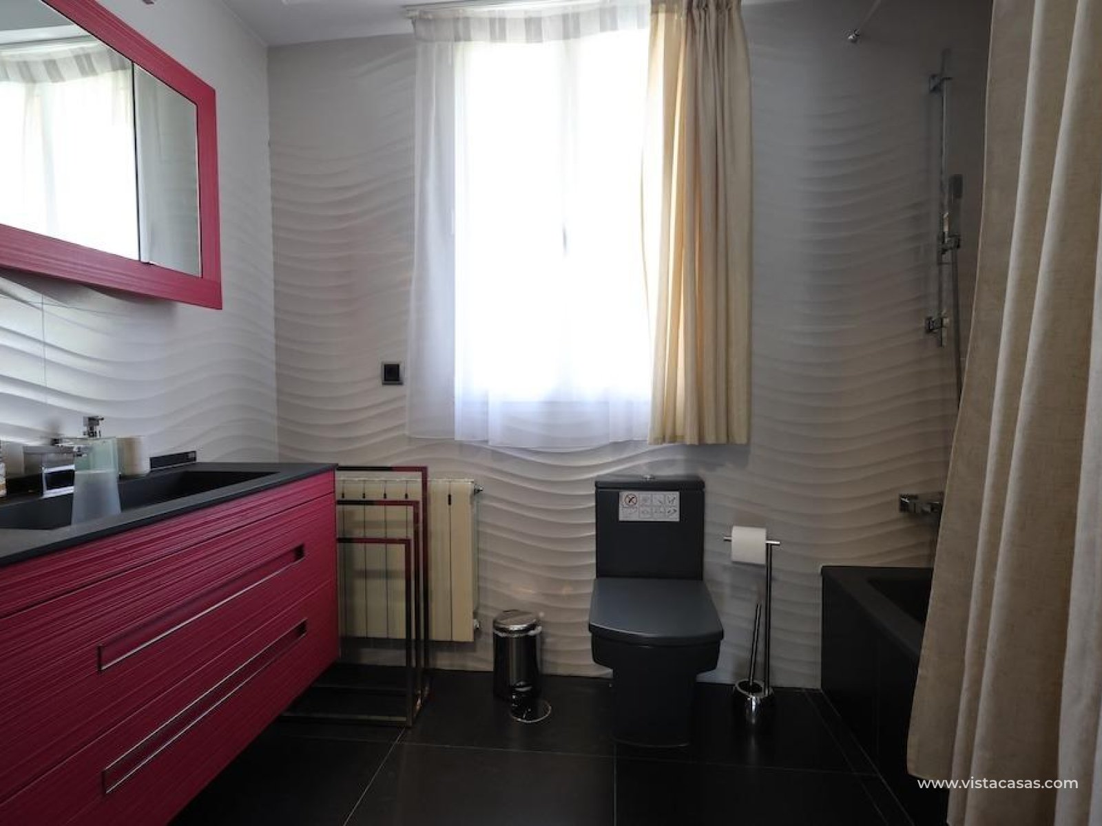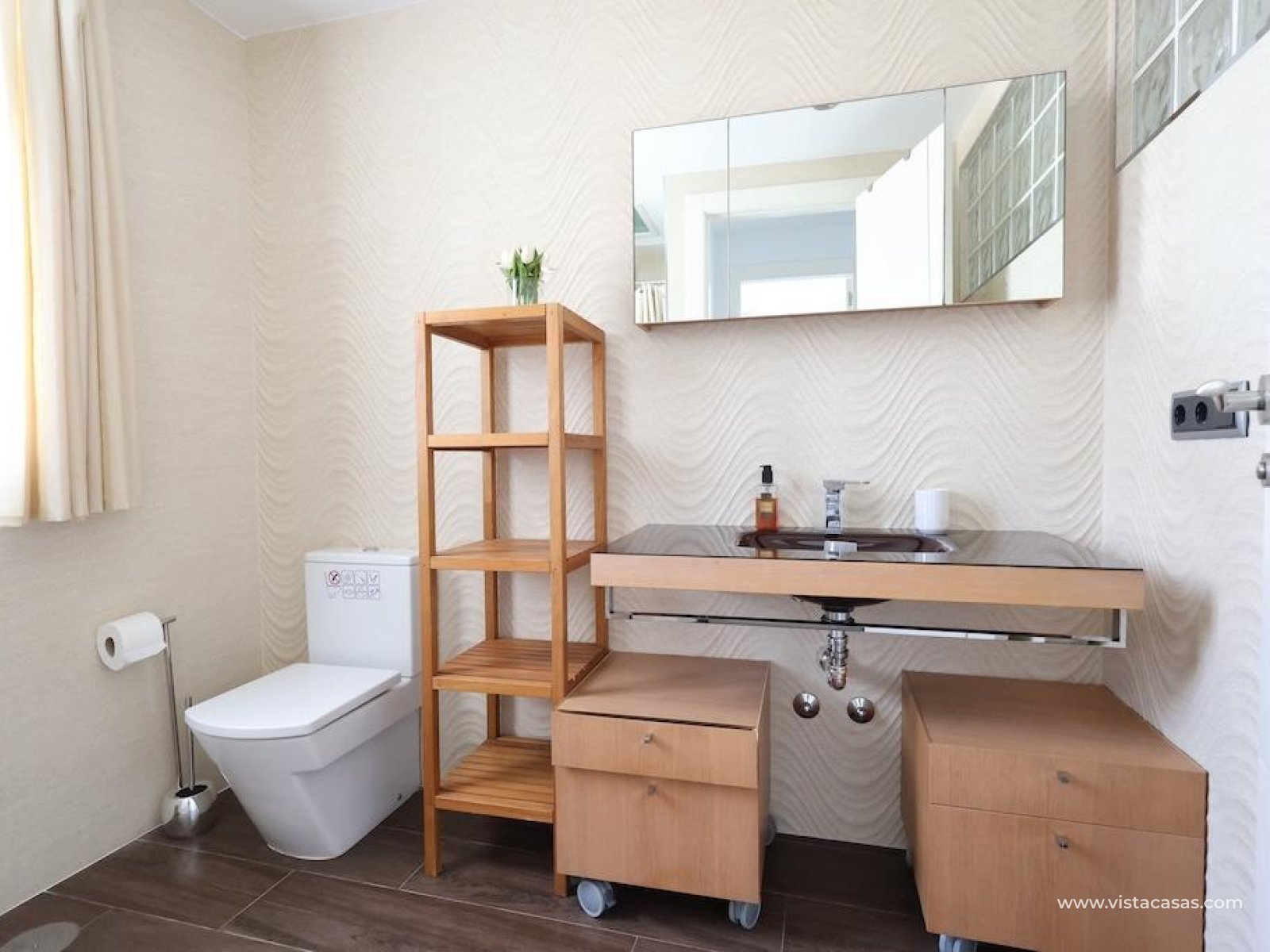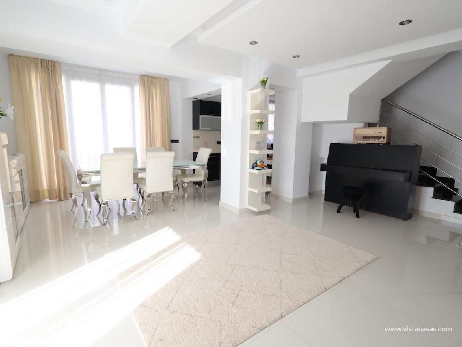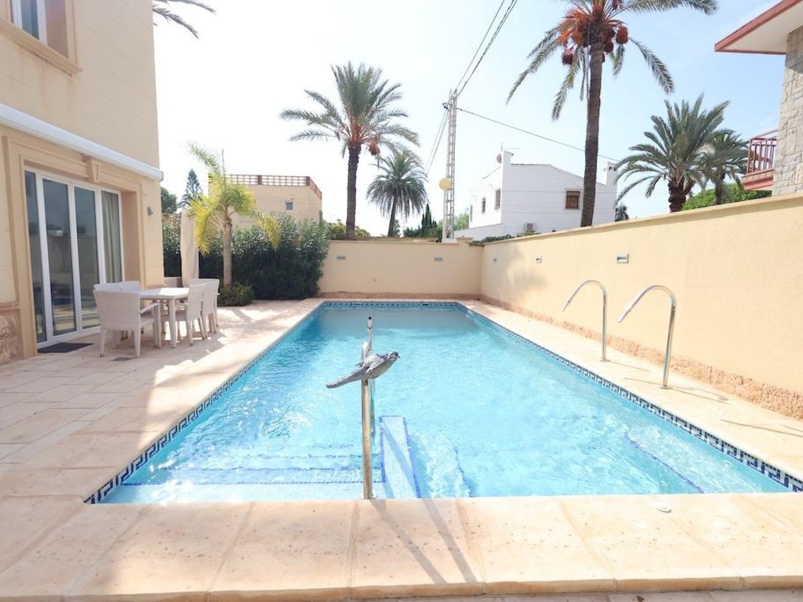 Cabo Roig Chalet independiente en parcela de 415 m2 en esquina a dos calles. . Moderna vivienda de 222 m2 distribuidos en dos plantas, que ofrece un diseño contemporáneo y funcional. Cuenta con 4 amplios dormitorios y 3 baños, un luminoso salón-comedor con cocina semi-integrada, piscina privada, entrada para vehículo y un gran solárium privado ideal para disfrutar del sol durante todo el año. . Se vende completamente amueblado y equipado con aire acondicionado. Ubicado en una de las zonas más exclusivas de la costa.