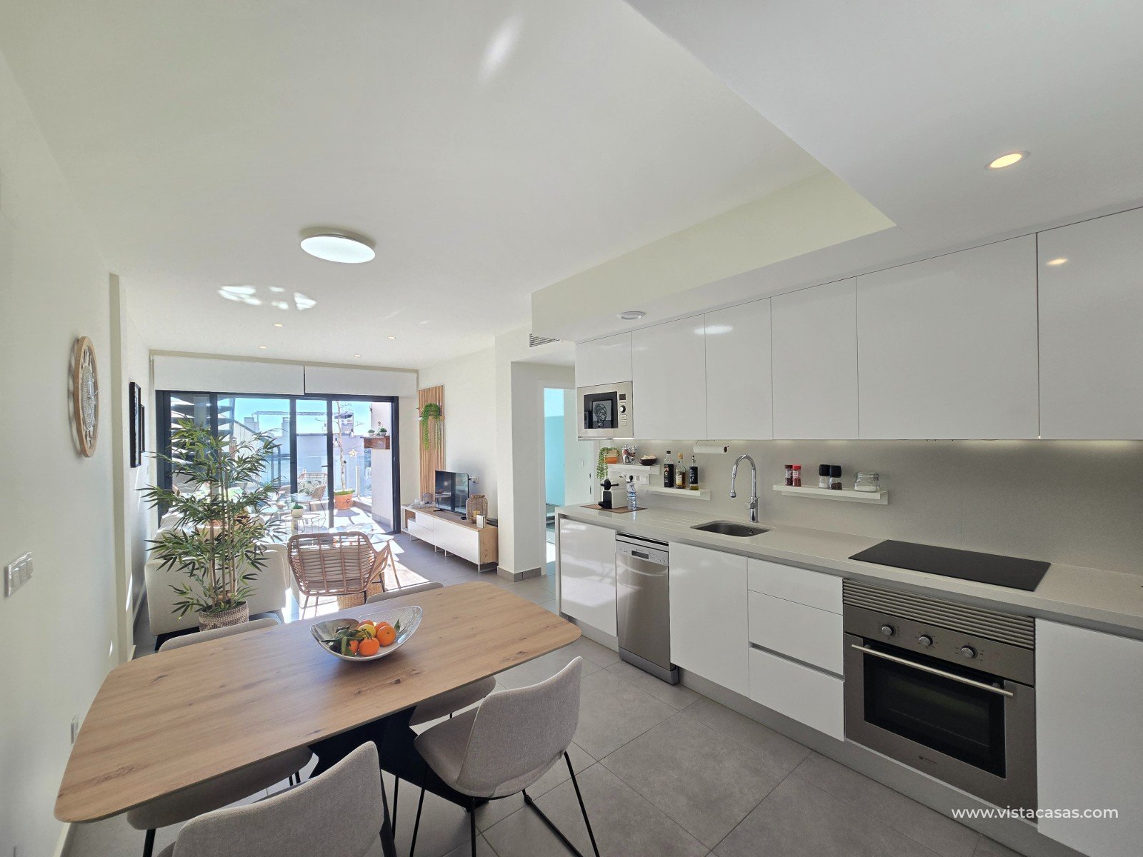 Descubra este excepcional ático orientado al sur con impresionantes vistas al mar y a la montaña, situado en una urbanización joven y perfectamente cuidada cerca del campo de golf de Villamartín. La joya de la corona es el amplio solárium, equipado con una cocina exterior totalmente equipada, un comedor y una zona de descanso y terrazas donde se puede disfrutar de la luz, la tranquilidad y las vistas panorámicas durante todo el día. En el interior, una luminosa y espaciosa sala de estar con cocina abierta le da la bienvenida en un ambiente moderno y acogedor. El ático cuenta con dos dormitorios y dos baños, uno de ellos en suite, diseñados con materiales de alta calidad y una distribución práctica. Encontrará comodidad adicional en el aparcamiento subterráneo (con preinstalación para coche eléctrico) y dos trasteros independientes, ideales para almacenamiento adicional. La urbanización en sí ofrece una amplia gama de instalaciones: dos piscinas, un jacuzzi, un gimnasio al aire libre, una pista de petanca, un parque infantil para los más pequeños y zonas comunes maravillosamente ajardinadas. Además, todo se encuentra a poca distancia a pie de bares, restaurantes y otros servicios, por lo que el descanso y la comodidad están siempre al alcance de la mano. Como extras, la vivienda cuenta con toldos, pantallas de viento, descalcificador de agua + OSMOSIS y se vende completamente amueblada. Este ático combina una vida lujosa, comodidad y una ubicación privilegiada en la Costa Blanca, perfecto como residencia permanente, casa de vacaciones o inversión. ¡No lo dude y reserve una visita rápidamente! Suma: 249 euros/año. Gastos de comunidad: 920 euros/año.