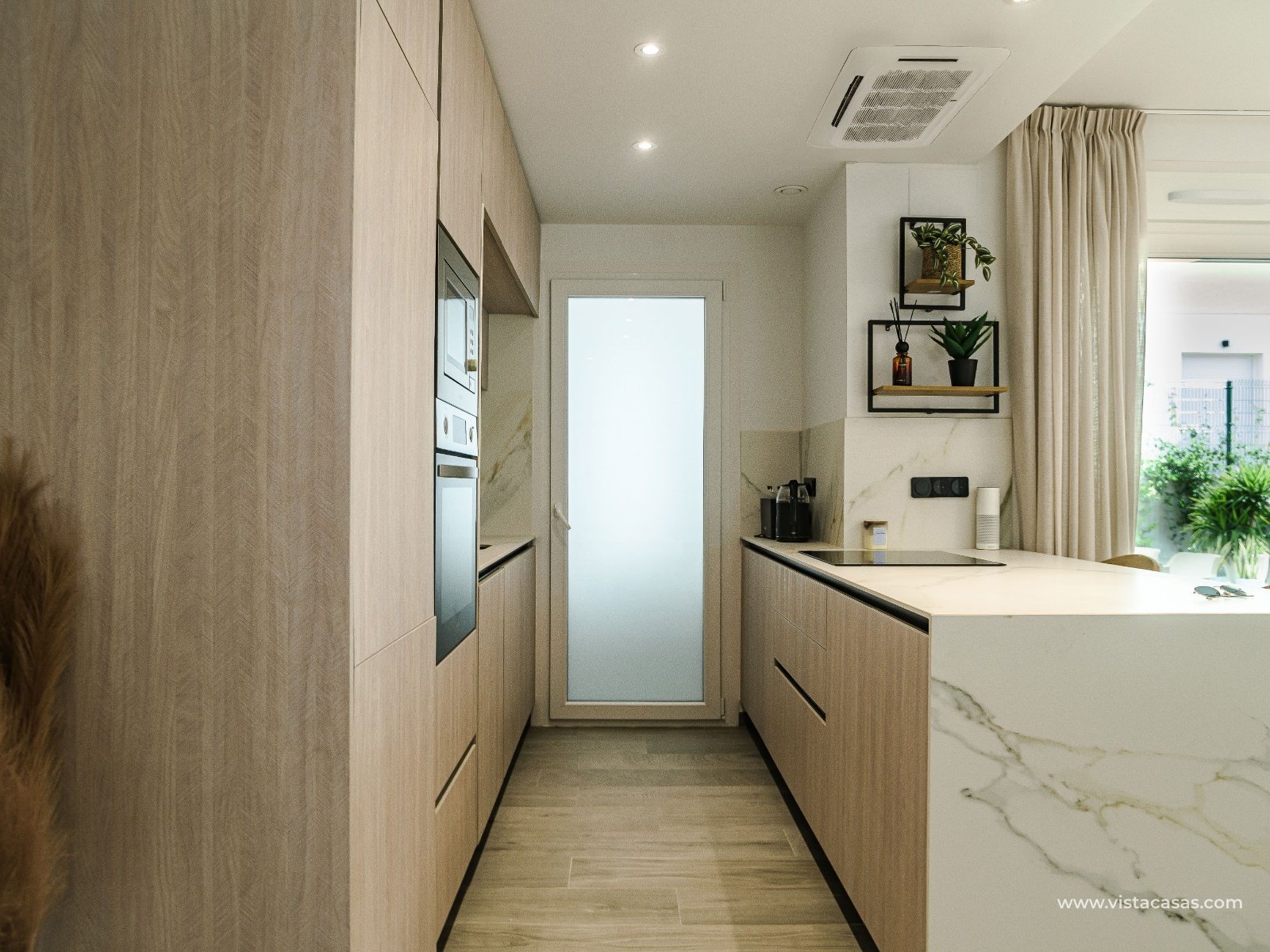 La cuisine, au design moderne et épuré, est réalisée avec des matériaux de haute qualité et offre tout le confort et la fonctionnalité nécessaires. Grâce à son aménagement ouvert et son élégant bar, elle crée un espace de vie spacieux, idéal pour recevoir ou se détendre.