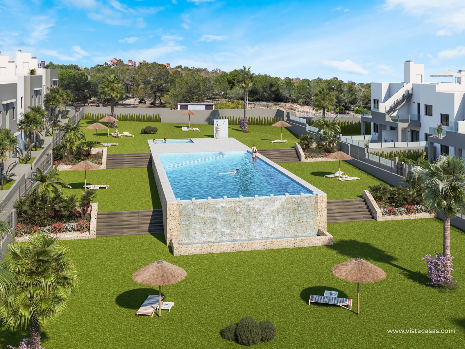 Chaque bungalow est conçu pour offrir un maximum de confort et de modernité. Les intérieurs disposent de sols en carrelage en porcelaine qui ajoutent non seulement une touche d'élégance, mais qui sont également faciles à entretenir. Les logements sont équipés de placards intégrés, offrant un espace de rangement généreux. De plus, la pré-installation de la climatisation garantit un environnement toujours agréable, tandis que le vidéophone ajoute une couche supplémentaire de sécurité et de confort. La disposition comprend deux chambres et deux salles de bains, s'adaptant parfaitement aux besoins de différents types de familles ou de couples.