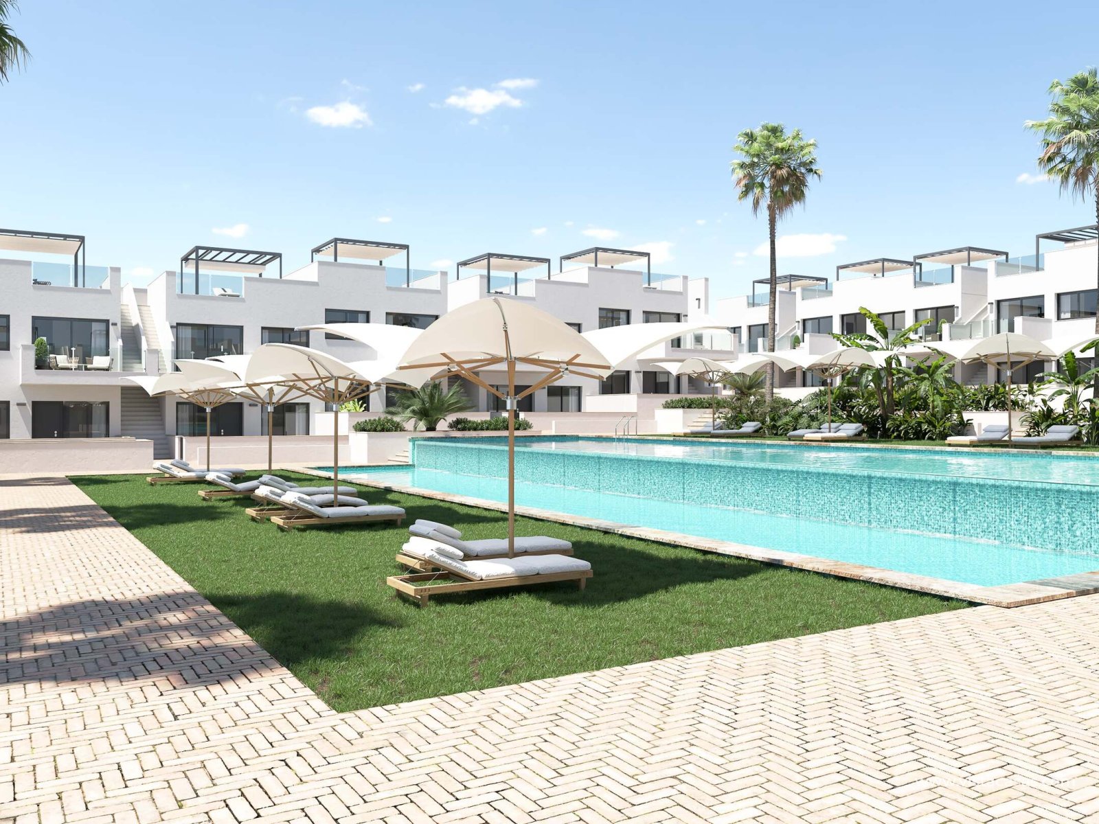 De buitenruimtes blijven niet achter, elke woning beschikt over een privéterras, perfect om te genieten van het mediterrane klimaat of om te ontspannen met een diner buiten. De high-bungalow woningen bieden bovendien een privé-solarium, ideaal om te zonnen of van het uitzicht te genieten. De gemeenschappelijke tuinen completeren de omgeving en bieden een groene ruimte om te wandelen of te ontspannen, terwijl de nabijheid van de zee de mogelijkheid biedt om te genieten van de zeebries en aangename wandelingen langs de kust.