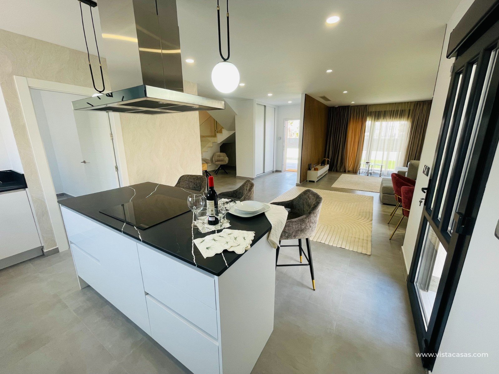 Het interieur blijft niet achter in termen van kwaliteit en design. De vloeren van porseleinen tegels voegen een moderne en elegante toets toe, terwijl het vloerverwarmingssysteem zorgt voor een warme sfeer tijdens de koudere maanden. Het huis is ook uitgerust met airconditioning, wat het hele jaar door maximaal comfort garandeert. De inbouwkasten bieden praktische en efficiënte opbergruimte, waardoor de ruimtes opgeruimd en georganiseerd blijven.