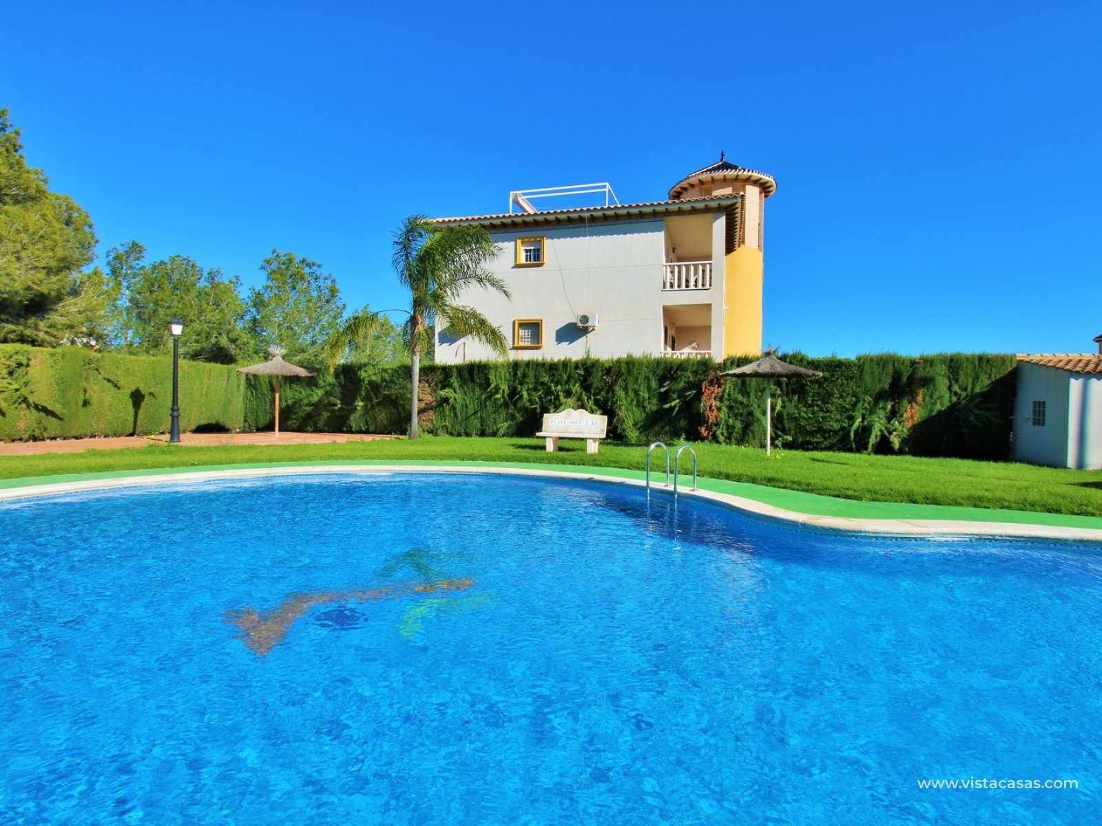 Dit uitstekend onderhouden en instapklare penthouse appartement is gelegen in de populaire Playa Golf II R5 residentie in Lomas de Cabo Roig. Het betreft een zuidgericht hoekappartement met veel natuurlijk licht en mooi uitzicht op het gemeenschappelijke zwembad, dat zich direct naast het appartement bevindt.