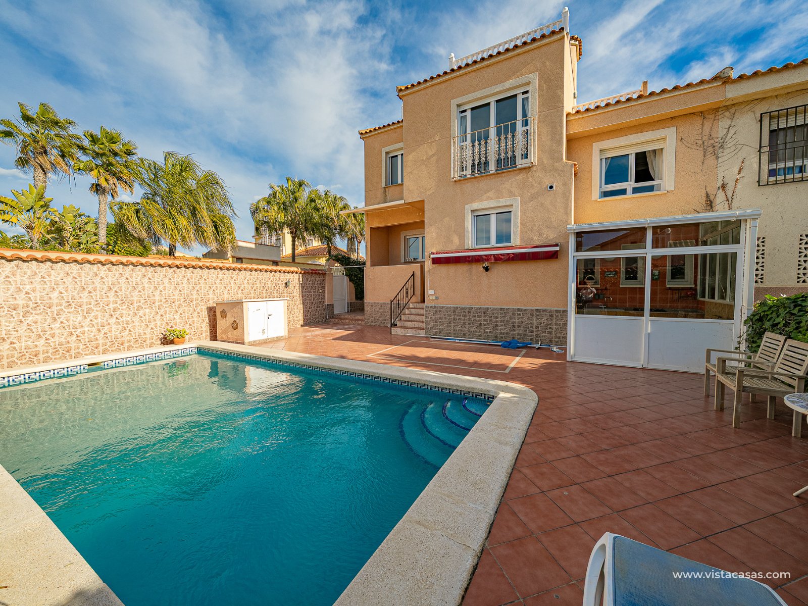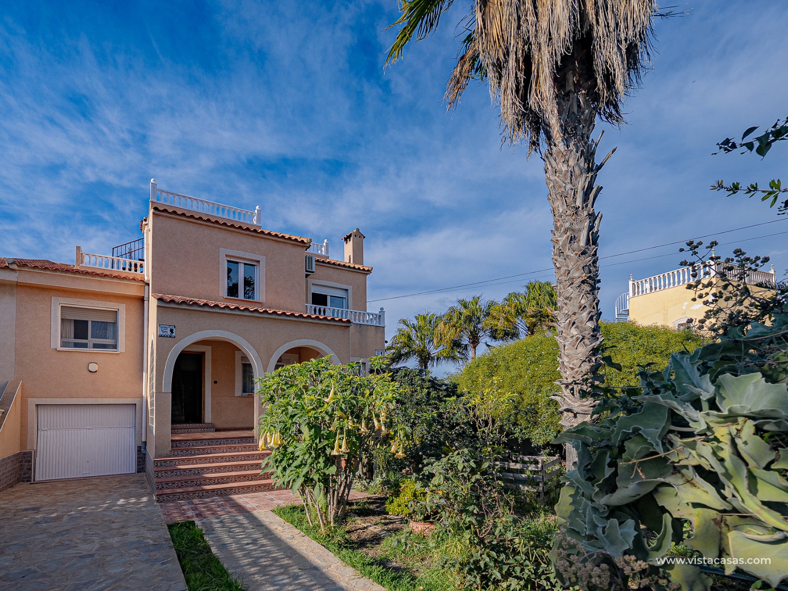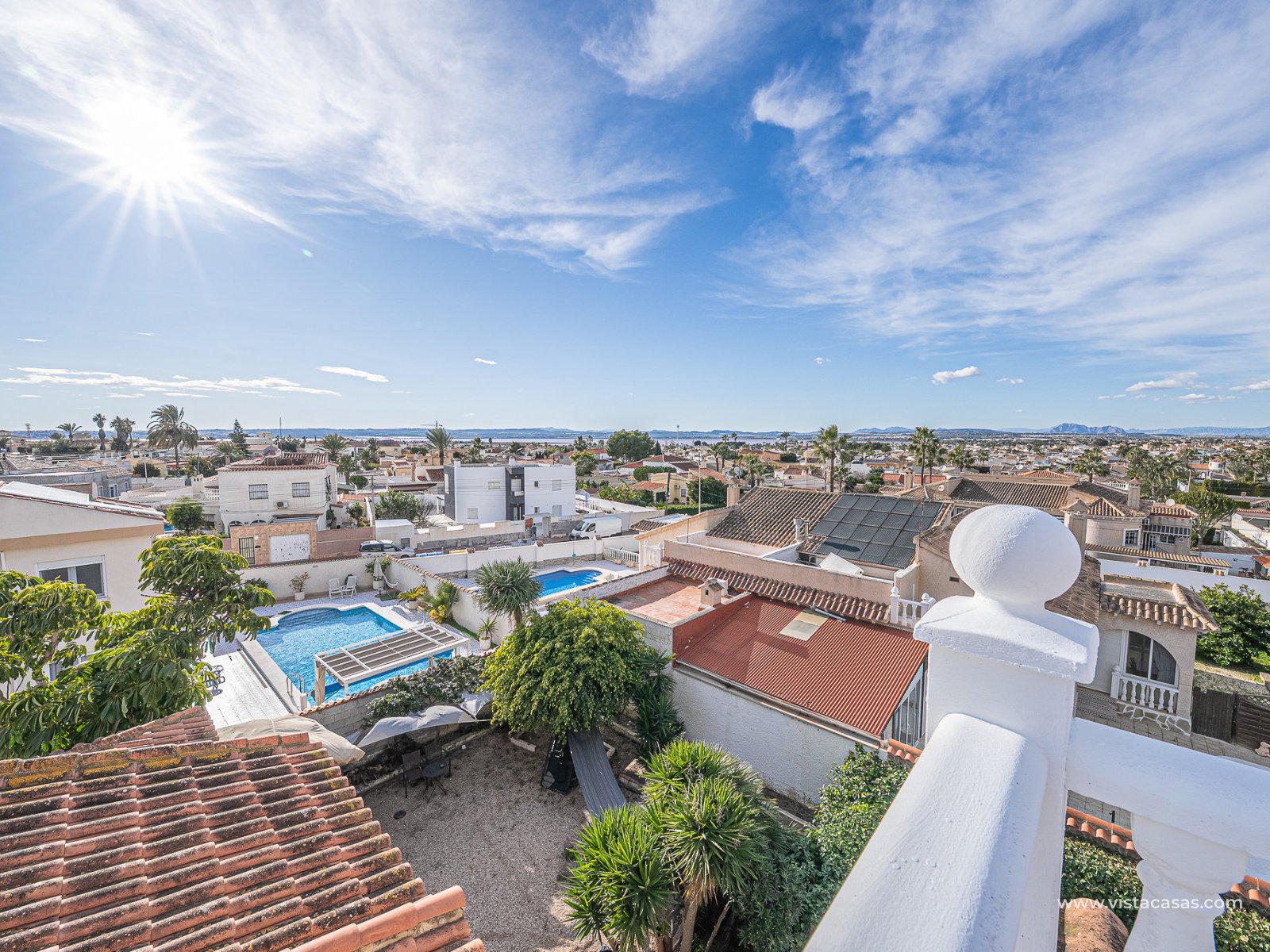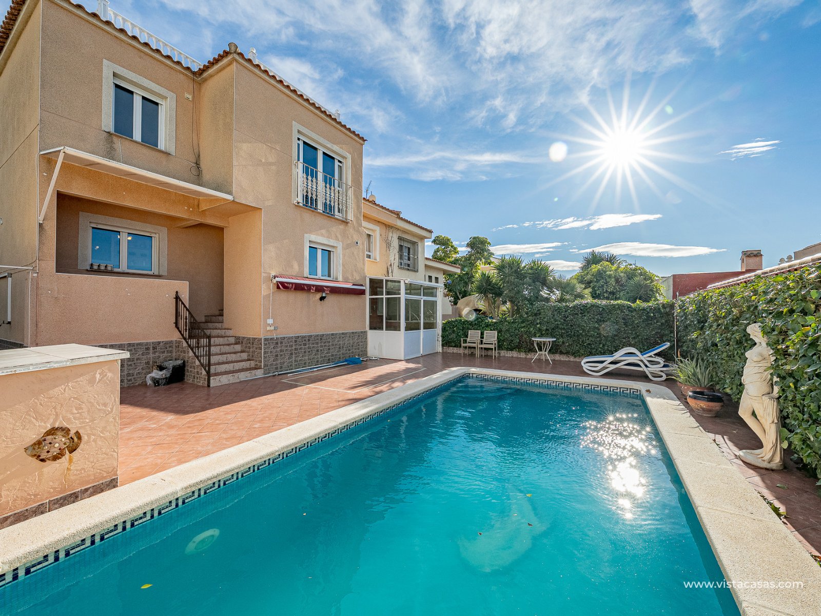 Deze goed onderhouden halfvrijstaande villa is gelegen aan de rand van Torrevieja, in de gevestigde woonwijk El Chaparral, nabij de prachtige zoutmeren. De woning heeft een totale bebouwde oppervlakte van 187,25 m², verdeeld over meerdere niveaus, en is gelegen op een royaal perceel van 411 m². De villa beschikt over vier slaapkamers, waarvan één momenteel wordt gebruikt als studeer- of thuiskantoor. De hoofdslaapkamer is voorzien van een inloopkast en de woning biedt drie badkamers, waarvan één met jacuzzi. De leefruimte bestaat uit een ruime woonkamer, een aparte eetkamer en een aparte keuken, uitgerust uitsluitend met een kookplaat en vaatwasser, met een aangrenzende bijkeuken. Een ruime kelderverdieping biedt waardevolle extra ruimte en beschikt over een extra badkamer en uitgebreide opslagmogelijkheden. Deze veelzijdige ruimte kan eenvoudig worden aangepast voor diverse doeleinden, zoals een fitnessruimte, bioscoopkamer, speelkamer of extra gastenverblijf. Buiten beschikt de woning over een zuidoostelijk georiënteerd terras, een privé zoutwaterzwembad van 8 × 4 meter, een zomerkeuken met barbecuegedeelte, goed onderhouden tuinen, dakterrassen aan de voor- en achterzijde, en een grote garage met extra parkeergelegenheid op eigen terrein. De villa wordt verkocht zoals gezien en is voorzien van airconditioning in de woonkamer en hoofdslaapkamer, gasgestookte vloerverwarming, marmeren vloeren in de gehele woning en een waterfiltersysteem voor het hele huis. El Chaparral is een populaire woonwijk met een breed aanbod aan lokale voorzieningen, waaronder bars, restaurants, supermarkten, apotheek, medisch centrum en banken, allemaal op loopafstand. Het centrum van Torrevieja en de stranden liggen op ongeveer vijf minuten rijden. Voor meer informatie of om een bezichtiging te plannen, neem gerust contact op met Inmo Investments.