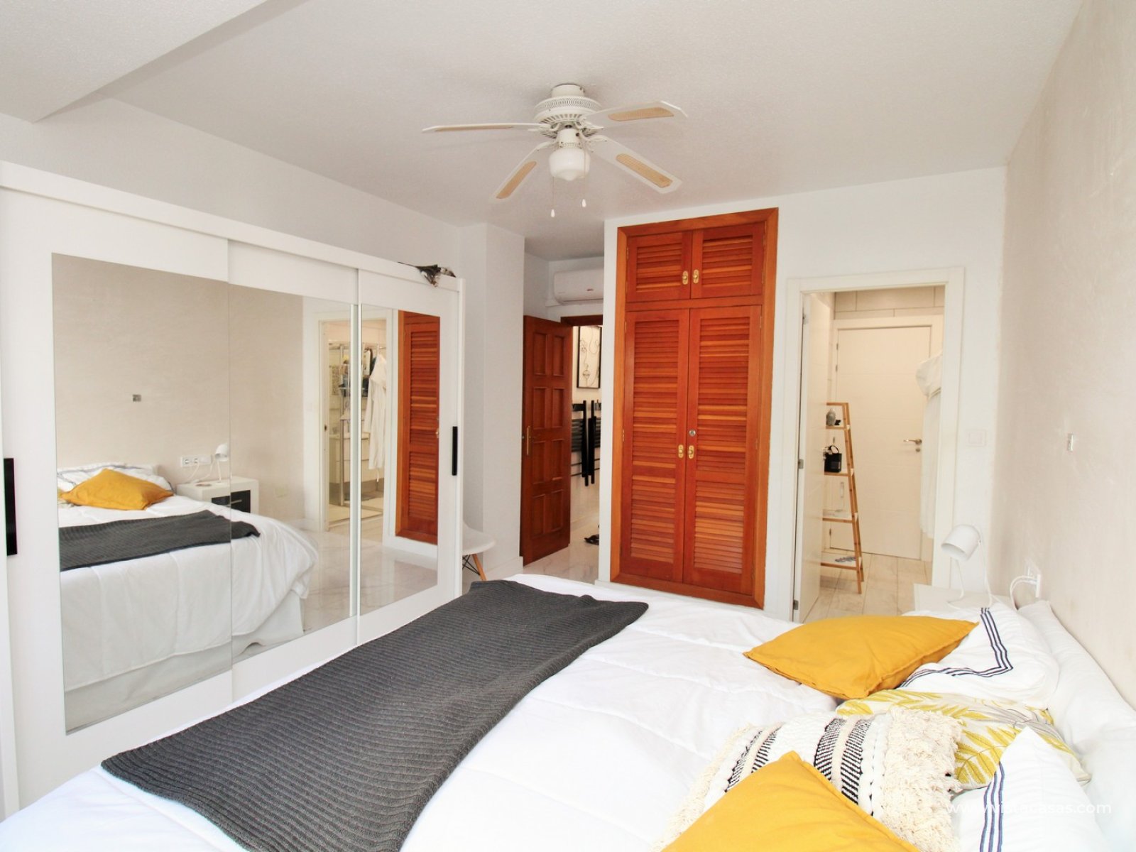 De woning beschikt tevens over een royale hoofdslaapkamer met ingebouwde kasten en een gerenoveerde badkamer met praktische toegang vanuit zowel de woonkamer als de slaapkamer.
