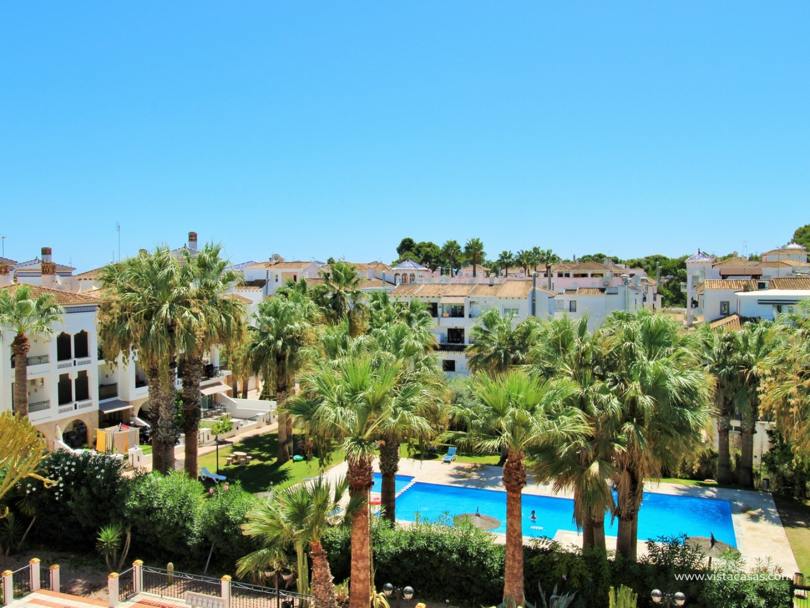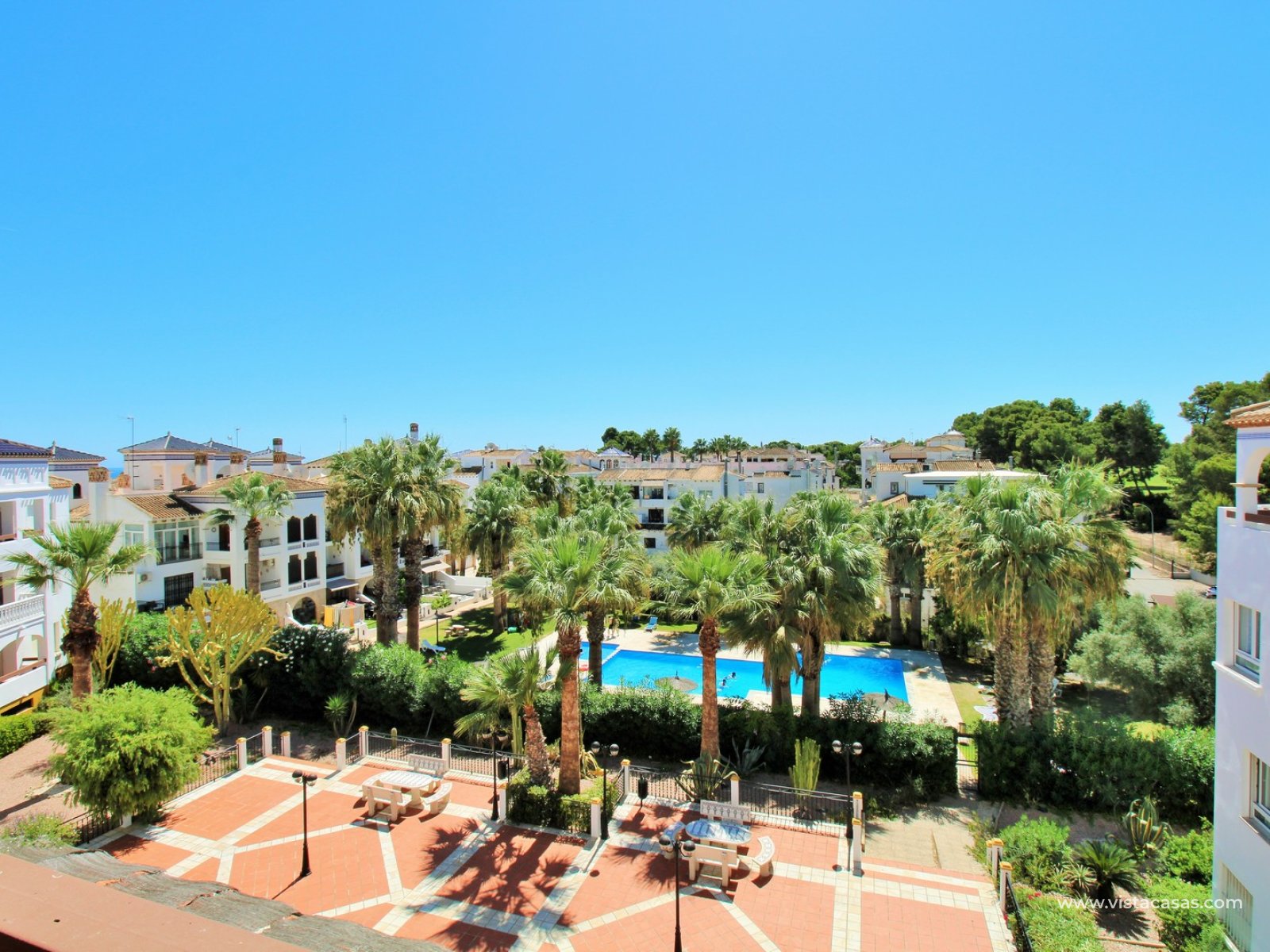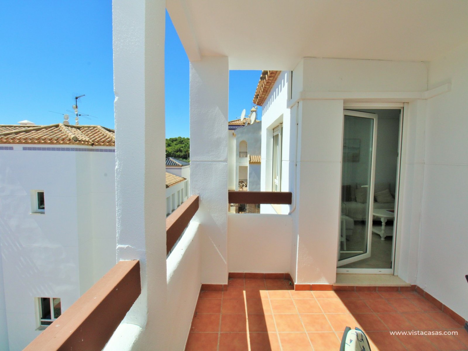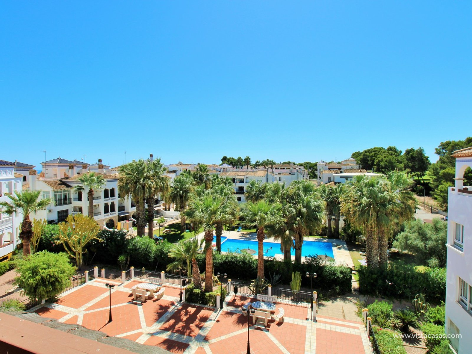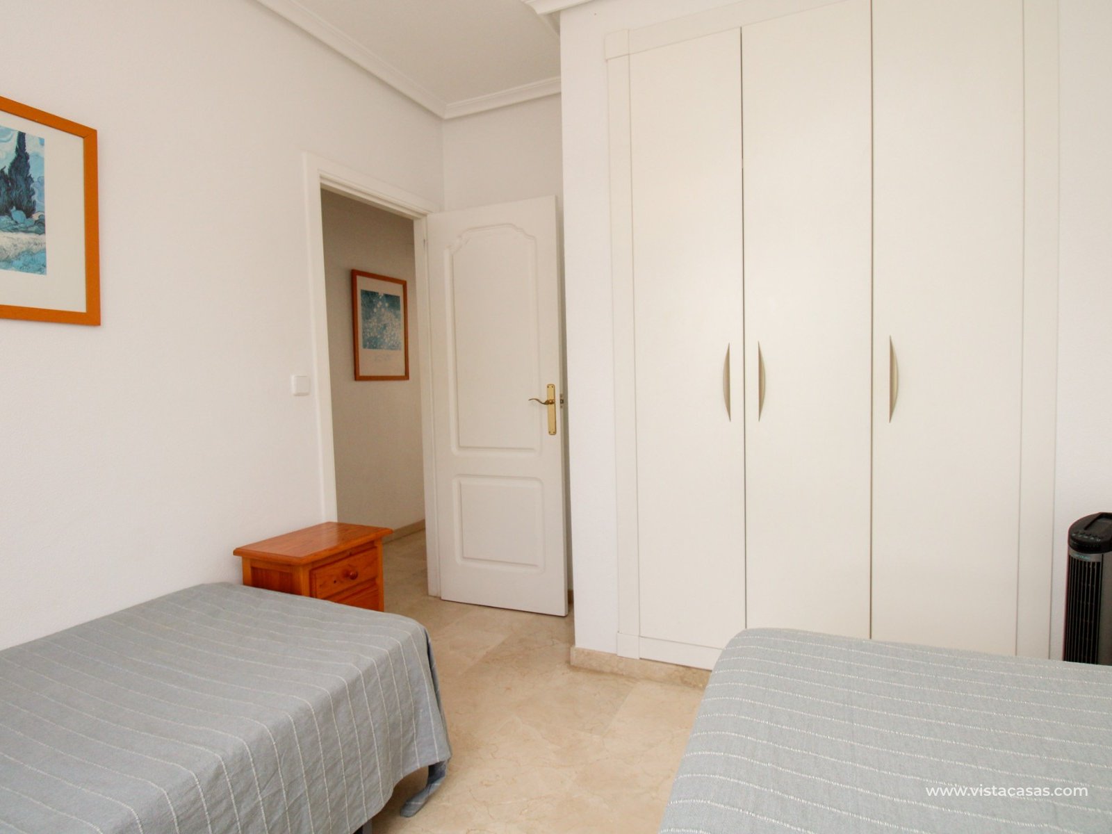 Nieruchomość składa się z holu wejściowego prowadzącego do jasnego i przestronnego salonu z jadalnią i otwartą kuchnią w stylu amerykańskim. Zadaszony balkon frontowy, dostępny zarówno z salonu, jak i głównej sypialni, wychodzi na wspólny basen. Główna sypialnia posiada wbudowane szafy i łazienkę z kabiną prysznicową. W tylnej części apartamentu znajduje się sypialnia gościnna z dwoma łóżkami, również z wbudowanymi szafami, oraz łazienka rodzinna. Jako narożny penthouse, nieruchomość oferuje dodatkowe naturalne światło i poczucie większej przestrzeni.