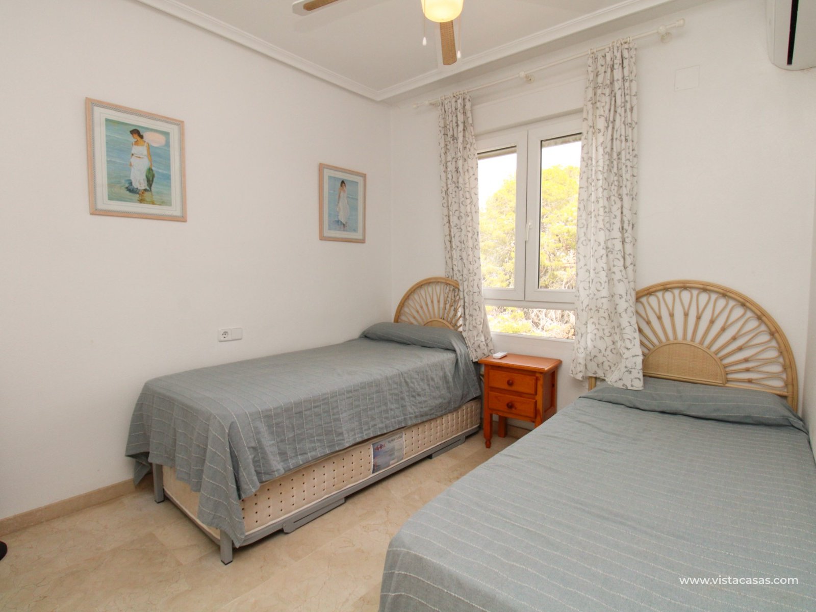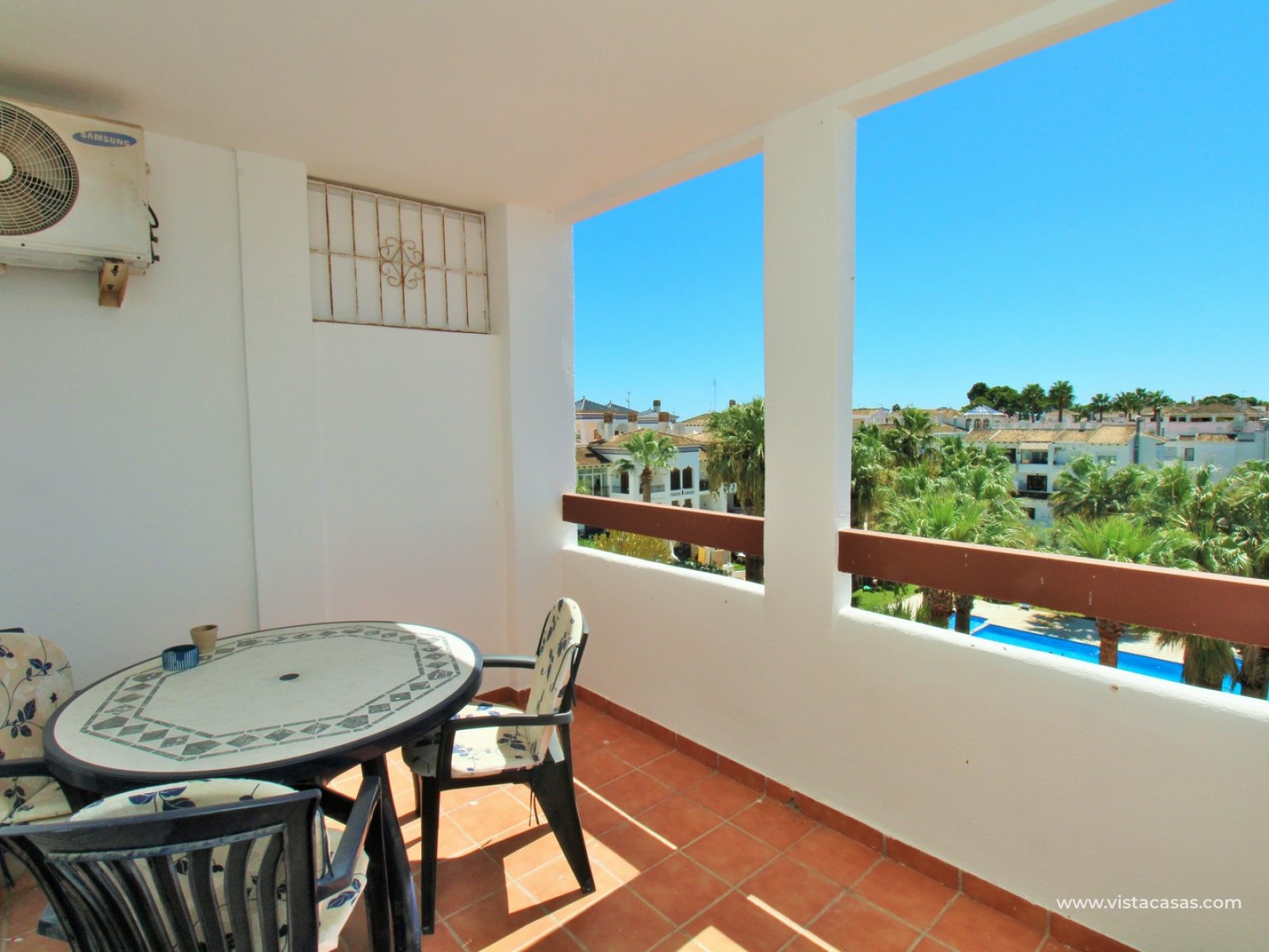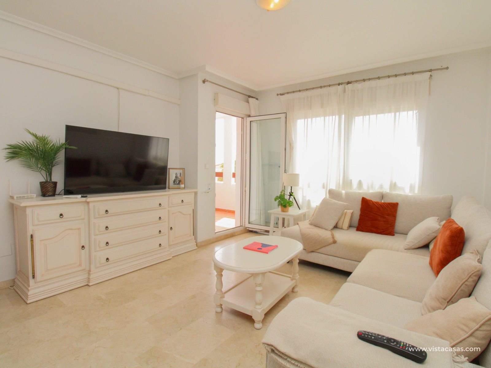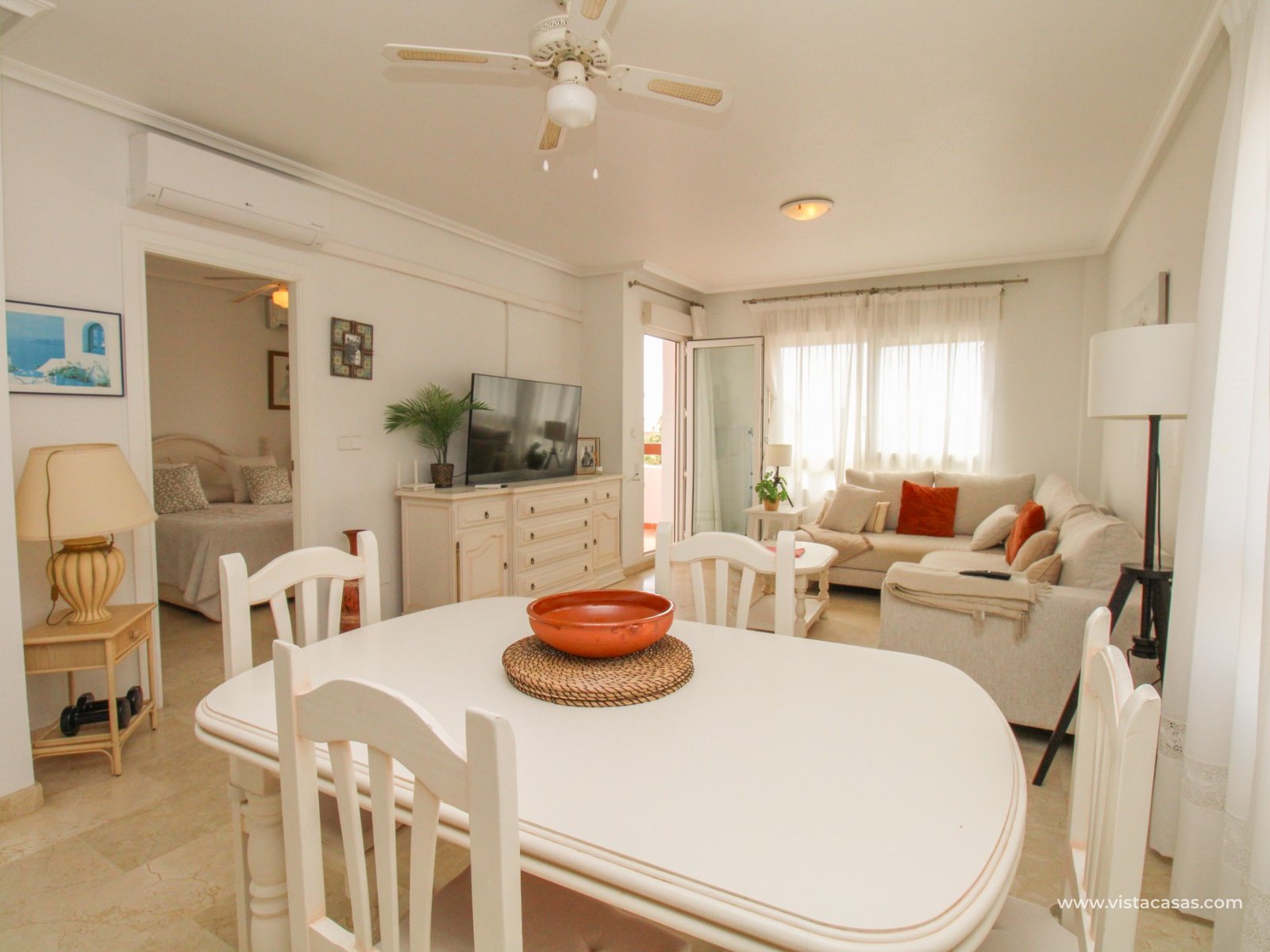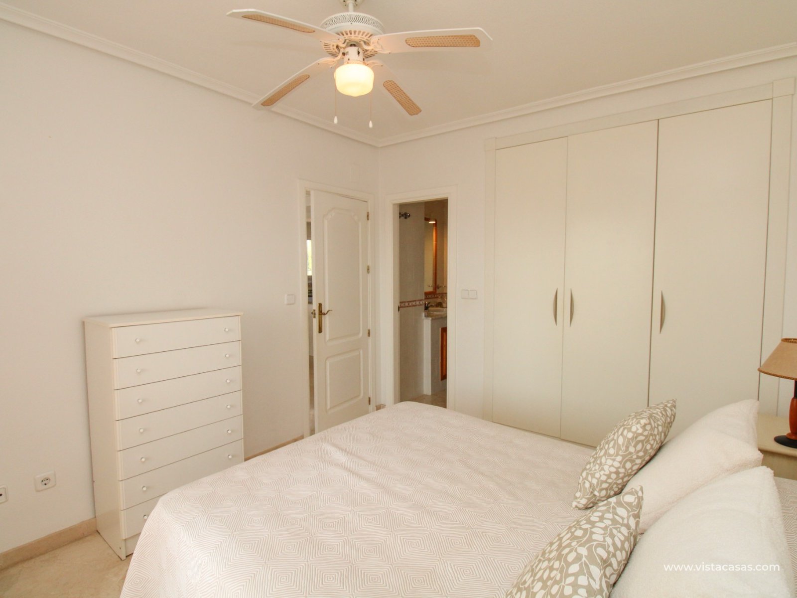 Nieruchomość składa się z holu wejściowego prowadzącego do jasnego i przestronnego salonu z jadalnią i otwartą kuchnią w stylu amerykańskim. Zadaszony balkon frontowy, dostępny zarówno z salonu, jak i głównej sypialni, wychodzi na wspólny basen. Główna sypialnia posiada wbudowane szafy i łazienkę z kabiną prysznicową. W tylnej części apartamentu znajduje się sypialnia gościnna z dwoma łóżkami, również z wbudowanymi szafami, oraz łazienka rodzinna. Jako narożny penthouse, nieruchomość oferuje dodatkowe naturalne światło i poczucie większej przestrzeni.