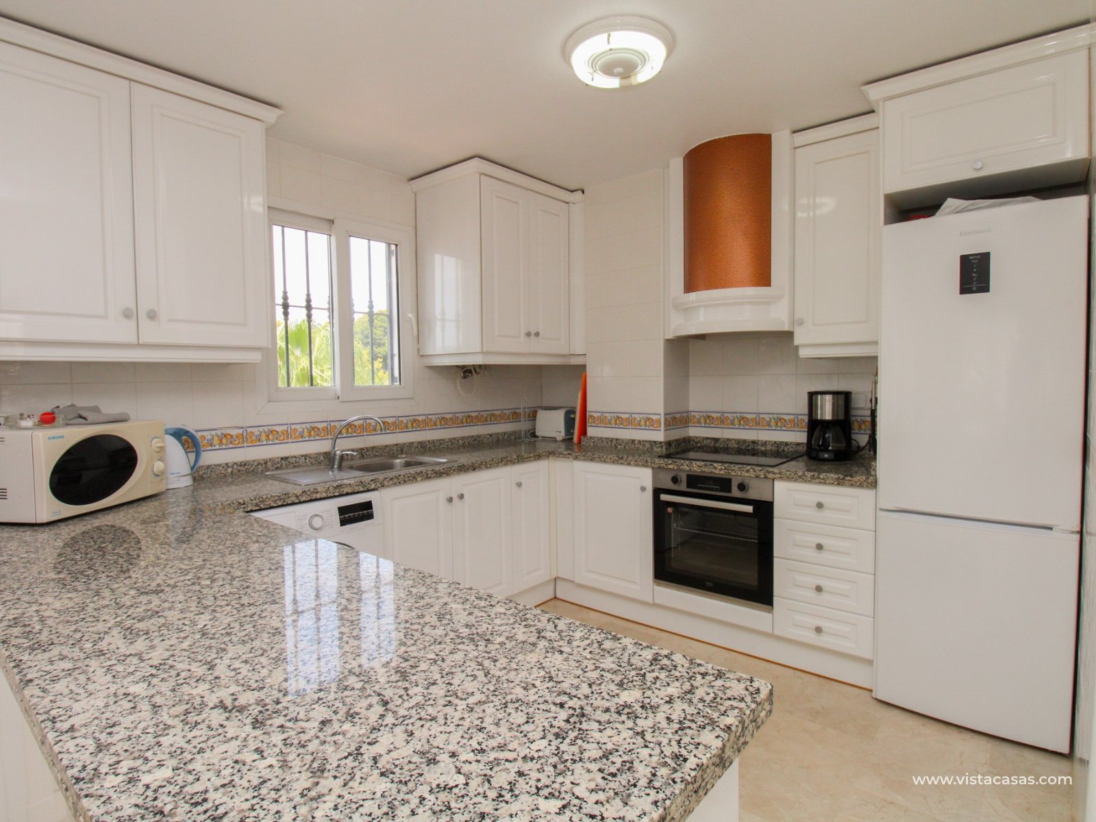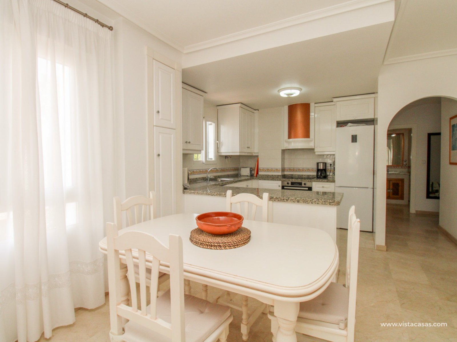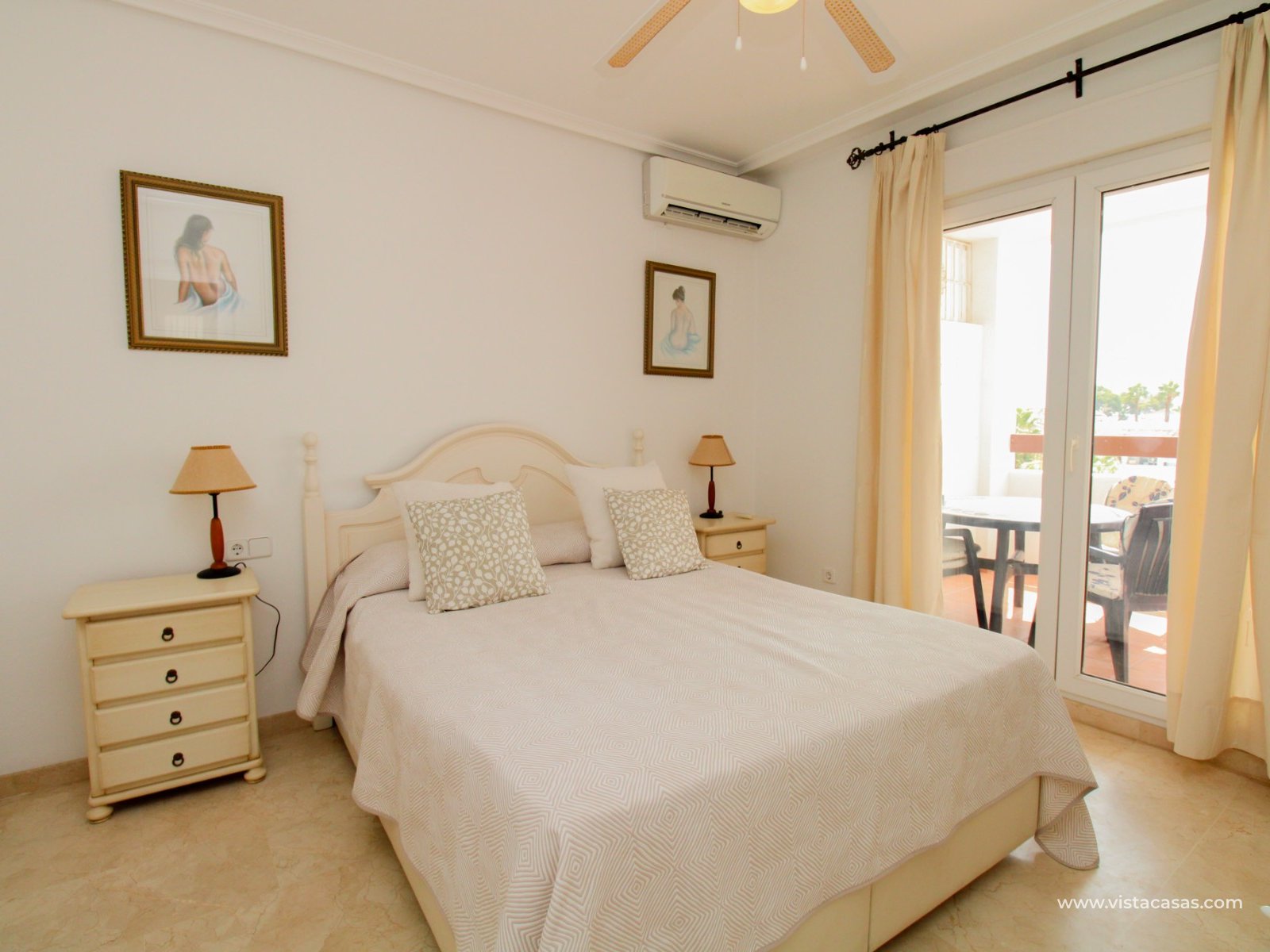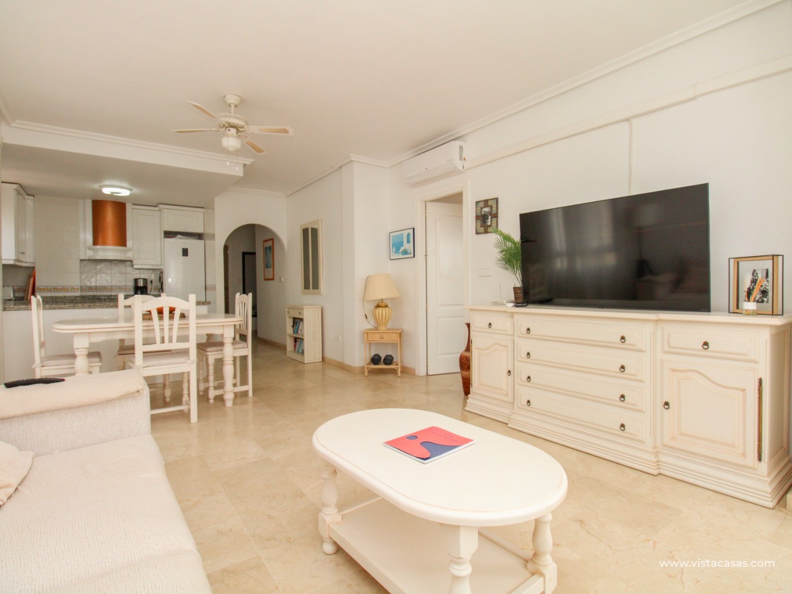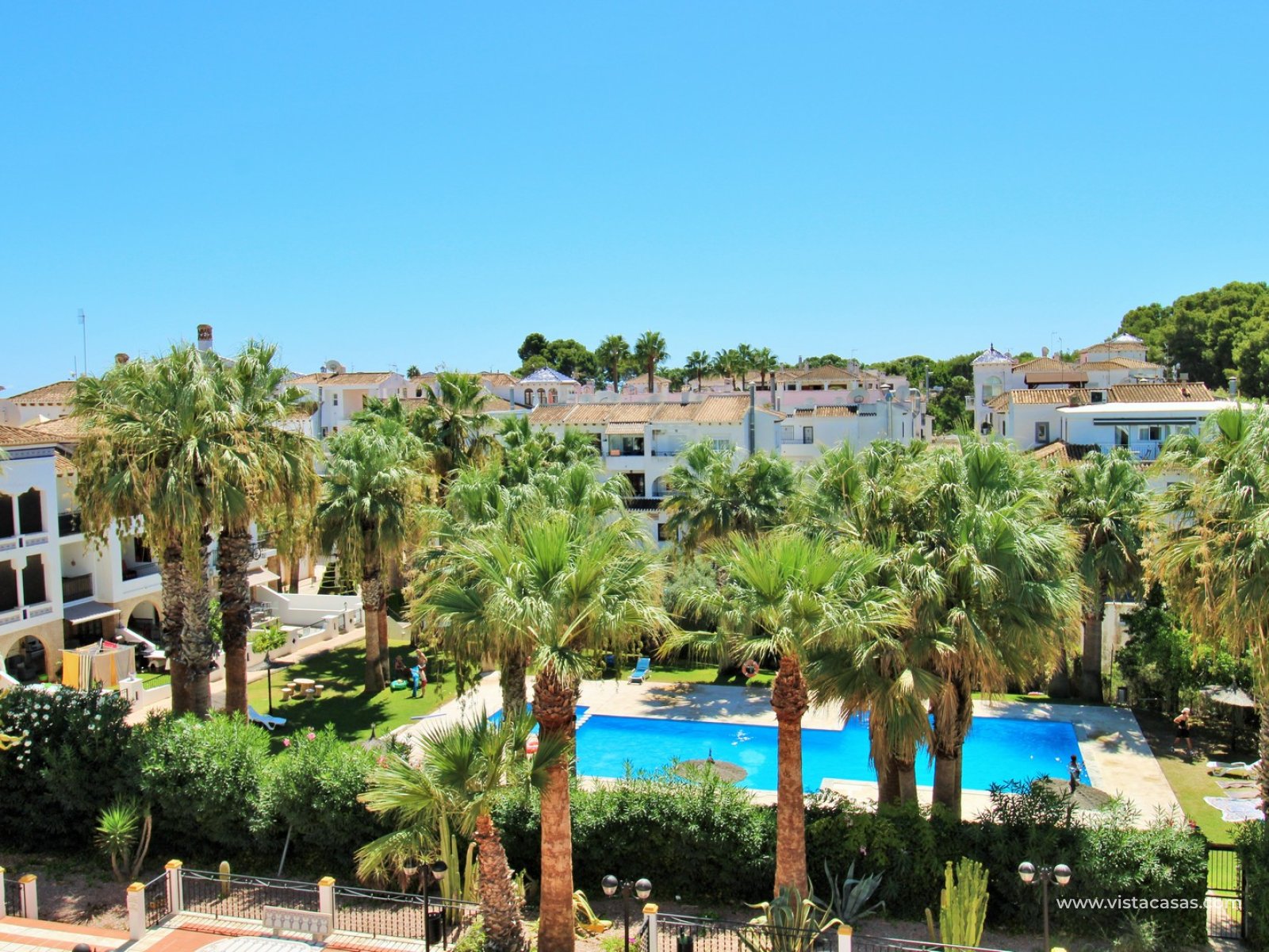 Nieruchomość składa się z holu wejściowego prowadzącego do jasnego i przestronnego salonu z jadalnią i otwartą kuchnią w stylu amerykańskim. Zadaszony balkon frontowy, dostępny zarówno z salonu, jak i głównej sypialni, wychodzi na wspólny basen. Główna sypialnia posiada wbudowane szafy i łazienkę z kabiną prysznicową. W tylnej części apartamentu znajduje się sypialnia gościnna z dwoma łóżkami, również z wbudowanymi szafami, oraz łazienka rodzinna. Jako narożny penthouse, nieruchomość oferuje dodatkowe naturalne światło i poczucie większej przestrzeni.