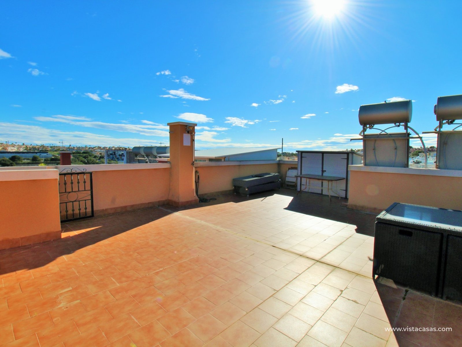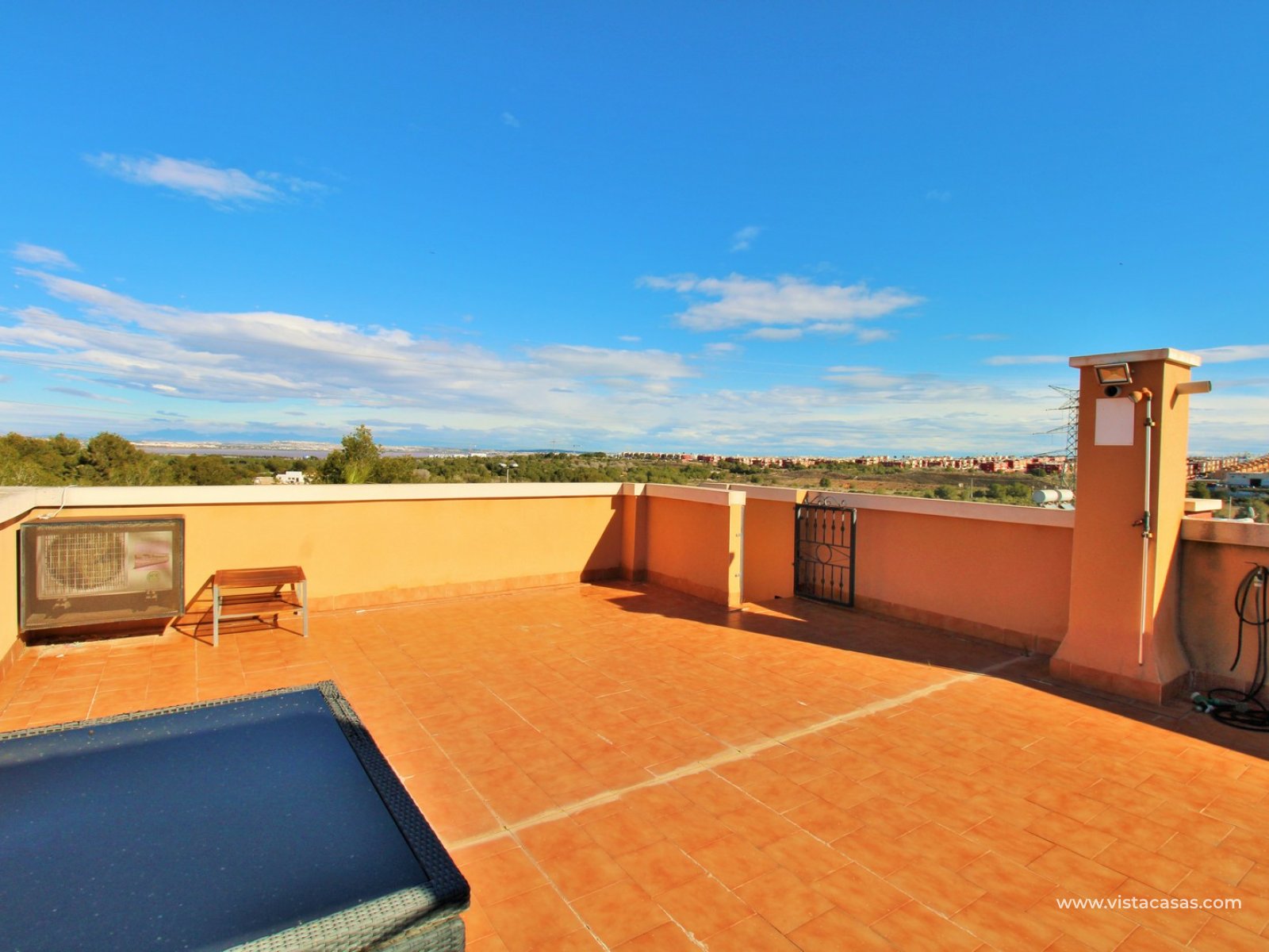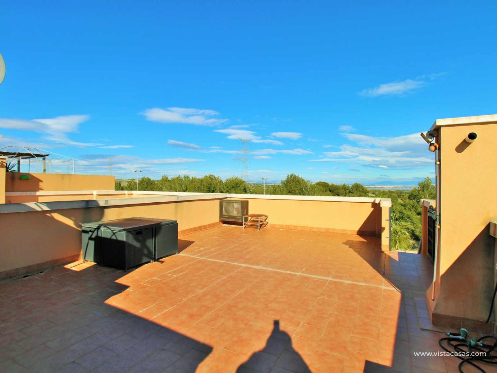 Nieruchomość składa się z jasnego salonu z jadalnią z wyjściem na balkon, oddzielnej kuchni, dwóch sypialni oraz łazienki. Z balkonu schody prowadzą na duże prywatne solarium na dachu, idealne do wypoczynku, z widokiem na solniska Torrevieja.