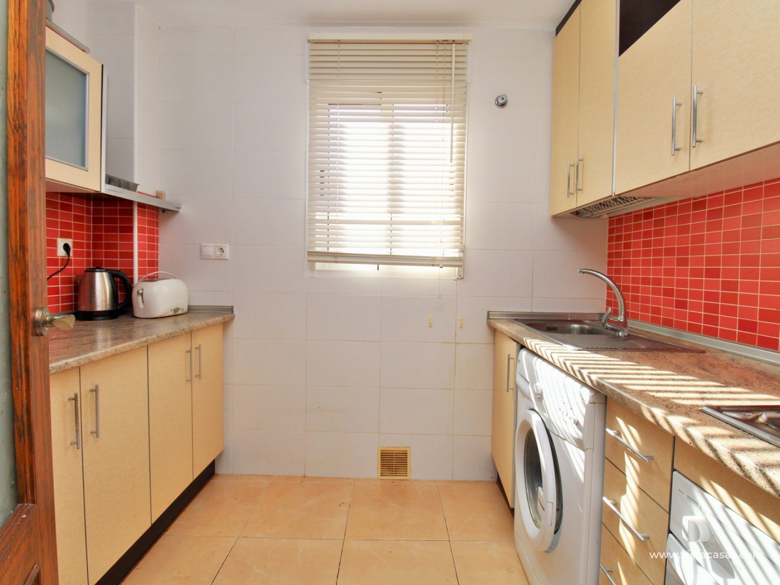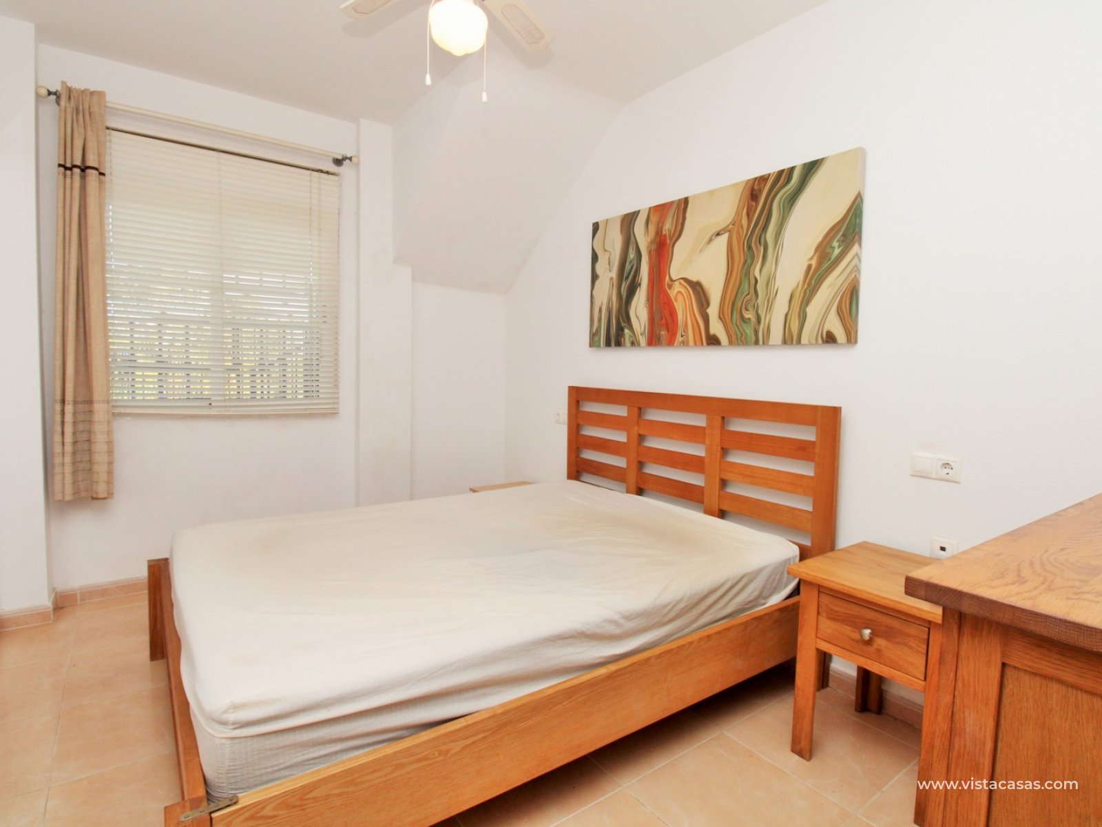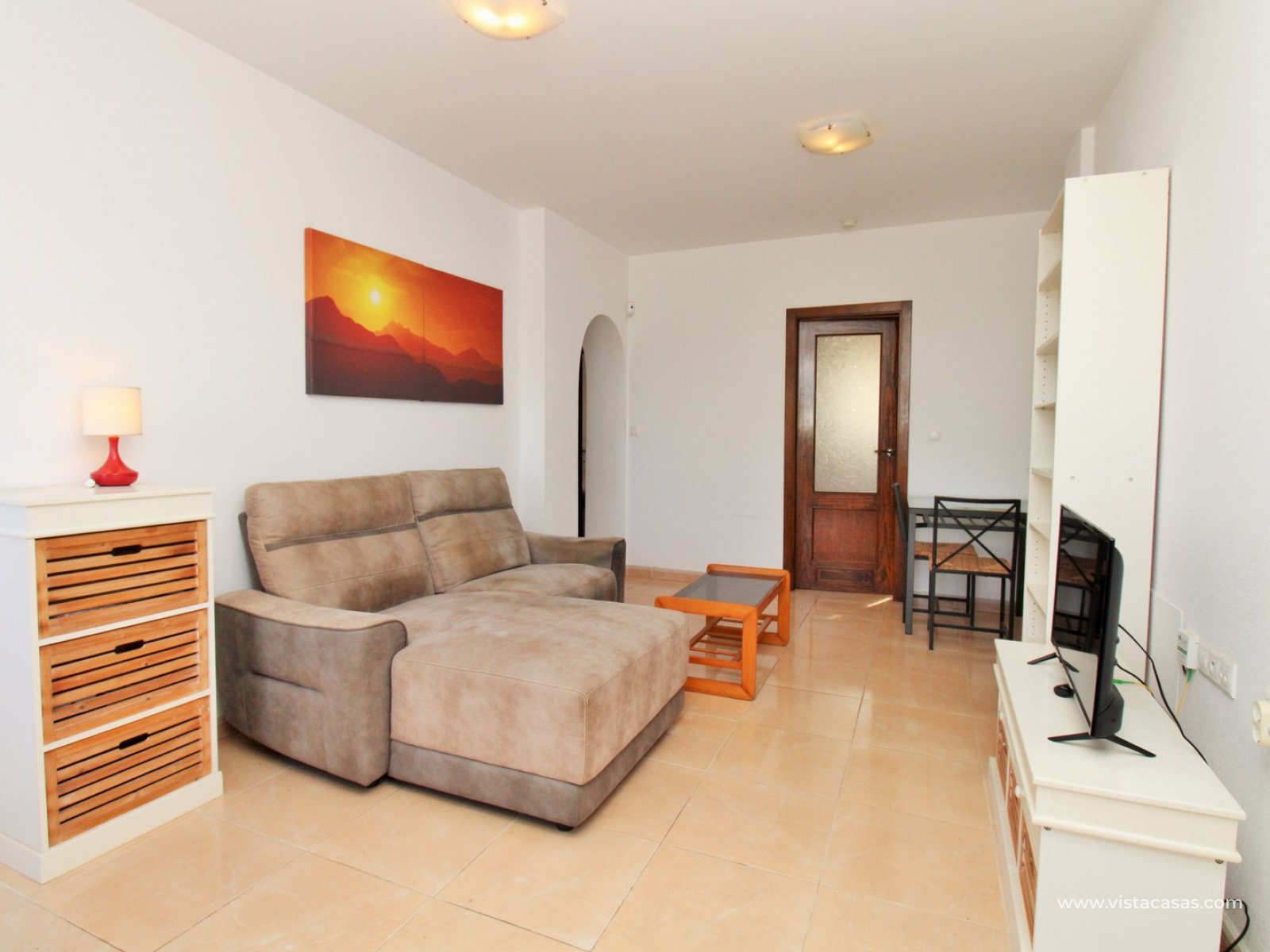 Nieruchomość składa się z jasnego salonu z jadalnią z wyjściem na balkon, oddzielnej kuchni, dwóch sypialni oraz łazienki. Z balkonu schody prowadzą na duże prywatne solarium na dachu, idealne do wypoczynku, z widokiem na solniska Torrevieja.