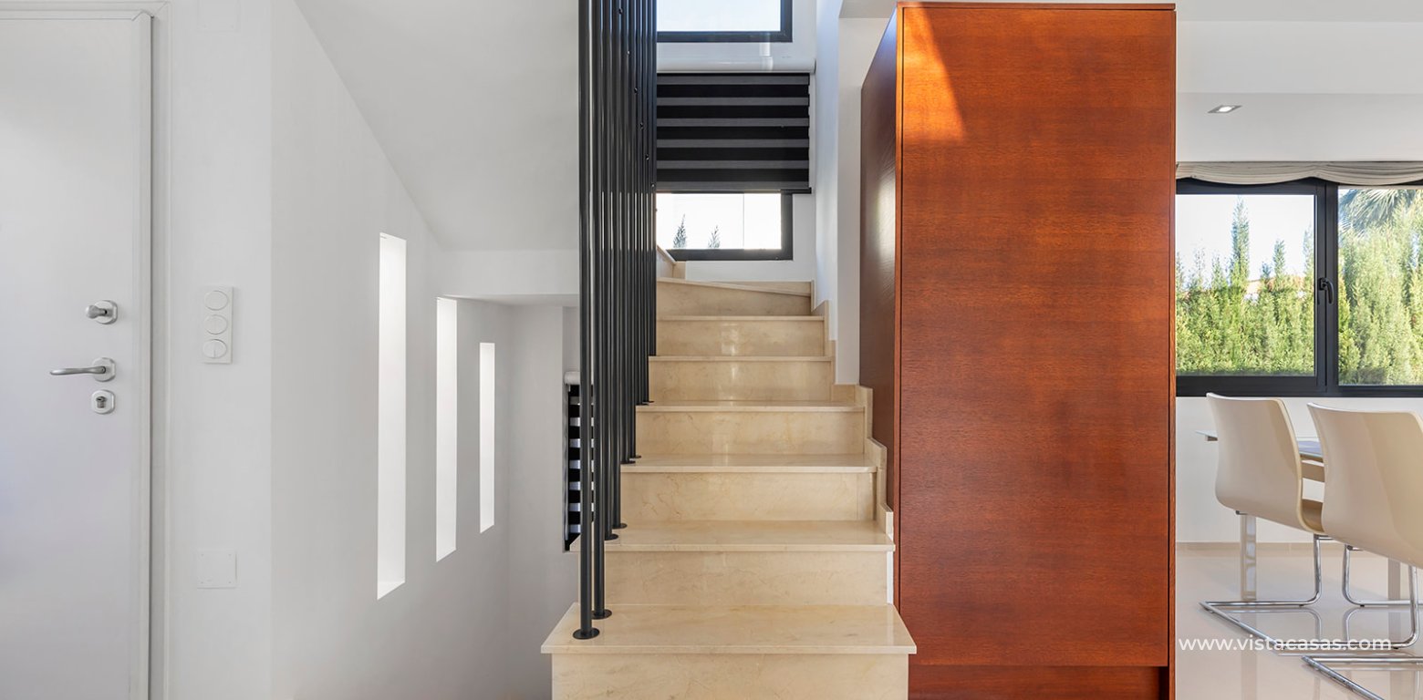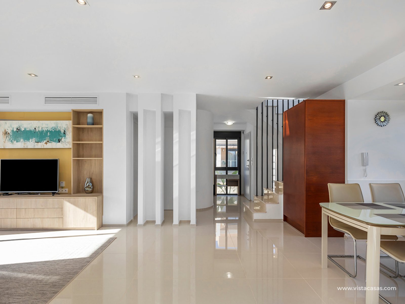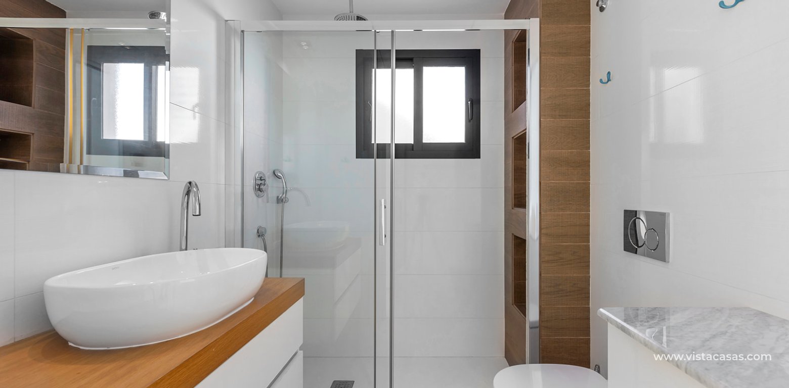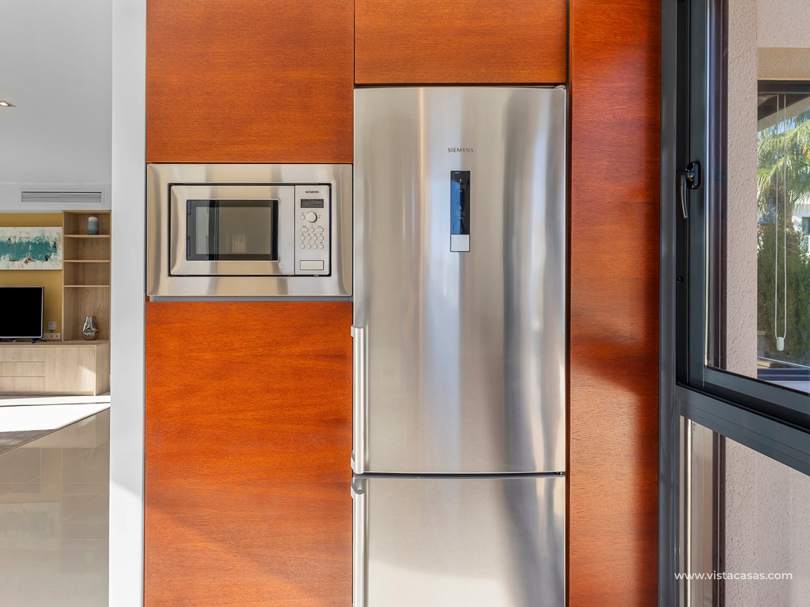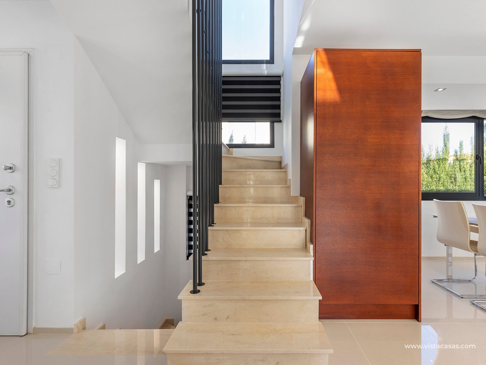 Luxury villa in La Zenia, Orihuela Costa. This villa is situated in an exclusive residential area and has its own private pool and a plot of 410m2. The property has 250m2 built area divided into 4 floors. On the ground floor there is a spacious living room with open plan kitchen, 1 bedroom, 1 bathroom and terrace with access to the pool. On the semi-basement floor there is a living room with open plan kitchen, 2 bedrooms and 1 bathroom. This floor also has a sauna and shower. On the first floor there are 2 bedrooms, each with en-suite bathroom and a large terrace. On the top floor there is a large solarium of 46m2. La Zenia is close to Cabo Roig, Campoamor and Playa Flamenca. It is a tourist area located close to all amenities of the famous La Zenia Boulevard shopping centre. A few minutes from the N-332 and the Mediterranean motorway AP-7 towards Alicante and Cartagena. There are also around the golf courses of Villamartin, Las Ramblas, Campoamor and Las Colinas.