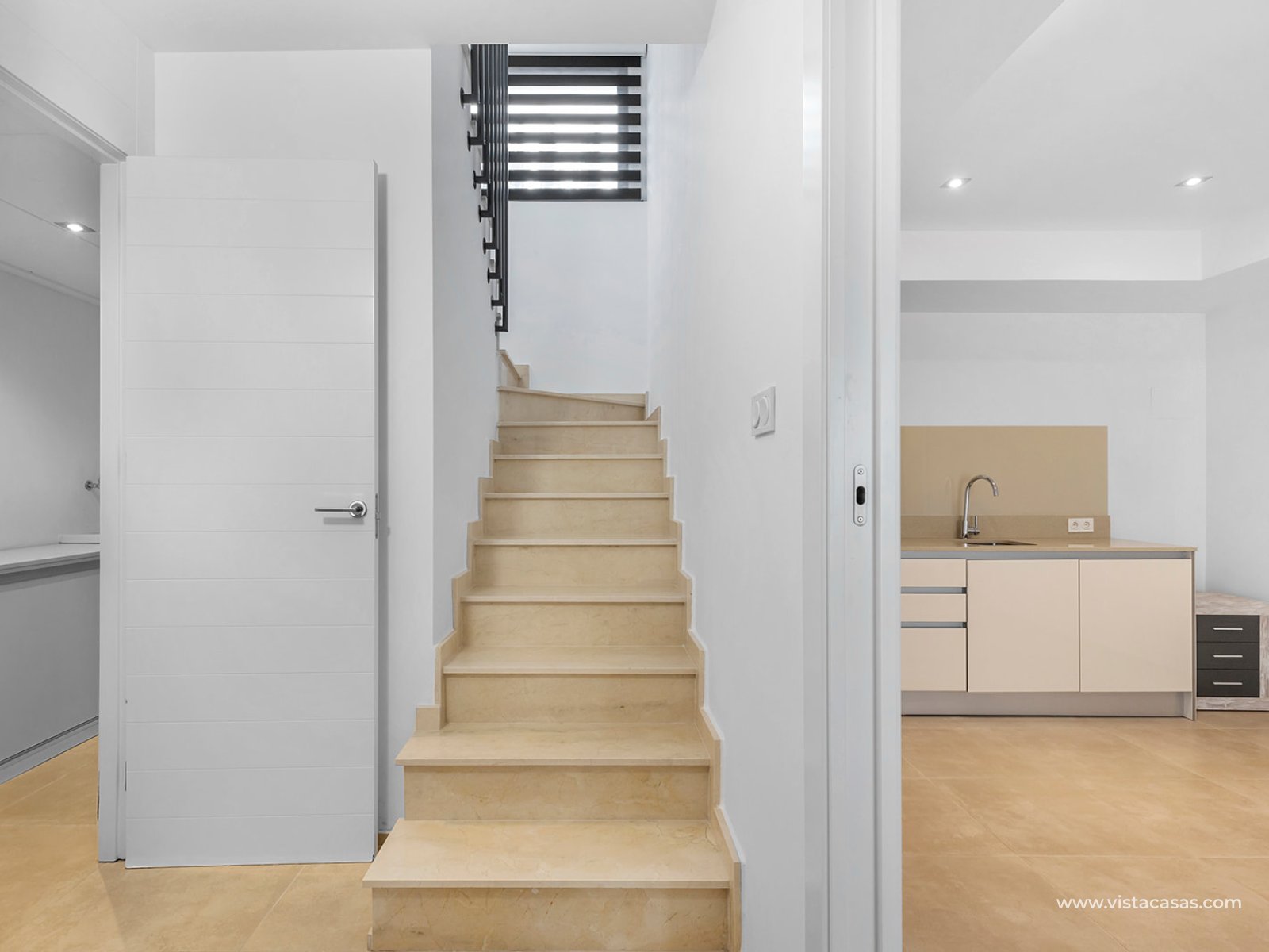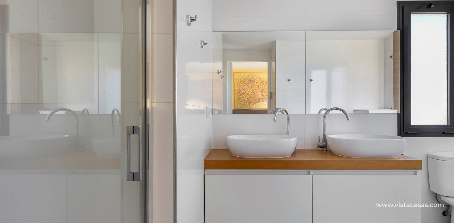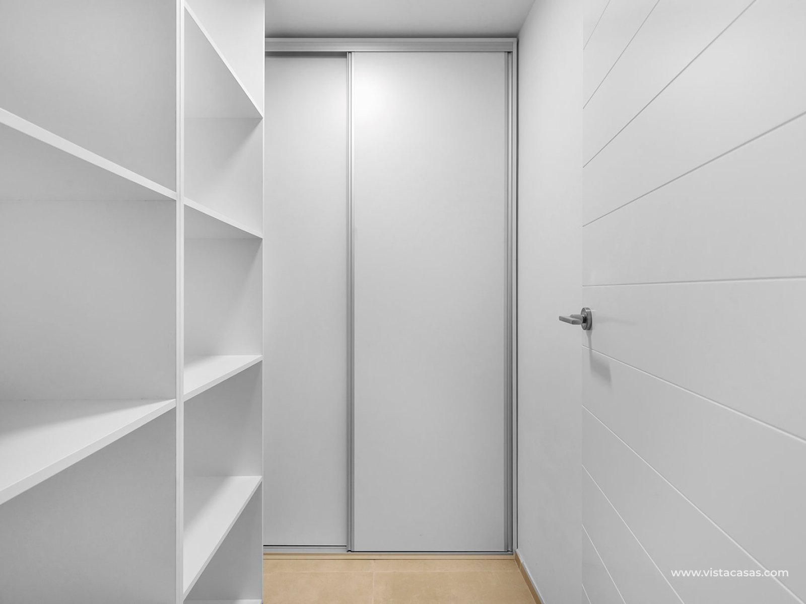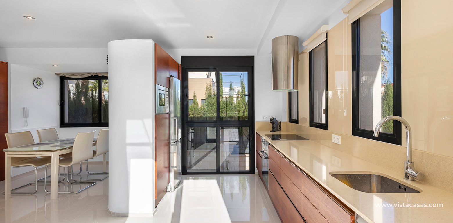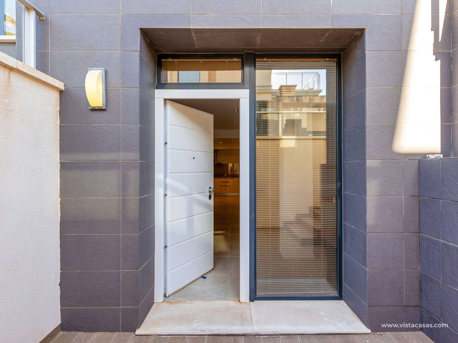 Luxury villa in La Zenia, Orihuela Costa. This villa is situated in an exclusive residential area and has its own private pool and a plot of 410m2. The property has 250m2 built area divided into 4 floors. On the ground floor there is a spacious living room with open plan kitchen, 1 bedroom, 1 bathroom and terrace with access to the pool. On the semi-basement floor there is a living room with open plan kitchen, 2 bedrooms and 1 bathroom. This floor also has a sauna and shower. On the first floor there are 2 bedrooms, each with en-suite bathroom and a large terrace. On the top floor there is a large solarium of 46m2. La Zenia is close to Cabo Roig, Campoamor and Playa Flamenca. It is a tourist area located close to all amenities of the famous La Zenia Boulevard shopping centre. A few minutes from the N-332 and the Mediterranean motorway AP-7 towards Alicante and Cartagena. There are also around the golf courses of Villamartin, Las Ramblas, Campoamor and Las Colinas.