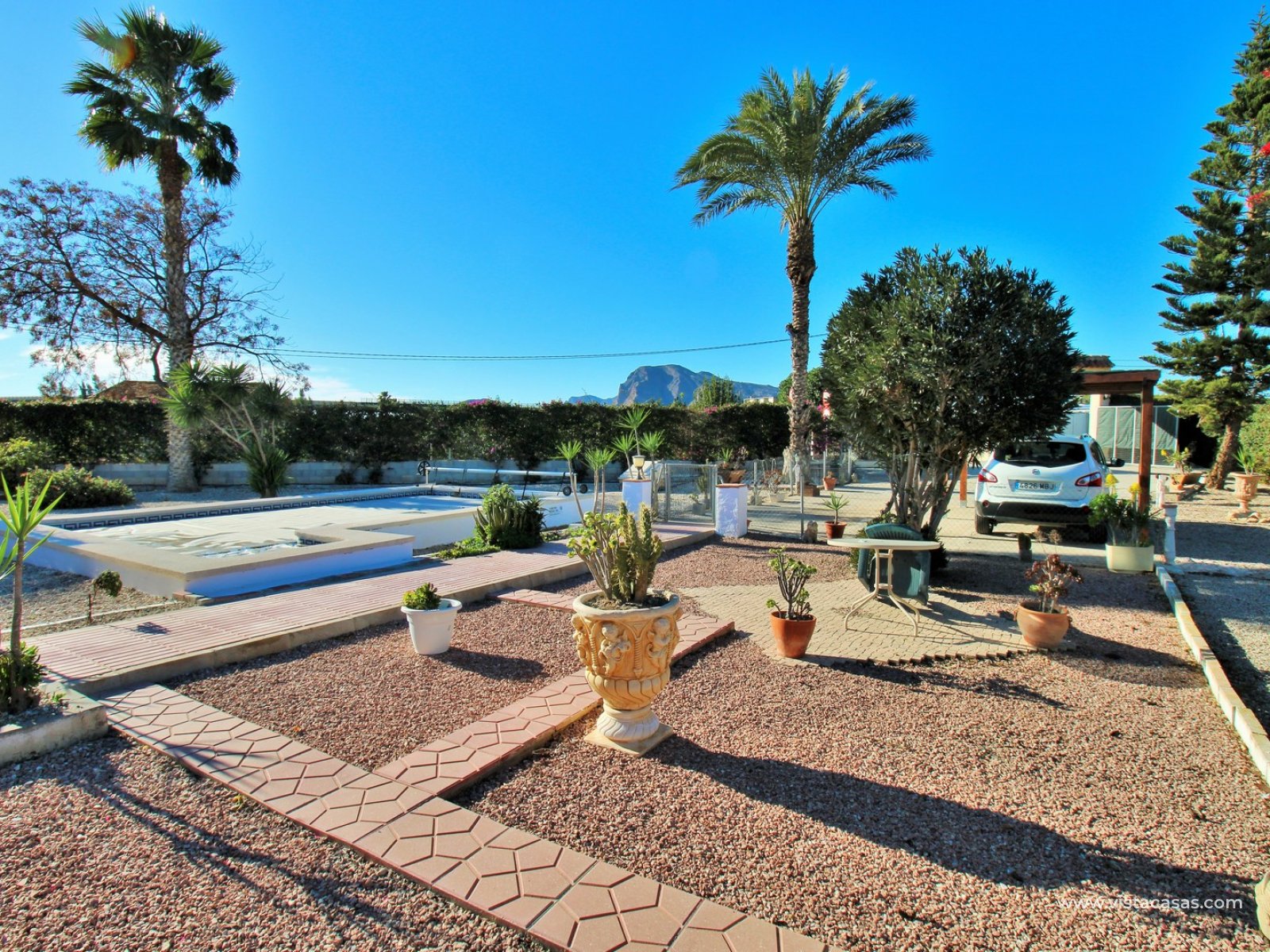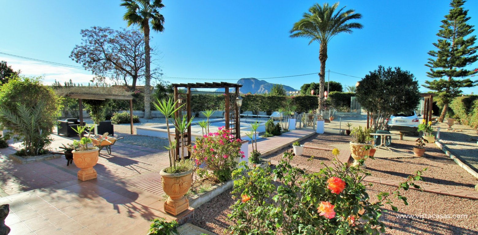 The property is accessed via a secure entrance gate that leads to a generous parking area. The fenced plot is further complemented by a lower gate, which opens to reveal the sparkling private pool. A beautifully landscaped garden surrounds the home, adorned with mature fruit and palm trees, as well as vibrant, colourful flowers.