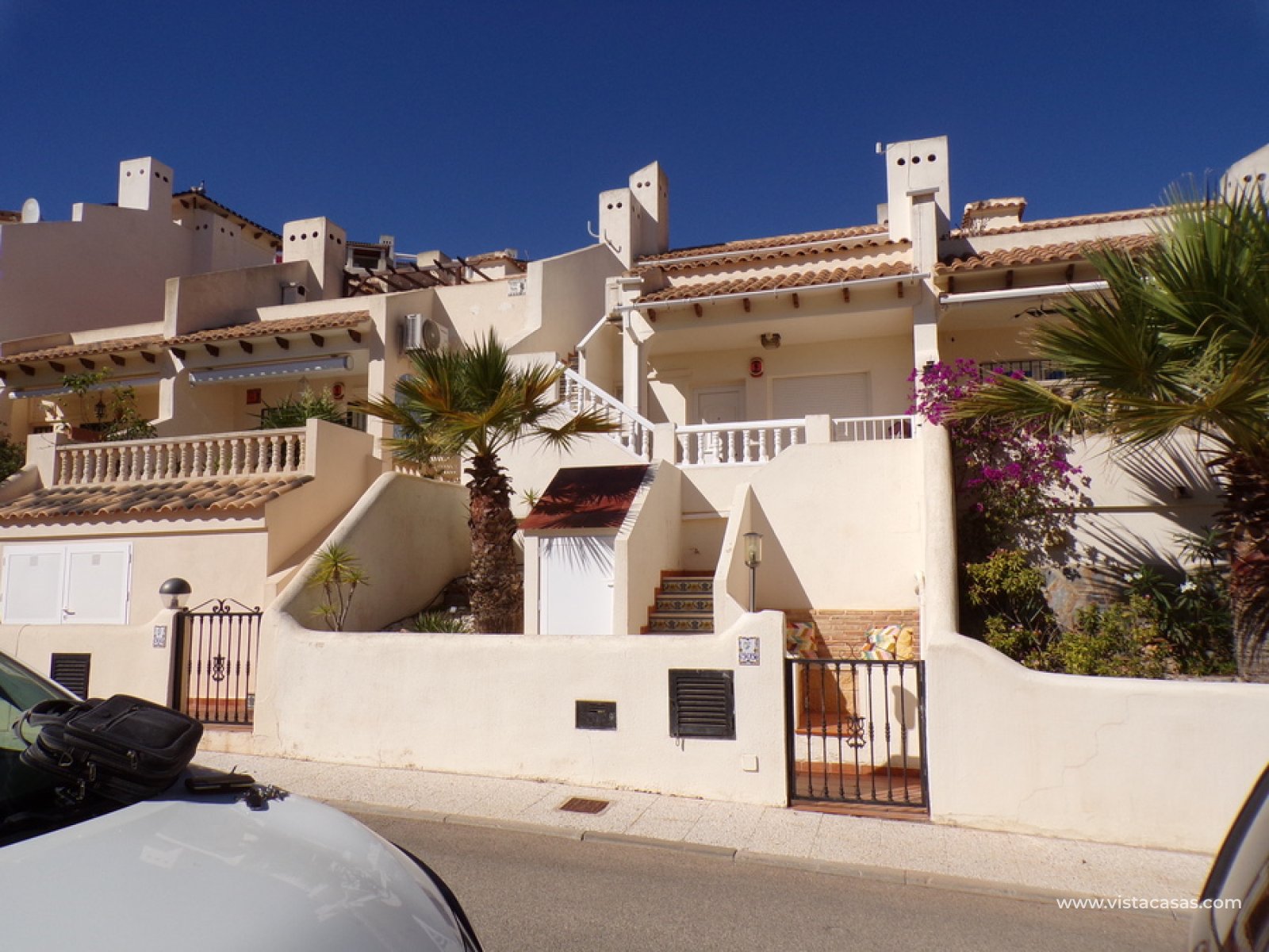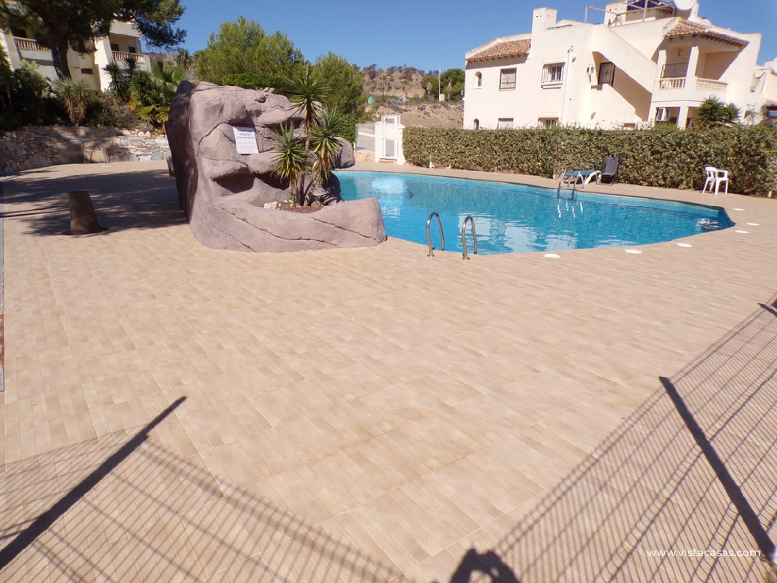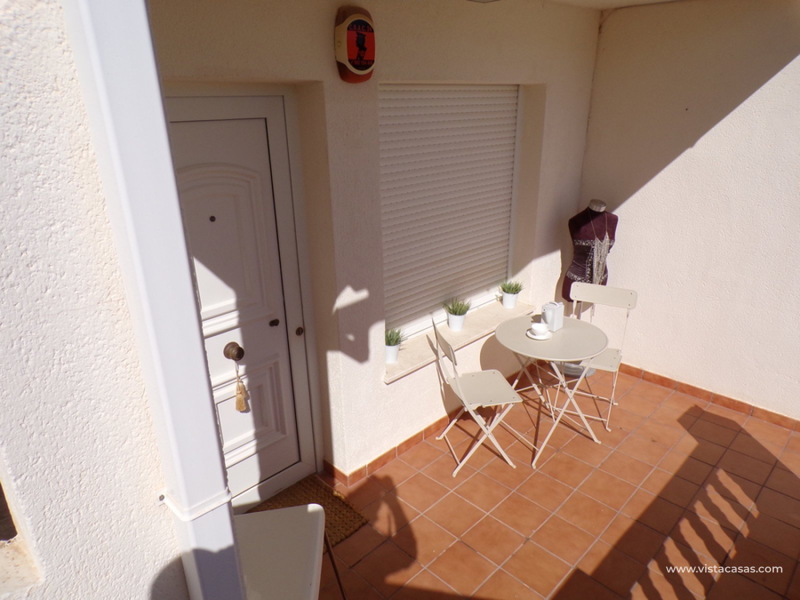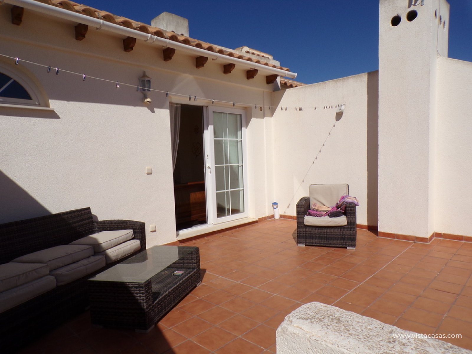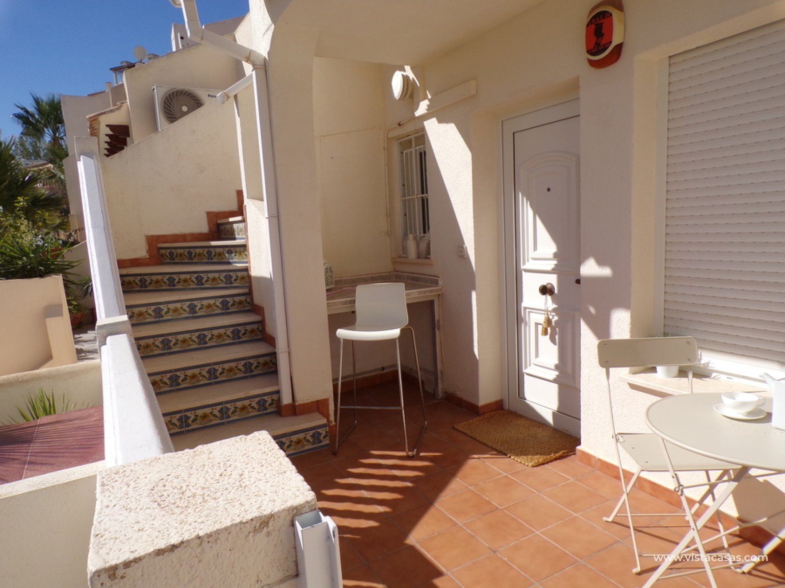 Stunning 3 bed 3 bath Townhouse in Las Ramblas Golf near La Fuente, Orihuela Costa. South East Facing front terrace, leads you into a good size lounge/dining area, with full A/C and an open fireplace. Off the lounge there’s, an open plan American style kitchen, with a range of base and wall units, white goods etc. The property consists of two double bedrooms to this ground floor; both have fitted wardrobes, the master coming with A/c hot and cold plus French doors that take you to the rear garden. There is also an on suite bathroom to the master bedroom with walk in shower. The lower floor also consists of a family bathroom, with full bath and shower over. Up the external stairs, you will find another double bedroom with on-suite, consisting of a walk in shower, there is also a large solarium with some views of the golf course. There is also a nice communal pool just around the corner from the property. The property is situated 2 mins drive from La Fuente commercial centre and only a 1 min drive to the golf club house. This is a fantastic location for plenty of bars restaurants, beaches are a max 10 min drive down the road.