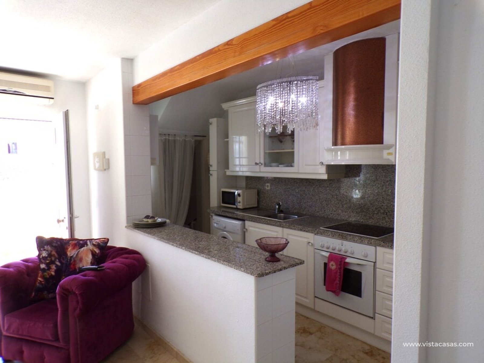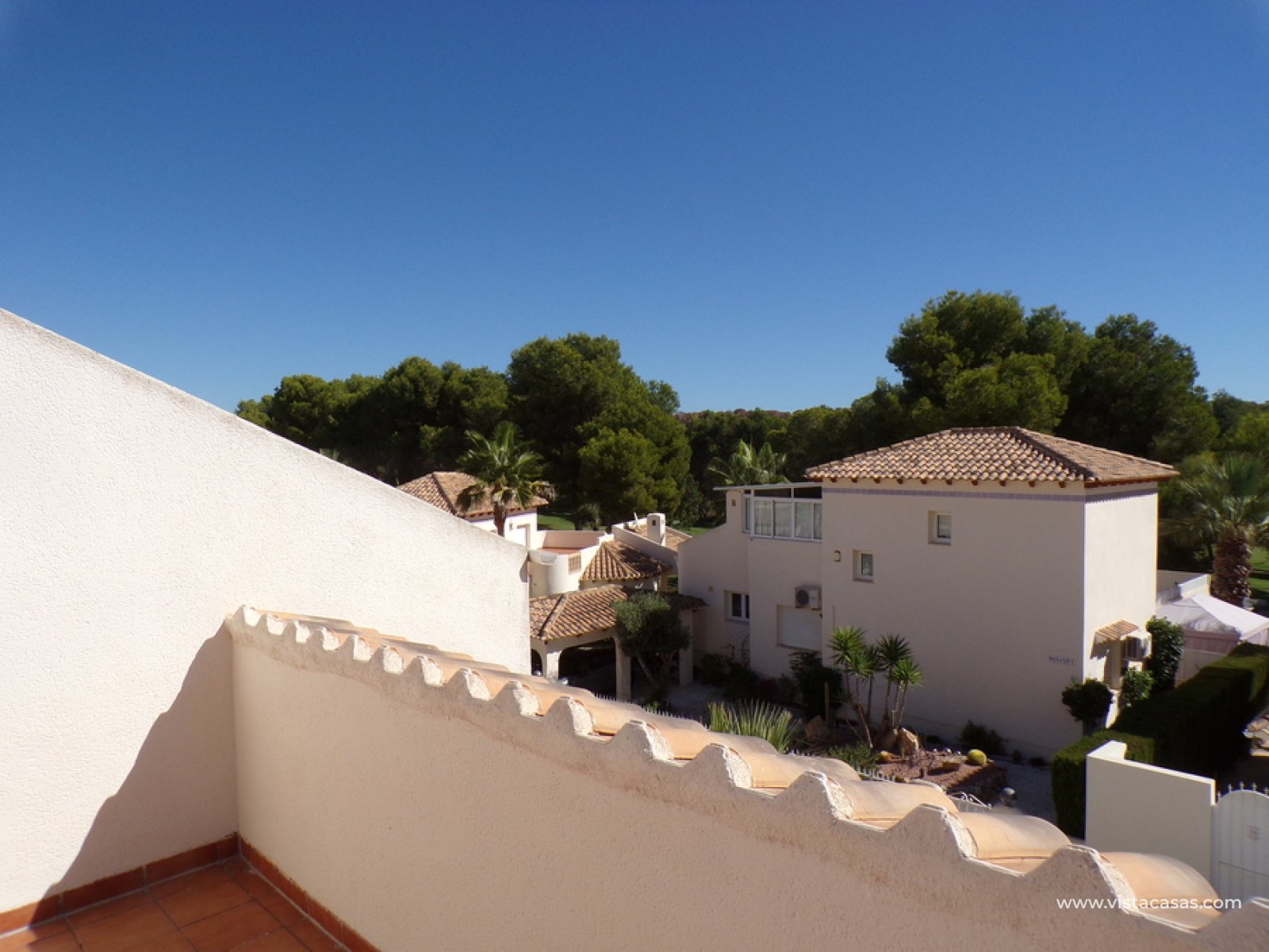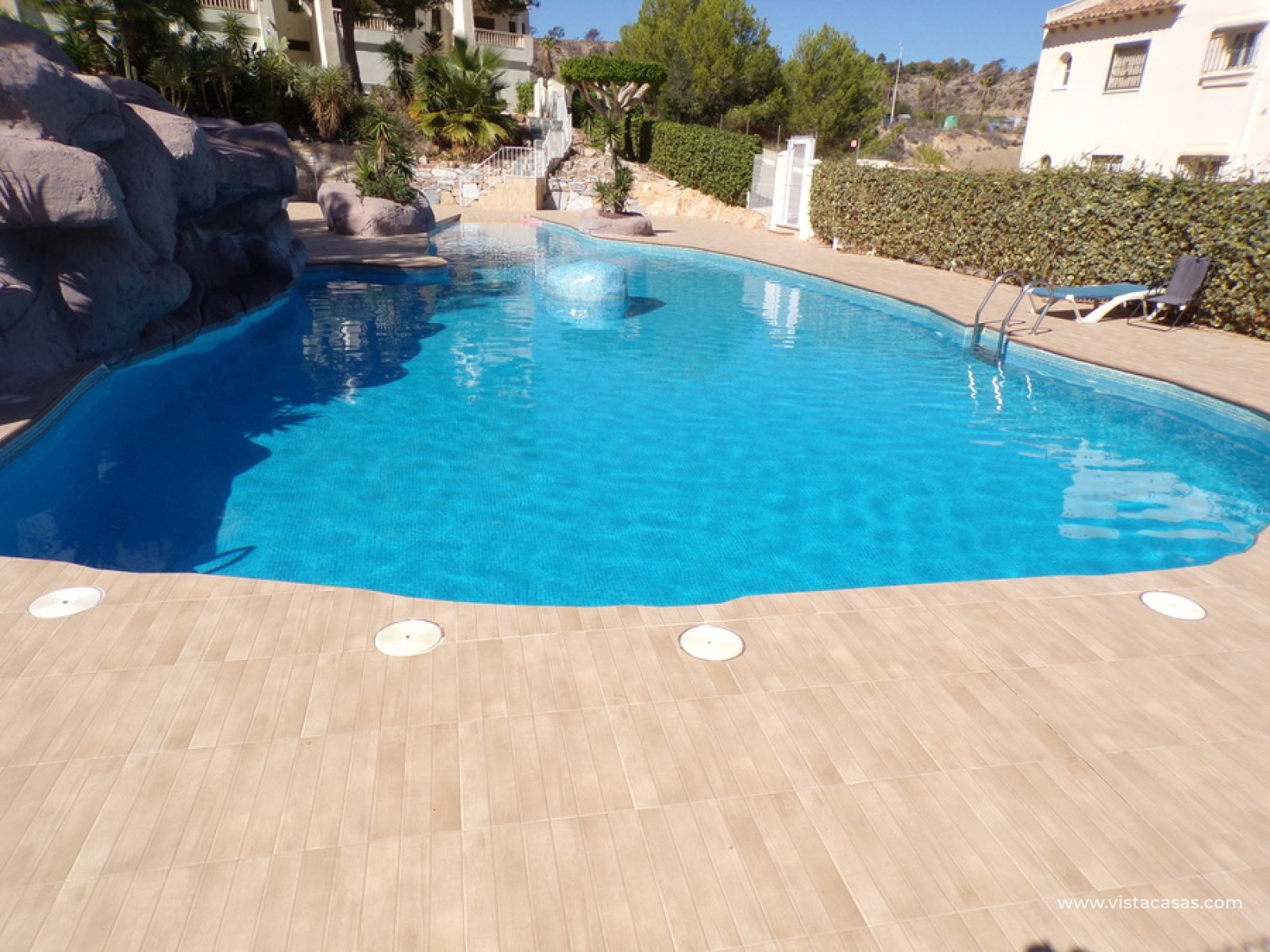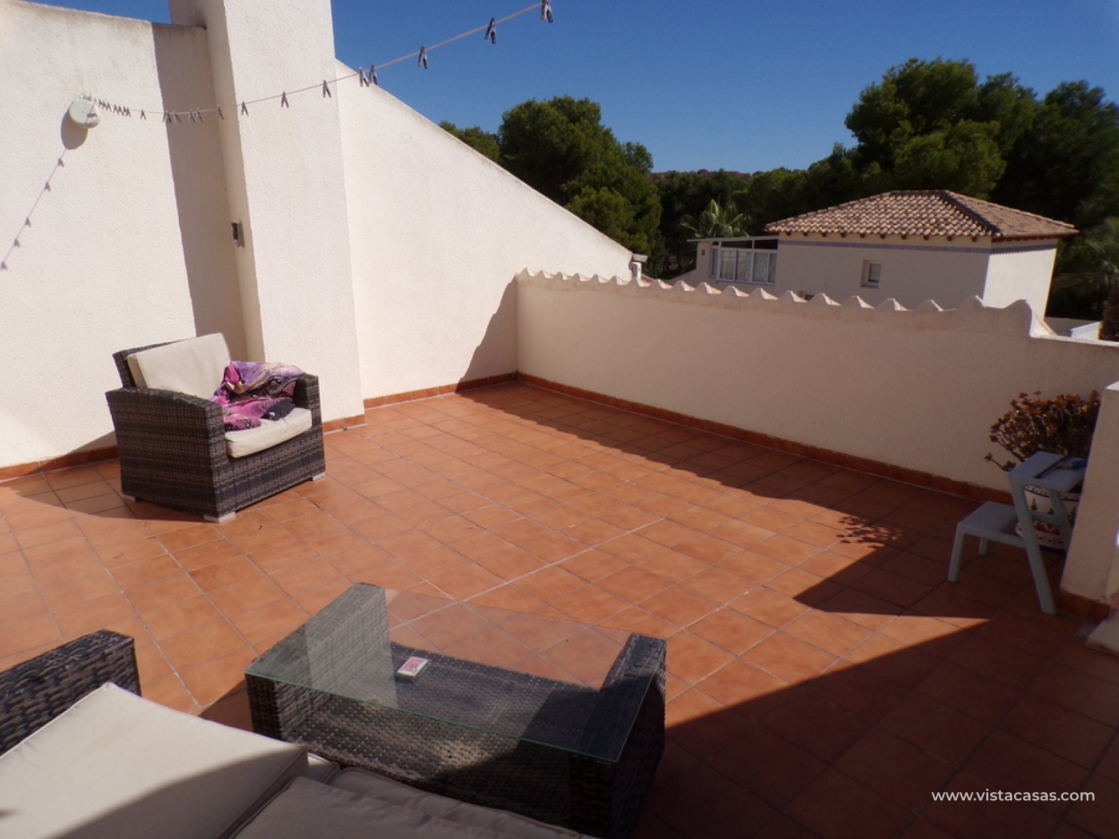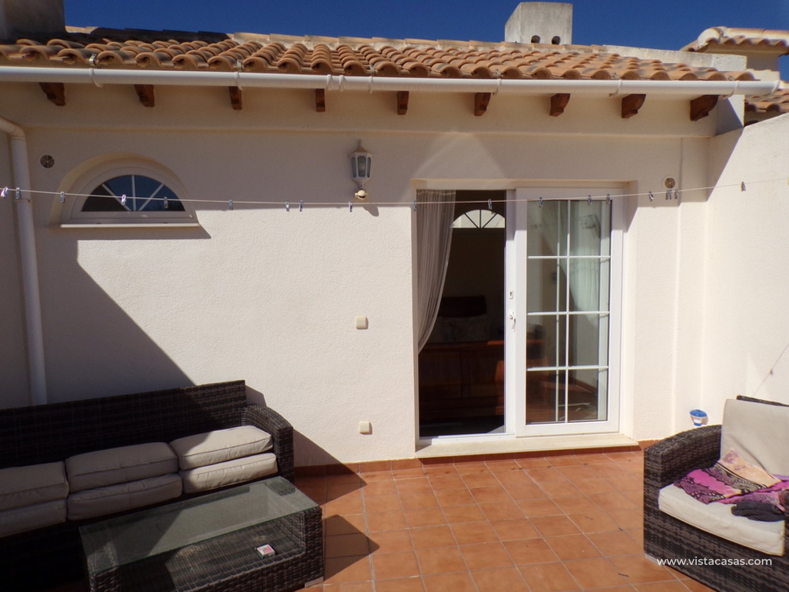 Stunning 3 bed 3 bath Townhouse in Las Ramblas Golf near La Fuente, Orihuela Costa. South East Facing front terrace, leads you into a good size lounge/dining area, with full A/C and an open fireplace. Off the lounge there’s, an open plan American style kitchen, with a range of base and wall units, white goods etc. The property consists of two double bedrooms to this ground floor; both have fitted wardrobes, the master coming with A/c hot and cold plus French doors that take you to the rear garden. There is also an on suite bathroom to the master bedroom with walk in shower. The lower floor also consists of a family bathroom, with full bath and shower over. Up the external stairs, you will find another double bedroom with on-suite, consisting of a walk in shower, there is also a large solarium with some views of the golf course. There is also a nice communal pool just around the corner from the property. The property is situated 2 mins drive from La Fuente commercial centre and only a 1 min drive to the golf club house. This is a fantastic location for plenty of bars restaurants, beaches are a max 10 min drive down the road.