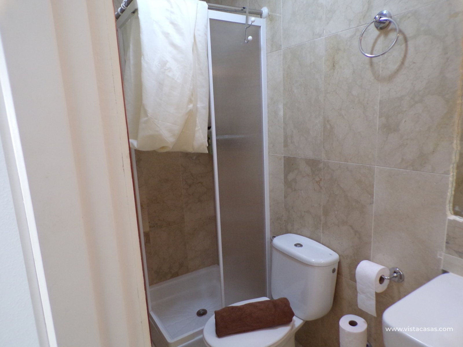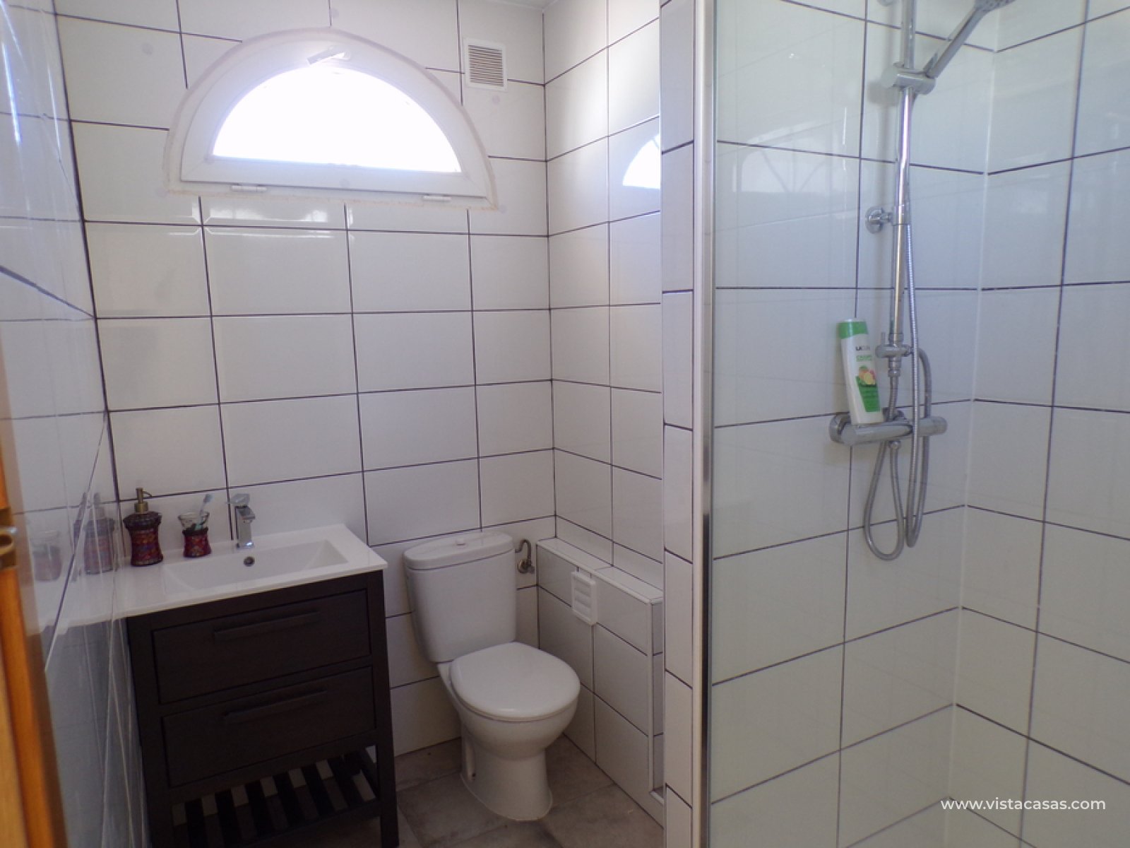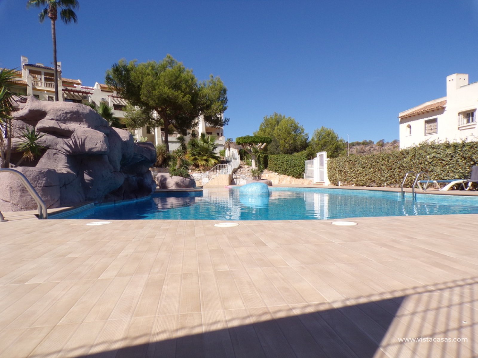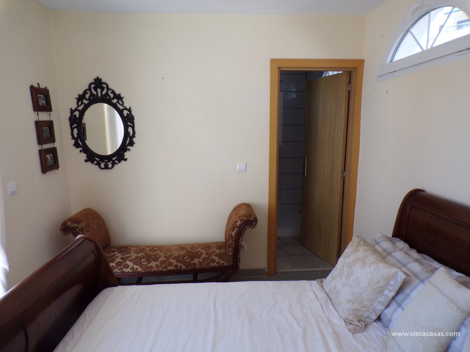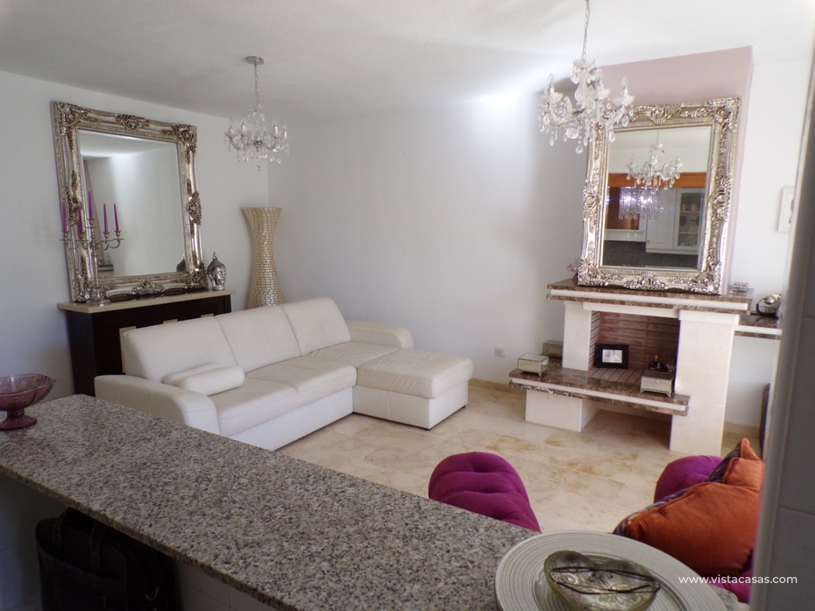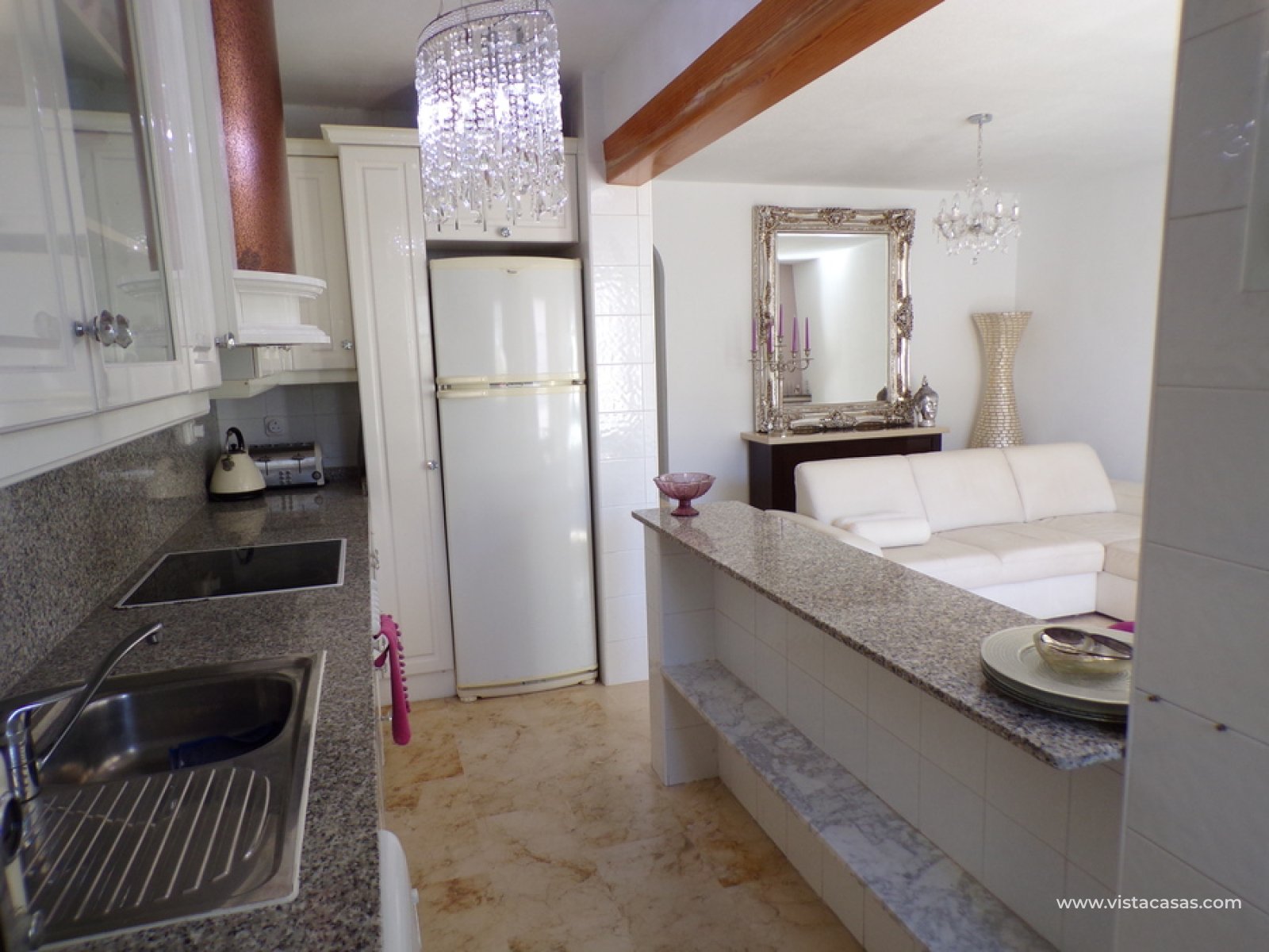 Stunning 3 bed 3 bath Townhouse in Las Ramblas Golf near La Fuente, Orihuela Costa. South East Facing front terrace, leads you into a good size lounge/dining area, with full A/C and an open fireplace. Off the lounge there’s, an open plan American style kitchen, with a range of base and wall units, white goods etc. The property consists of two double bedrooms to this ground floor; both have fitted wardrobes, the master coming with A/c hot and cold plus French doors that take you to the rear garden. There is also an on suite bathroom to the master bedroom with walk in shower. The lower floor also consists of a family bathroom, with full bath and shower over. Up the external stairs, you will find another double bedroom with on-suite, consisting of a walk in shower, there is also a large solarium with some views of the golf course. There is also a nice communal pool just around the corner from the property. The property is situated 2 mins drive from La Fuente commercial centre and only a 1 min drive to the golf club house. This is a fantastic location for plenty of bars restaurants, beaches are a max 10 min drive down the road.