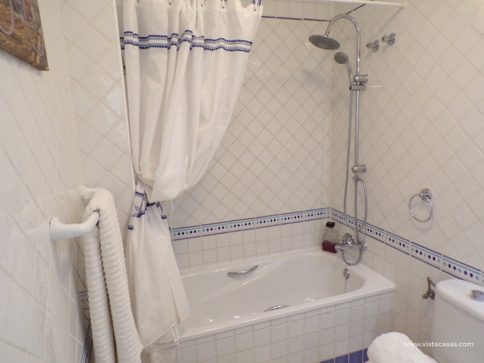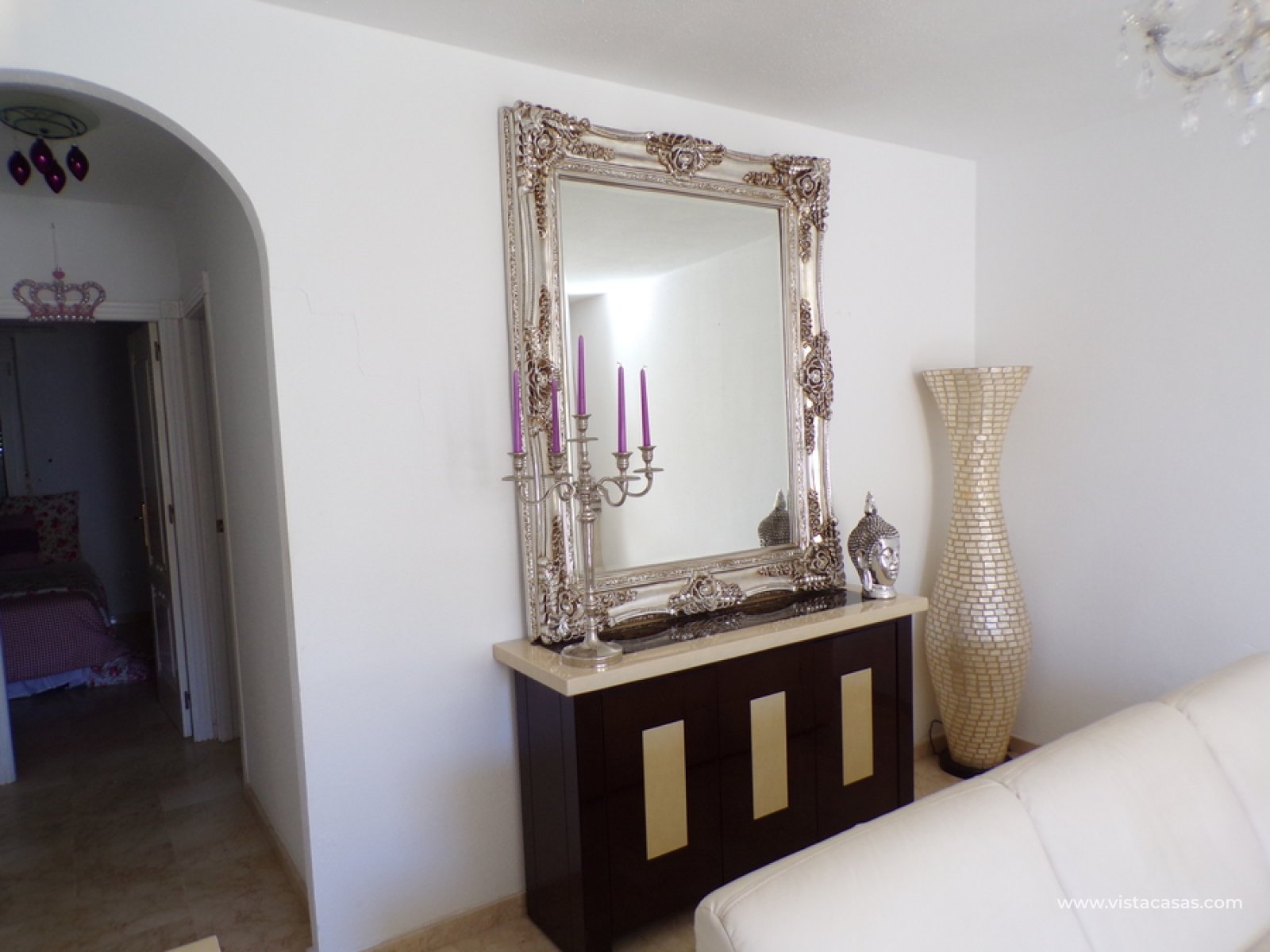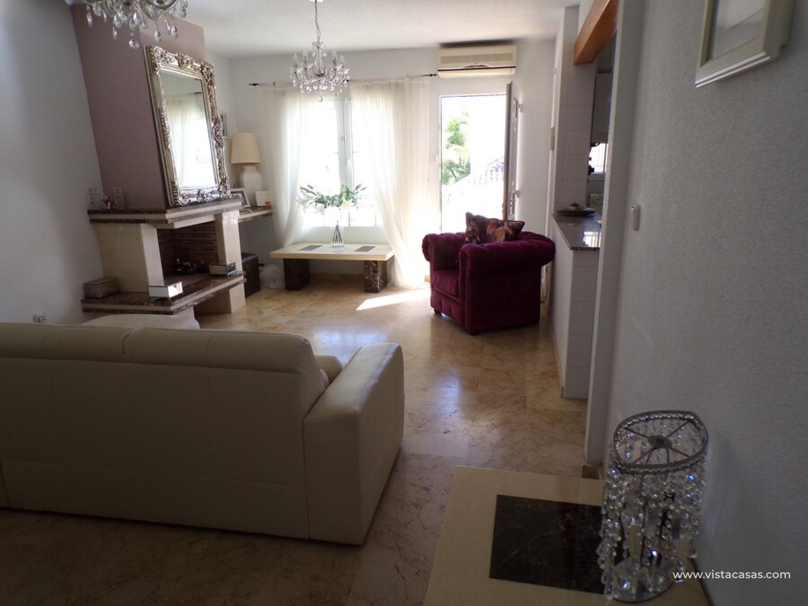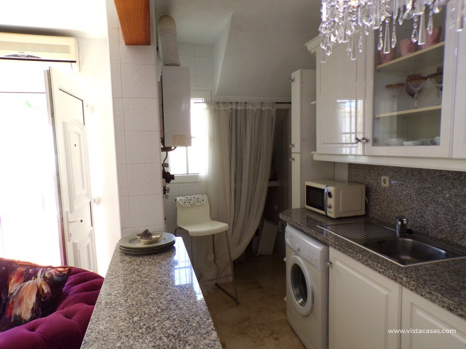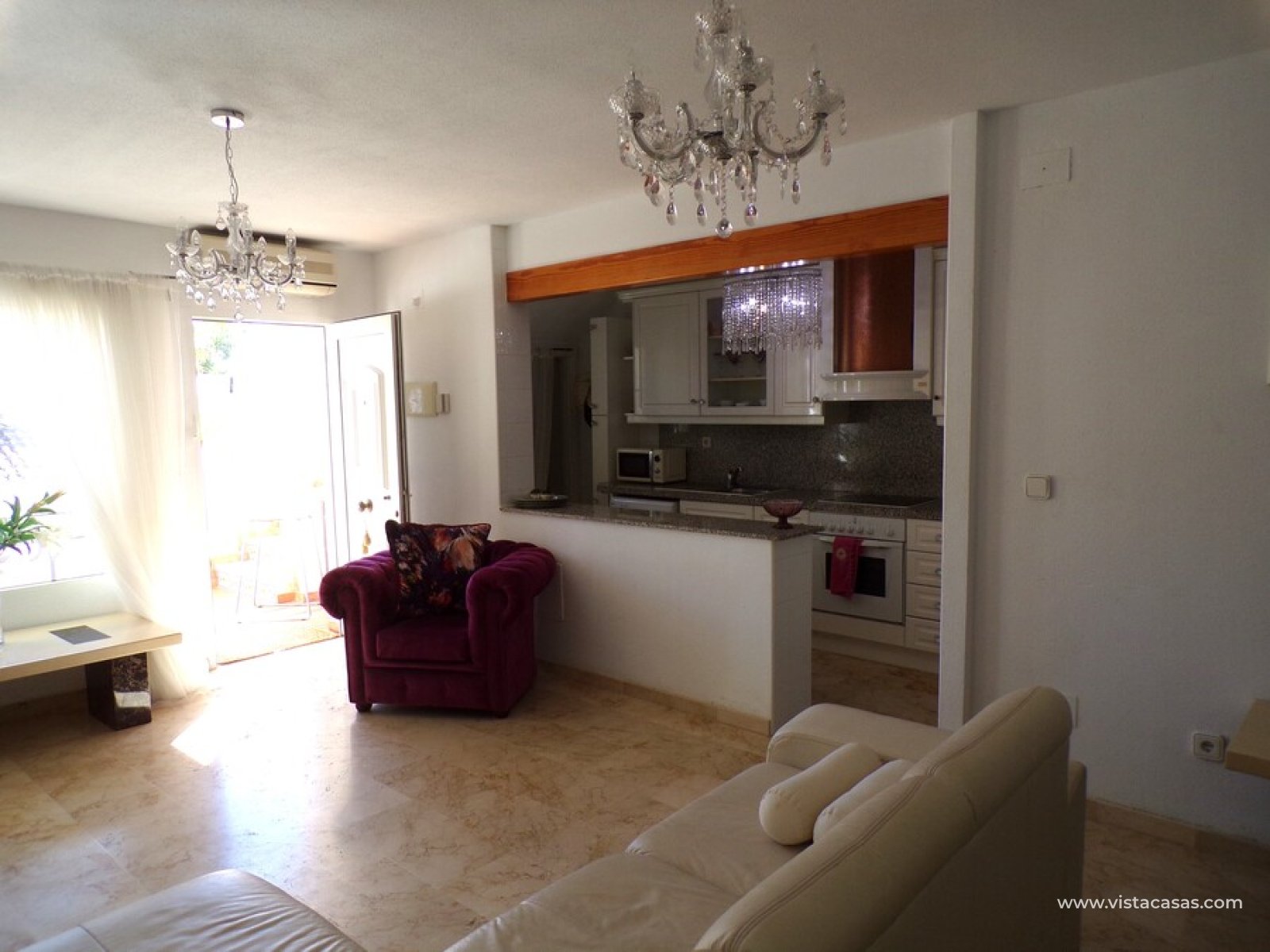 Stunning 3 bed 3 bath Townhouse in Las Ramblas Golf near La Fuente, Orihuela Costa. South East Facing front terrace, leads you into a good size lounge/dining area, with full A/C and an open fireplace. Off the lounge there’s, an open plan American style kitchen, with a range of base and wall units, white goods etc. The property consists of two double bedrooms to this ground floor; both have fitted wardrobes, the master coming with A/c hot and cold plus French doors that take you to the rear garden. There is also an on suite bathroom to the master bedroom with walk in shower. The lower floor also consists of a family bathroom, with full bath and shower over. Up the external stairs, you will find another double bedroom with on-suite, consisting of a walk in shower, there is also a large solarium with some views of the golf course. There is also a nice communal pool just around the corner from the property. The property is situated 2 mins drive from La Fuente commercial centre and only a 1 min drive to the golf club house. This is a fantastic location for plenty of bars restaurants, beaches are a max 10 min drive down the road.
