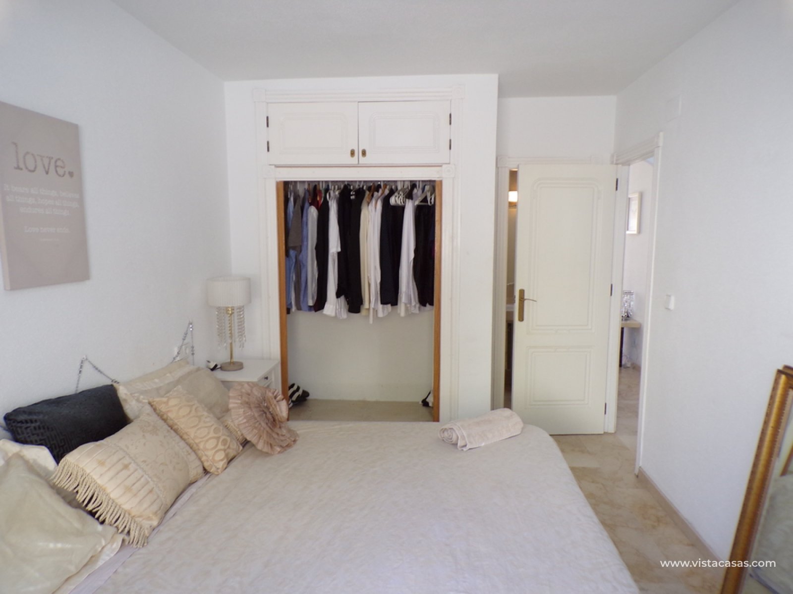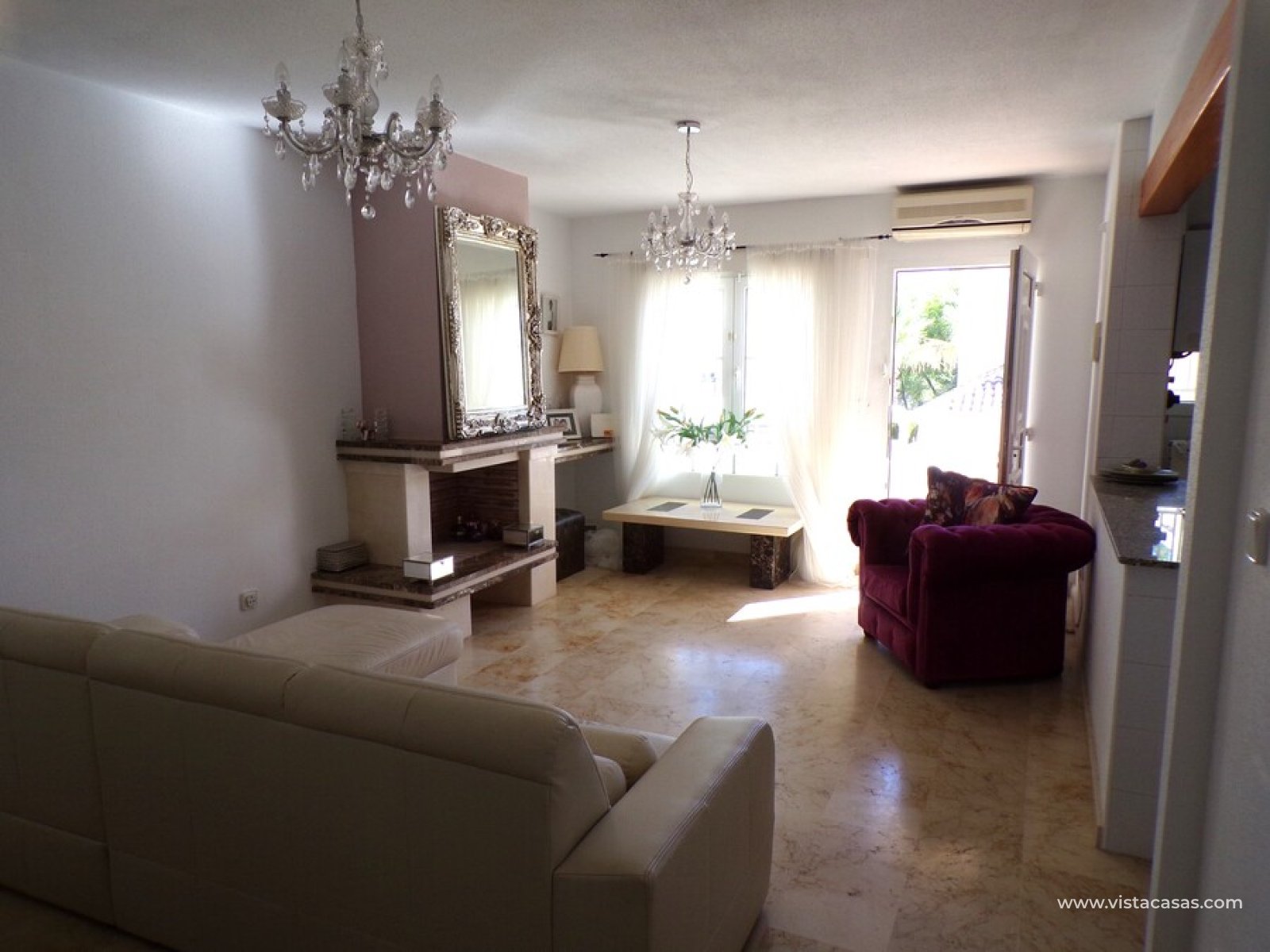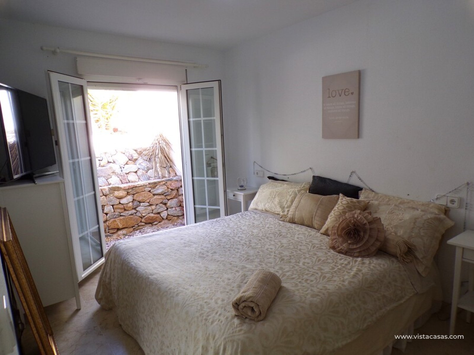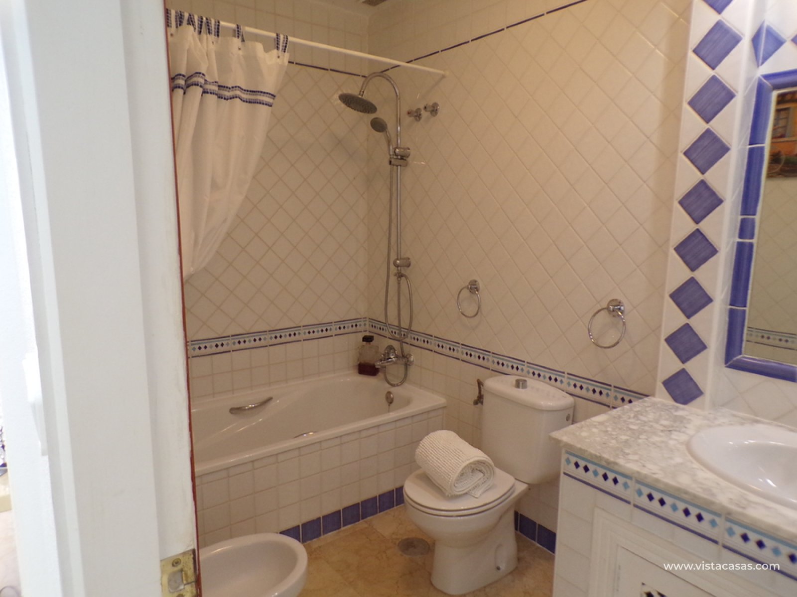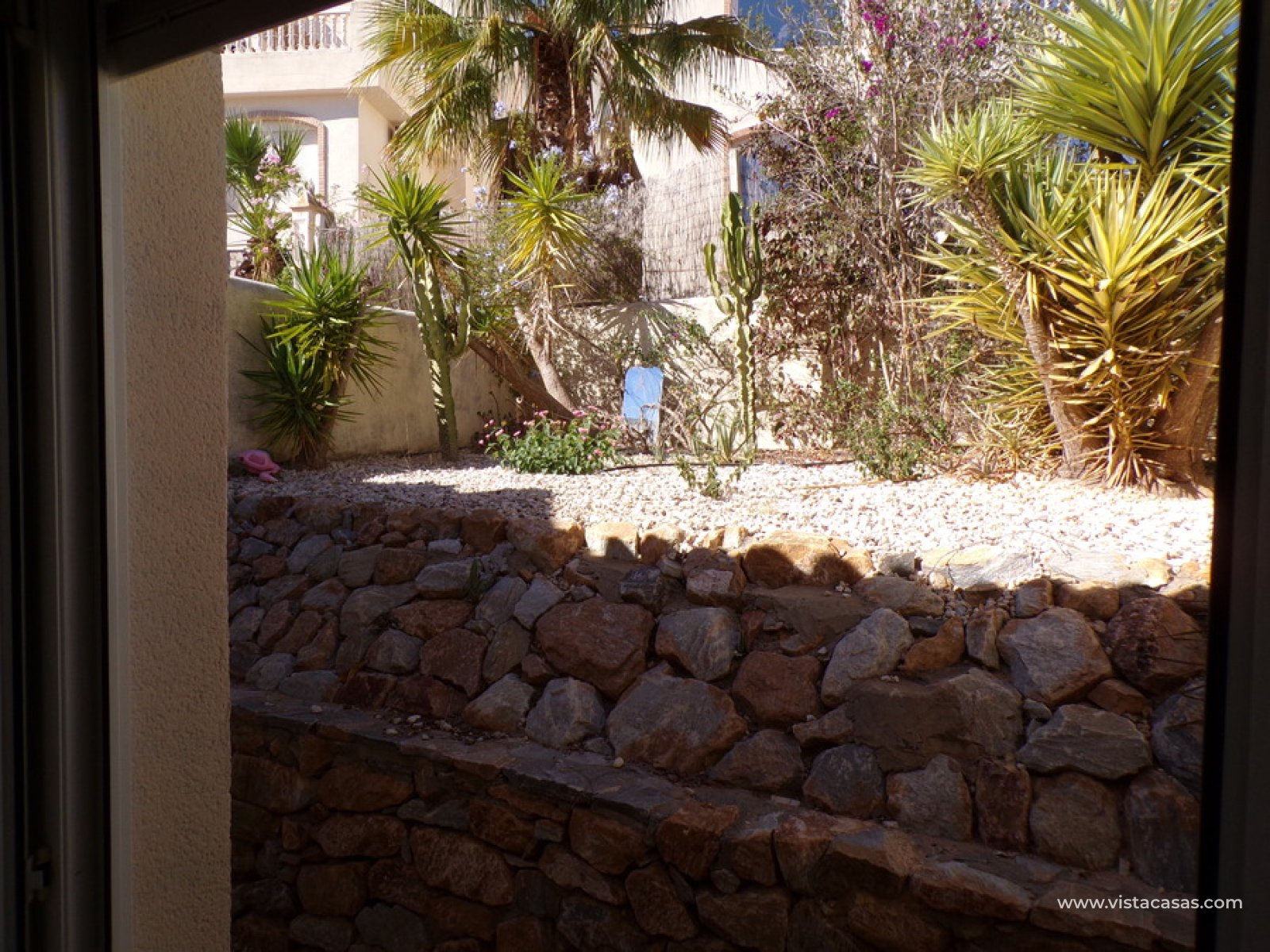 Stunning 3 bed 3 bath Townhouse in Las Ramblas Golf near La Fuente, Orihuela Costa. South East Facing front terrace, leads you into a good size lounge/dining area, with full A/C and an open fireplace. Off the lounge there’s, an open plan American style kitchen, with a range of base and wall units, white goods etc. The property consists of two double bedrooms to this ground floor; both have fitted wardrobes, the master coming with A/c hot and cold plus French doors that take you to the rear garden. There is also an on suite bathroom to the master bedroom with walk in shower. The lower floor also consists of a family bathroom, with full bath and shower over. Up the external stairs, you will find another double bedroom with on-suite, consisting of a walk in shower, there is also a large solarium with some views of the golf course. There is also a nice communal pool just around the corner from the property. The property is situated 2 mins drive from La Fuente commercial centre and only a 1 min drive to the golf club house. This is a fantastic location for plenty of bars restaurants, beaches are a max 10 min drive down the road.