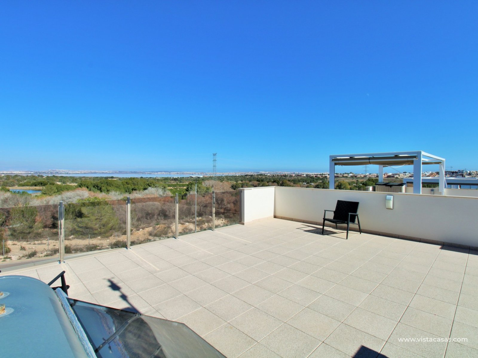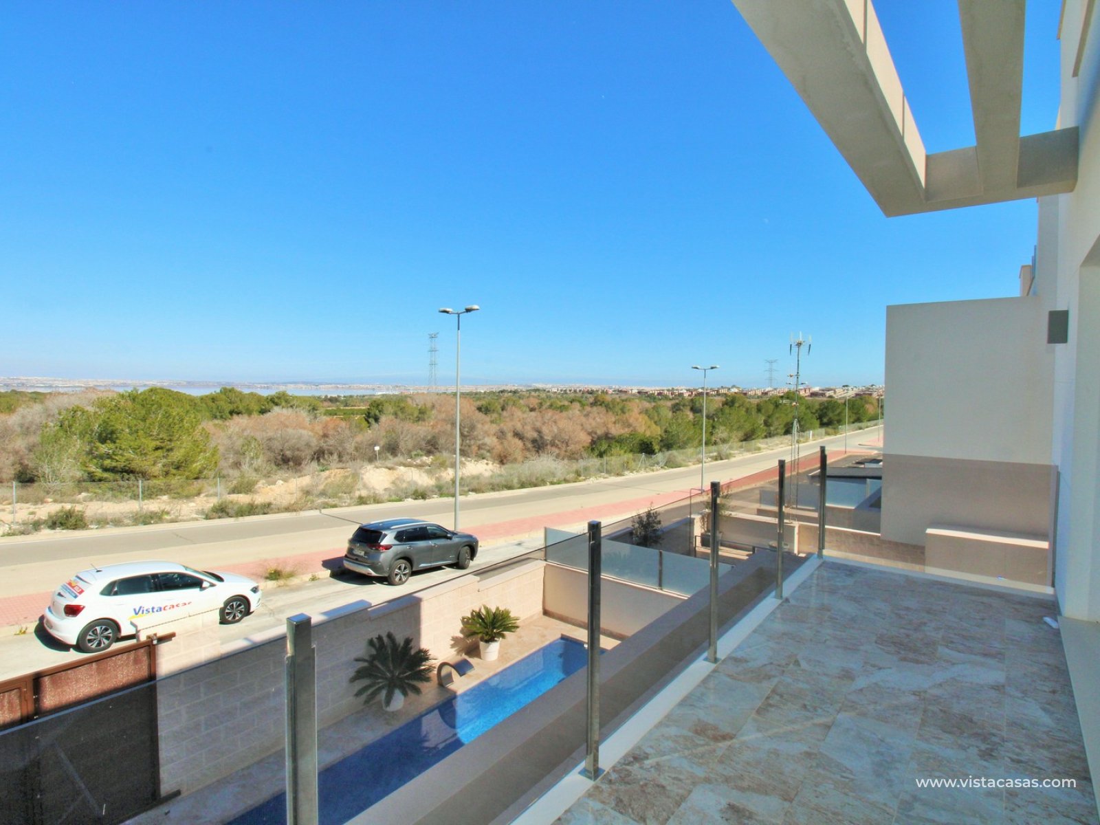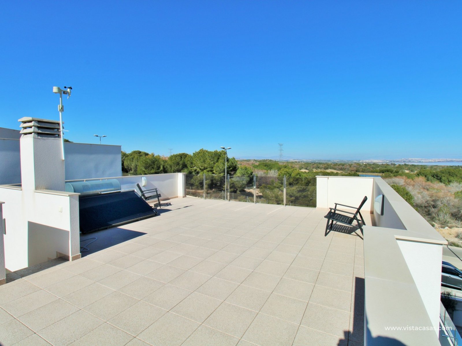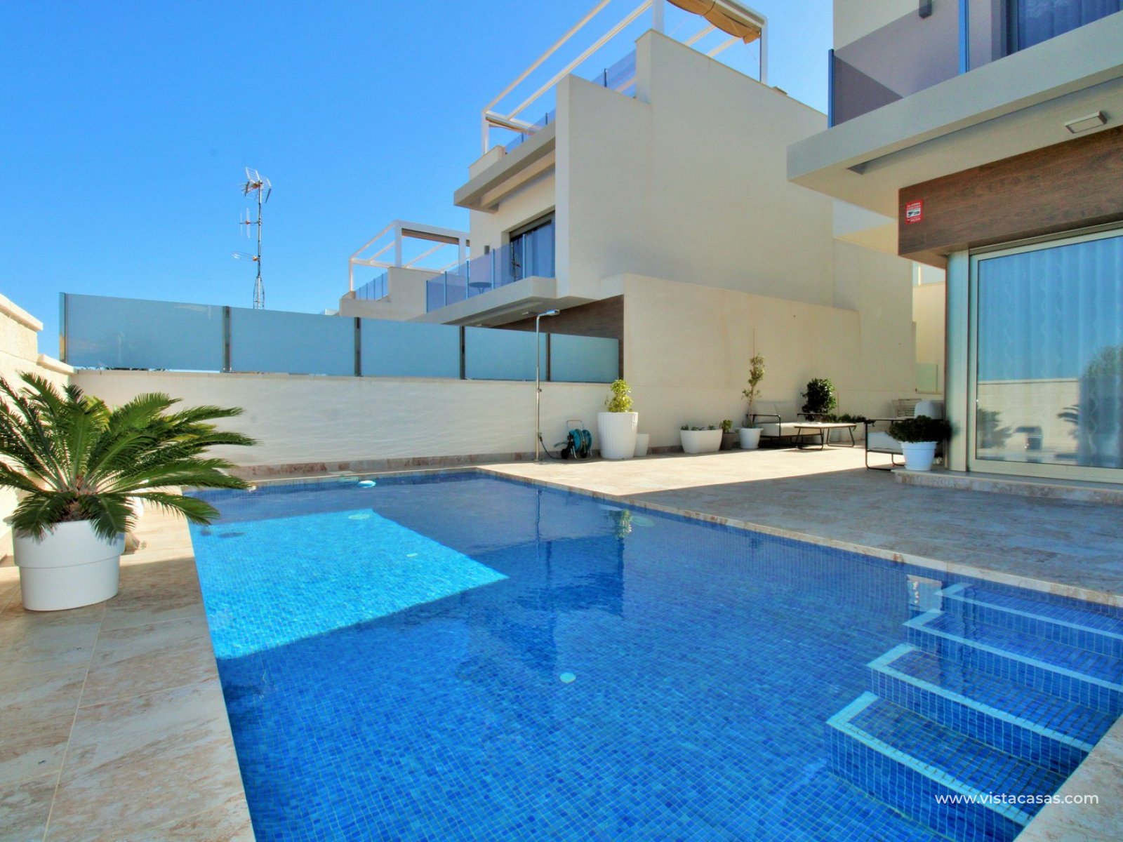 The ground floor comprises of a bright and airy lounge-dining area with a bespoke modern kitchen with built-in appliances (oven, microwave, dishwasher, fridge-freezer...), a downstairs bedroom with fitted wardrobes (currently used as a study/2nd lounge area), and a downstairs bathroom with walk-in shower. Large sliding doors from the living area takes you directly to the pool area. Upstairs there are 2 double bedrooms with fitted wardrobes, both of them offering en-suite bathrooms with walk-in showers, plus access to the front balcony. From the landing area, you can access the massive roof solarium, offering great views of the Torrevieja salt lakes, sea, and surrounding areas. The property is sold with high quality furniture, white goods, and benefits from other extras including; underfloor heating in all bathrooms, ducted air-conditioning throughout, electric blinds, LED lighting, and a solar panel for hot water.