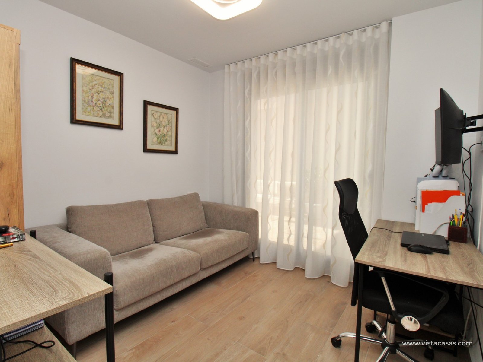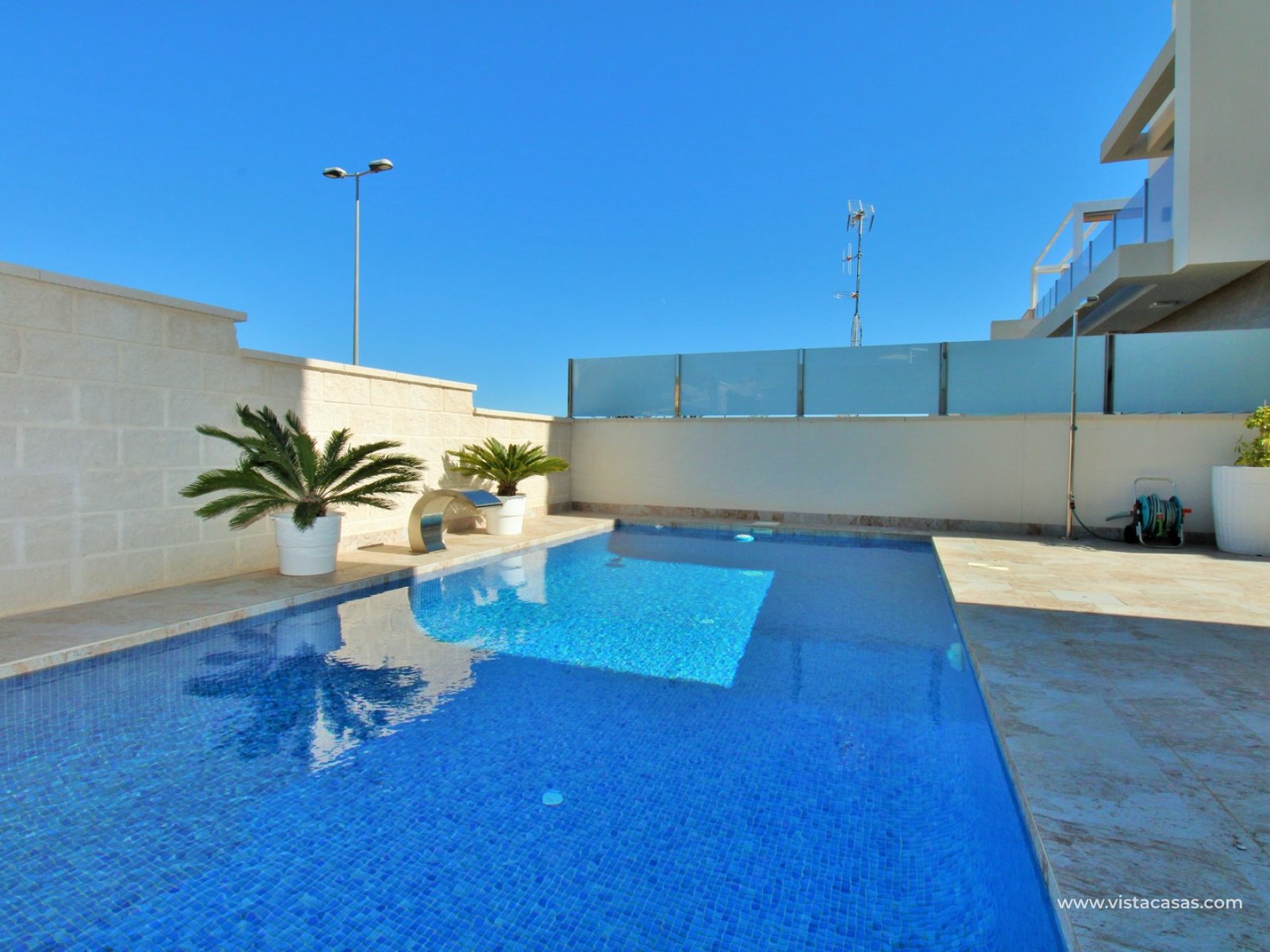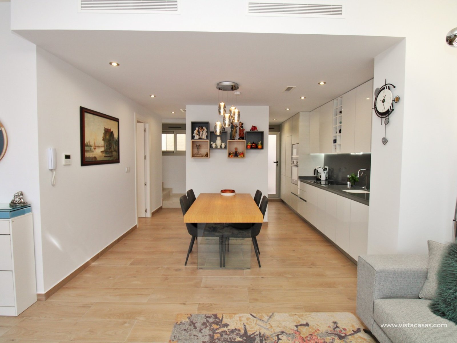 The ground floor comprises of a bright and airy lounge-dining area with a bespoke modern kitchen with built-in appliances (oven, microwave, dishwasher, fridge-freezer...), a downstairs bedroom with fitted wardrobes (currently used as a study/2nd lounge area), and a downstairs bathroom with walk-in shower. Large sliding doors from the living area takes you directly to the pool area. Upstairs there are 2 double bedrooms with fitted wardrobes, both of them offering en-suite bathrooms with walk-in showers, plus access to the front balcony. From the landing area, you can access the massive roof solarium, offering great views of the Torrevieja salt lakes, sea, and surrounding areas. The property is sold with high quality furniture, white goods, and benefits from other extras including; underfloor heating in all bathrooms, ducted air-conditioning throughout, electric blinds, LED lighting, and a solar panel for hot water.
