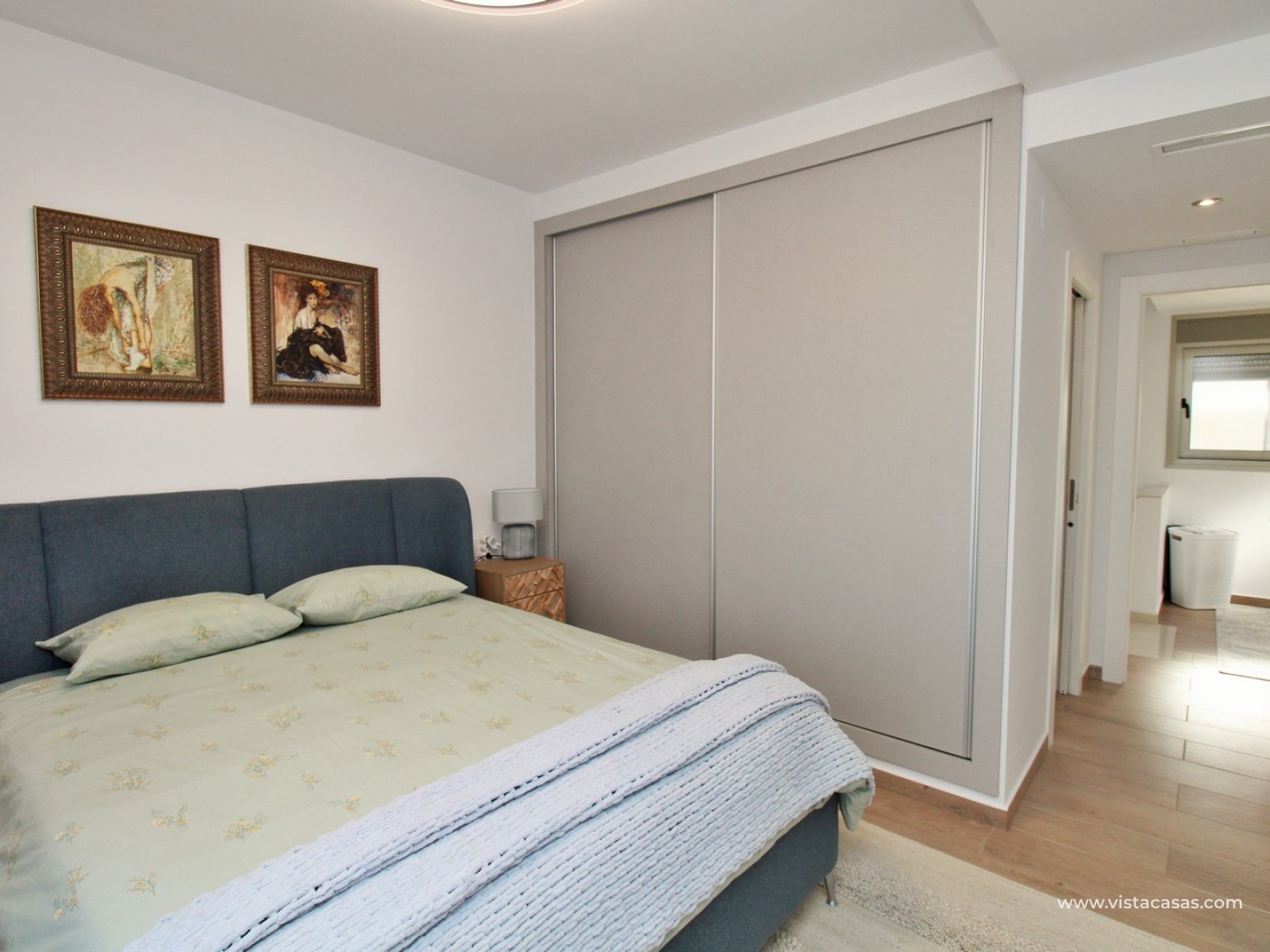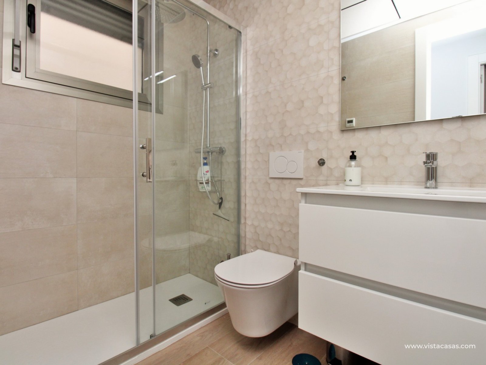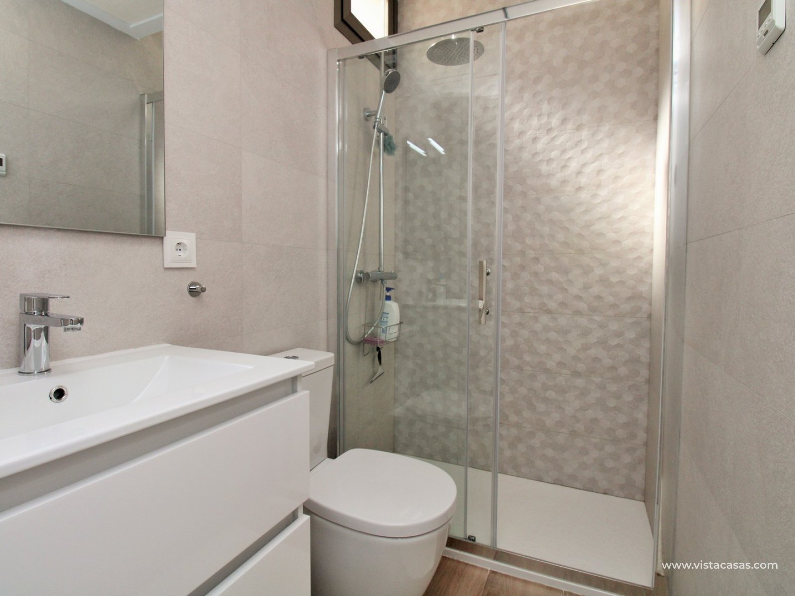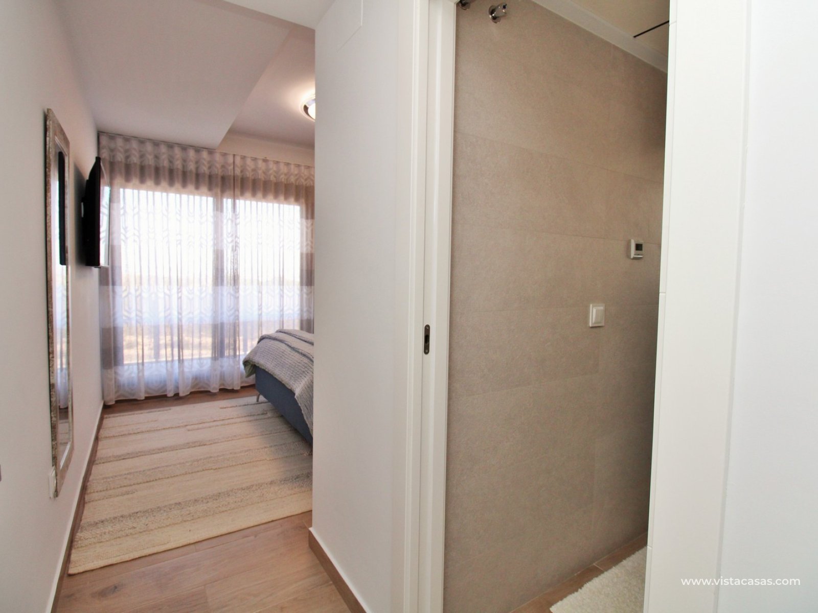 The ground floor comprises of a bright and airy lounge-dining area with a bespoke modern kitchen with built-in appliances (oven, microwave, dishwasher, fridge-freezer...), a downstairs bedroom with fitted wardrobes (currently used as a study/2nd lounge area), and a downstairs bathroom with walk-in shower. Large sliding doors from the living area takes you directly to the pool area. Upstairs there are 2 double bedrooms with fitted wardrobes, both of them offering en-suite bathrooms with walk-in showers, plus access to the front balcony. From the landing area, you can access the massive roof solarium, offering great views of the Torrevieja salt lakes, sea, and surrounding areas. The property is sold with high quality furniture, white goods, and benefits from other extras including; underfloor heating in all bathrooms, ducted air-conditioning throughout, electric blinds, LED lighting, and a solar panel for hot water.
