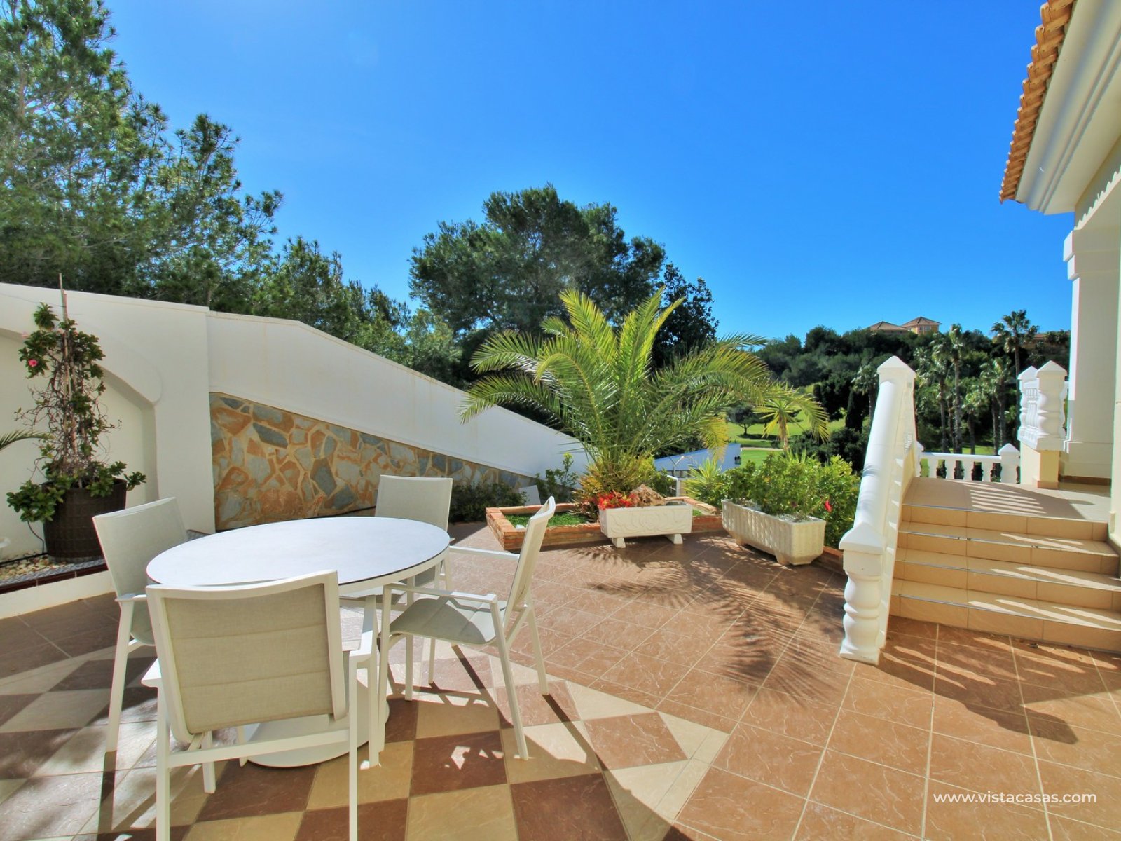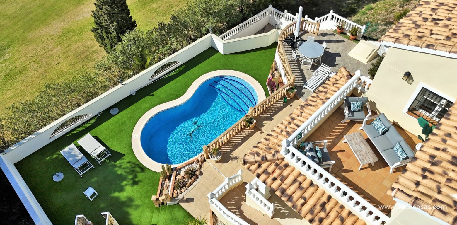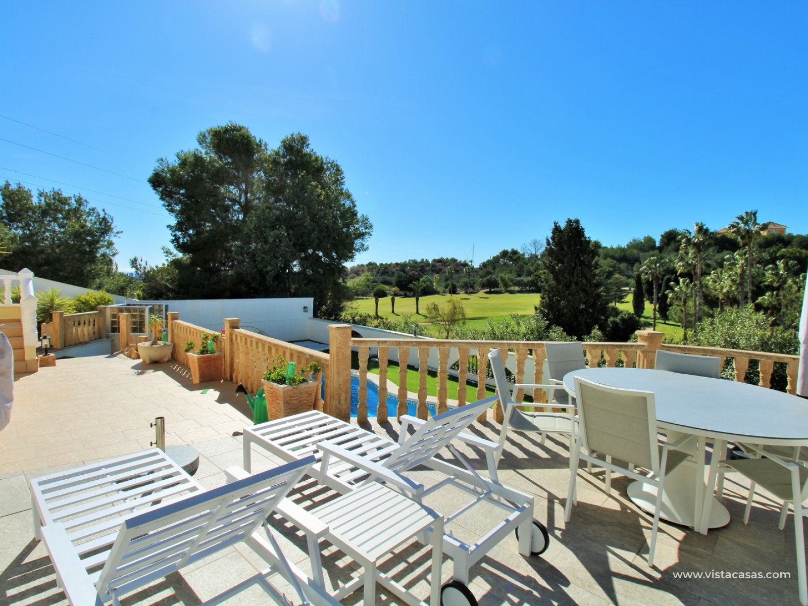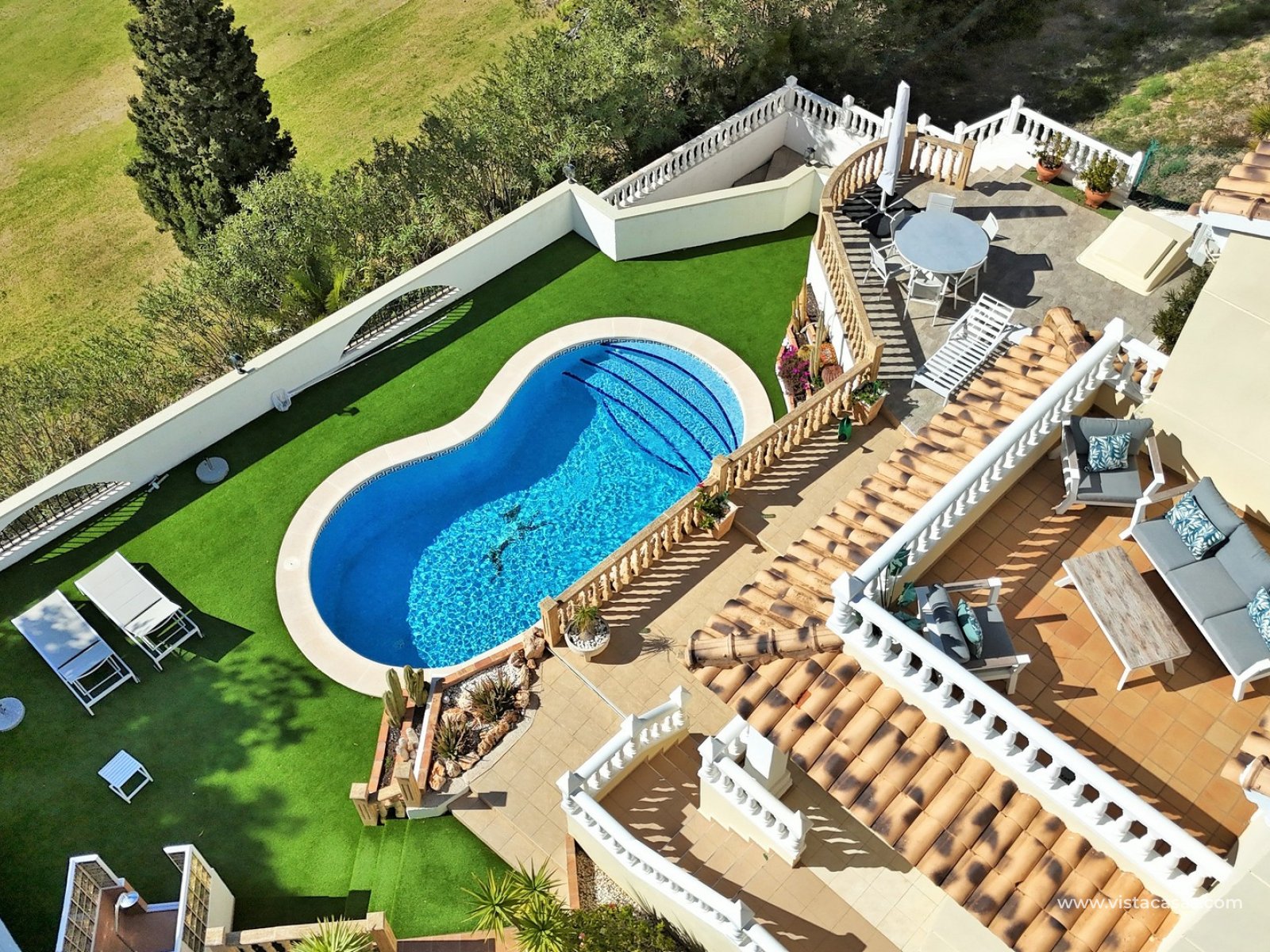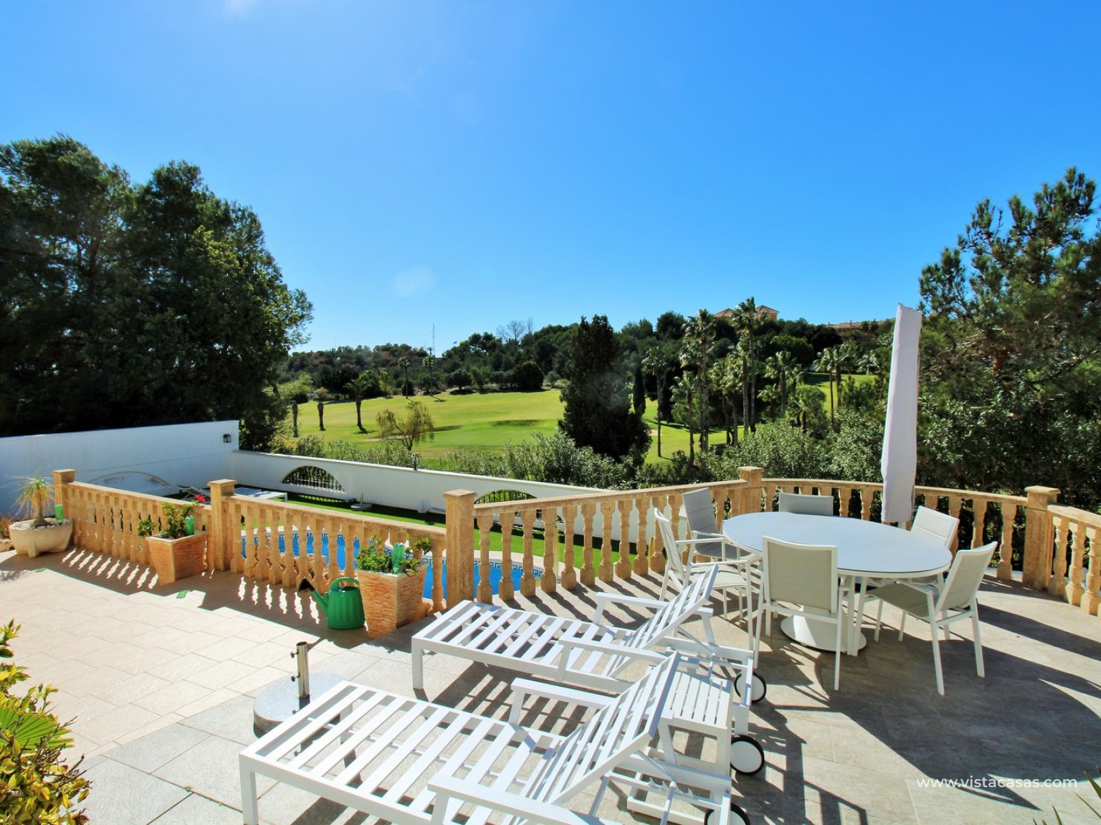 The ground floor features a spacious lounge and dining area with uninterrupted golf course views, a modern kitchen, a double bedroom, and a bathroom. Patio doors lead out to an expansive terrace, a tiered garden, and a private pool, creating the perfect setting for outdoor relaxation. Upstairs, there are three generously sized bedrooms, including a master suite with an en-suite bathroom and a private terrace overlooking the garden. A second family bathroom serves the remaining bedrooms. Located on a quiet cul-de-sac, this property also benefits from a private garage and a beautifully landscaped garden. Whether you're looking for a permanent residence or a luxurious holiday home, this villa is a must-see.