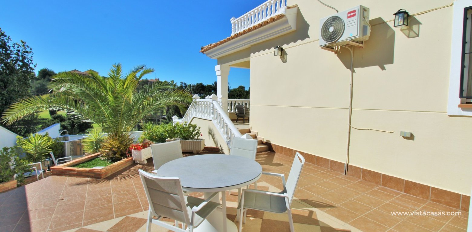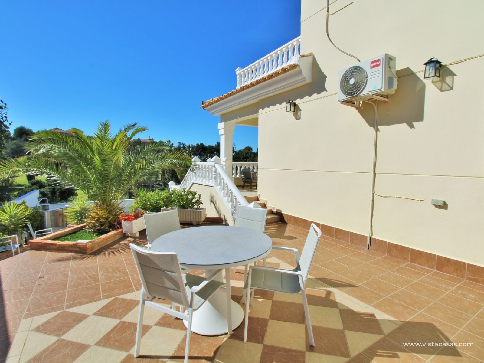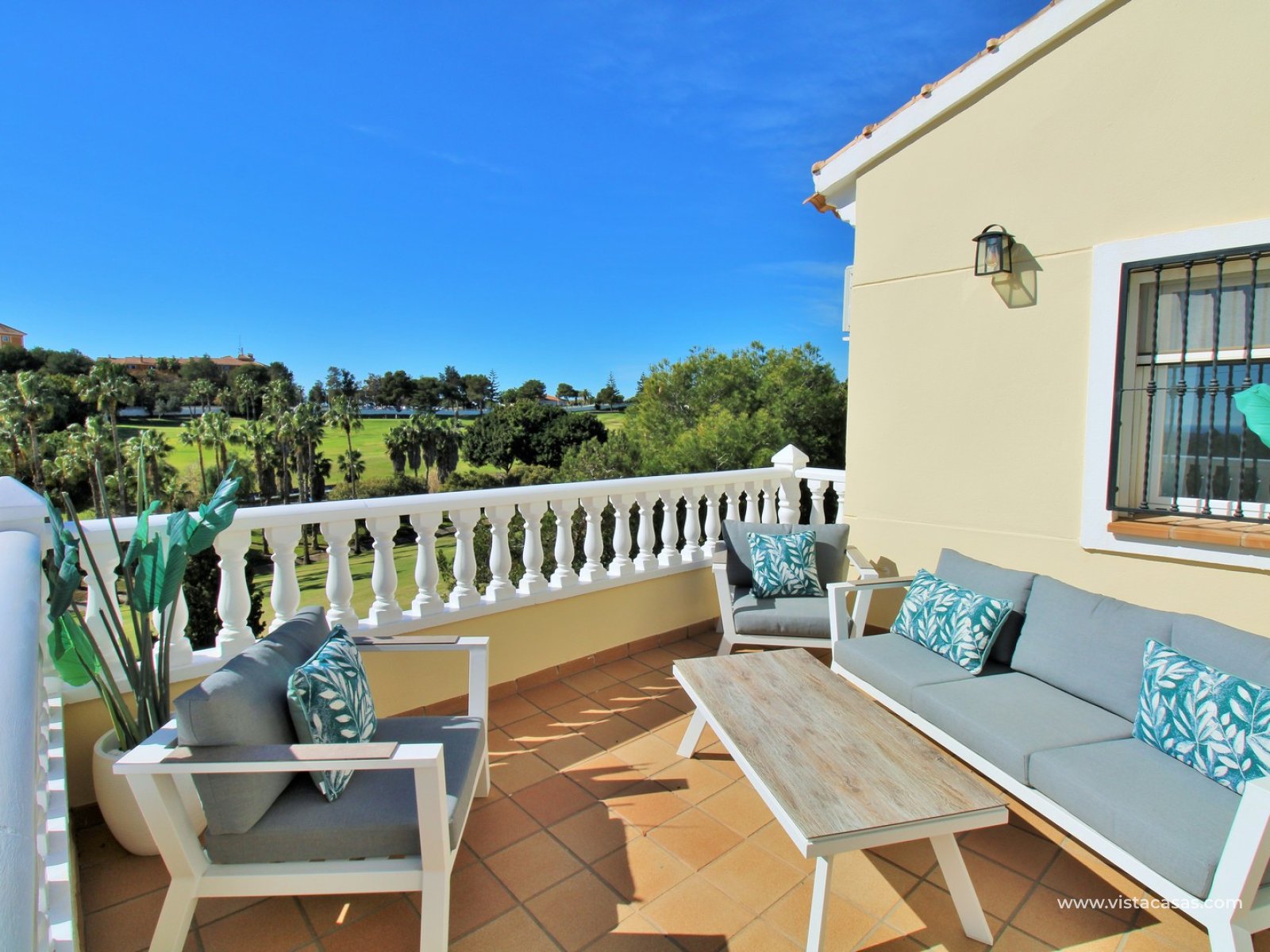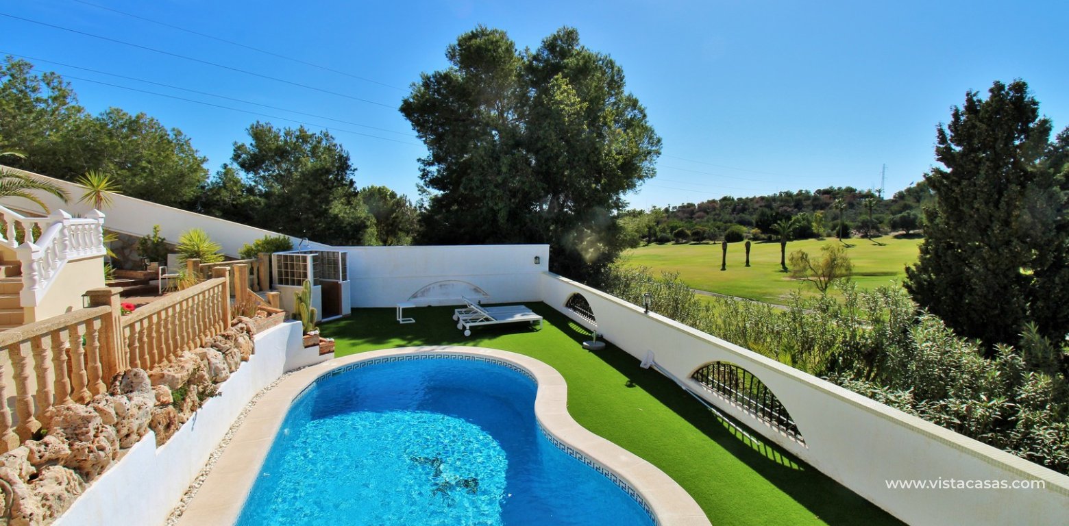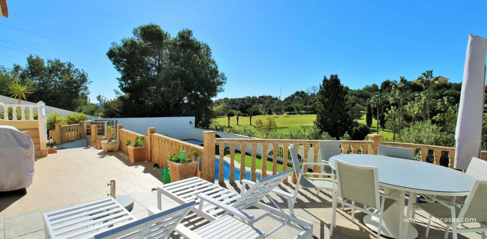 The ground floor features a spacious lounge and dining area with uninterrupted golf course views, a modern kitchen, a double bedroom, and a bathroom. Patio doors lead out to an expansive terrace, a tiered garden, and a private pool, creating the perfect setting for outdoor relaxation. Upstairs, there are three generously sized bedrooms, including a master suite with an en-suite bathroom and a private terrace overlooking the garden. A second family bathroom serves the remaining bedrooms. Located on a quiet cul-de-sac, this property also benefits from a private garage and a beautifully landscaped garden. Whether you're looking for a permanent residence or a luxurious holiday home, this villa is a must-see.