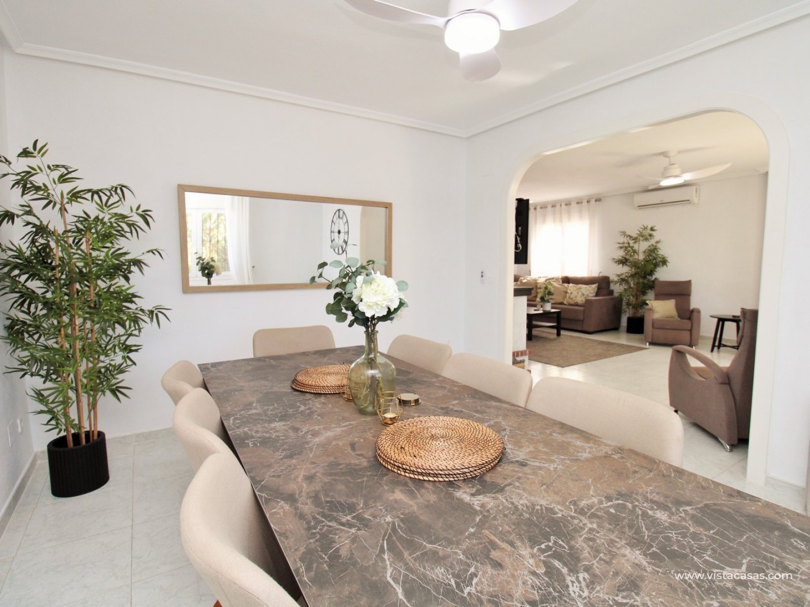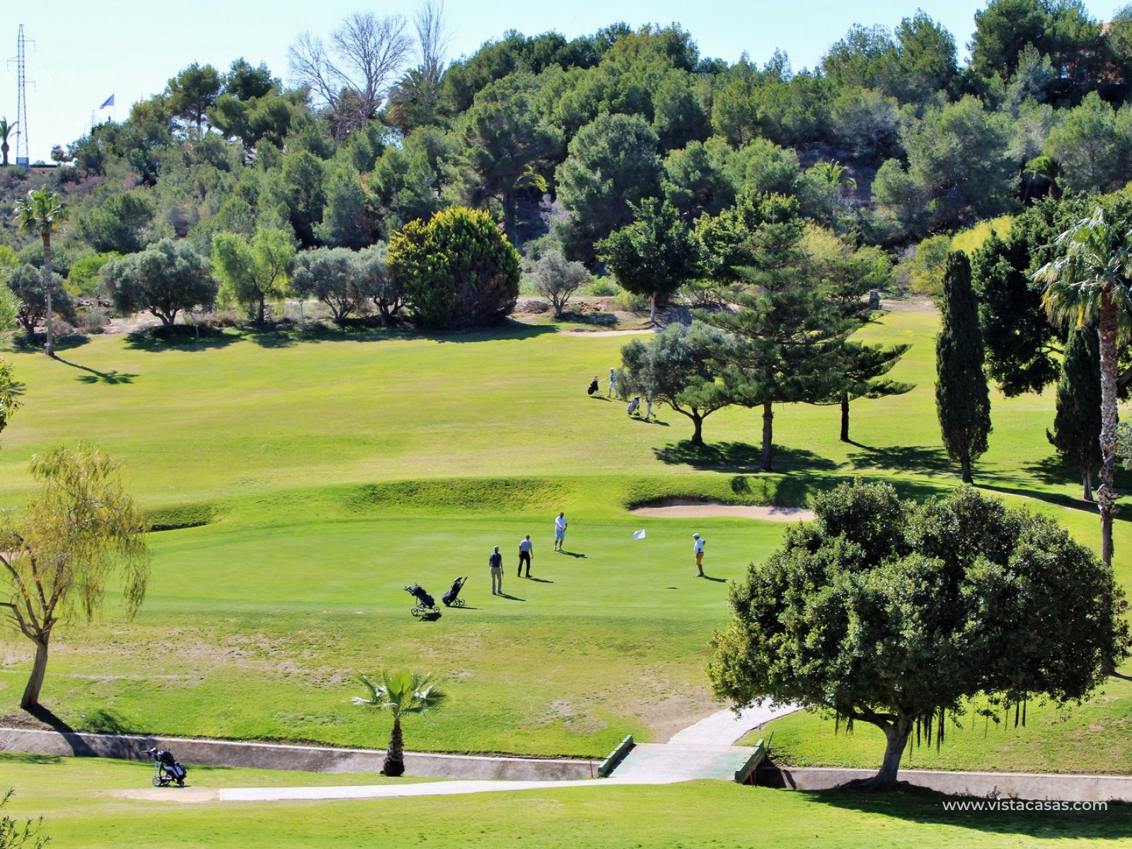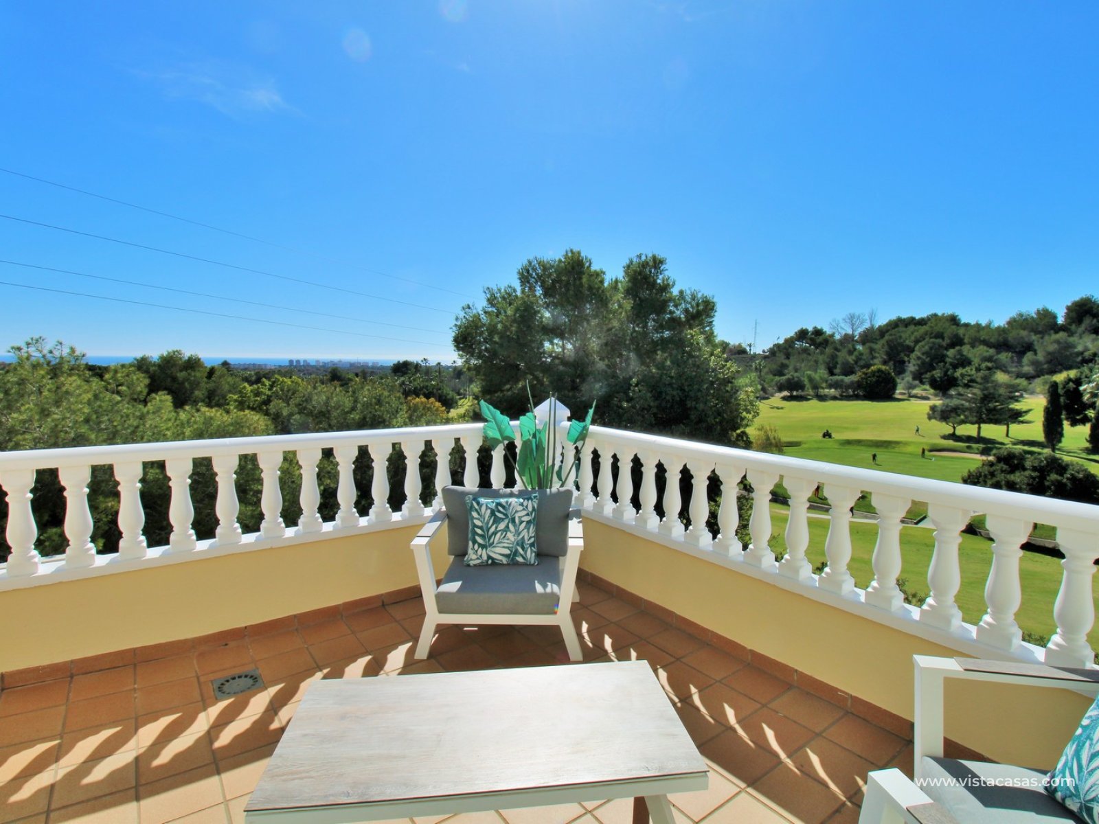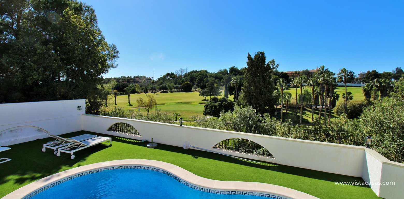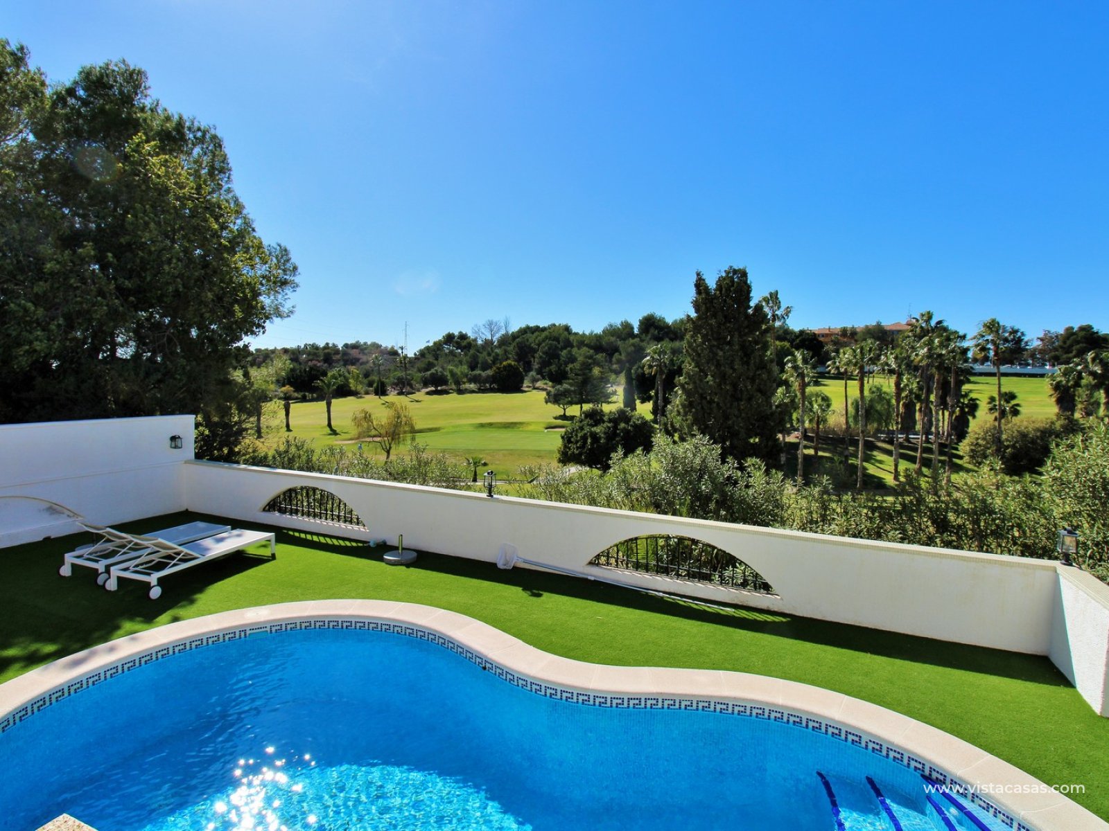 This beautifully updated front-line villa offers an unrivalled position on Campoamor Golf Course, with stunning elevated views over the 9th fairway, 8th green, and 1st tee, extending towards the coastline. Set on a 600m² plot with a 150m² build, the villa has been extensively upgraded for comfort and security. Recent improvements include a new alarm system with window grate alarms, new air conditioning throughout, and electric shutters. The pool has been refurbished, including regrouting, new coping stones, fresh astro turf, a new pump, and an air source heat pump for the pool. Inside, the home features three modern shower rooms, a fully refurbished kitchen by Costa Kitchens, and new ceiling fans. The entire property, both inside and out, has been freshly painted, complemented by new external lighting and a new irrigation system. Additionally, an electric garage door enhances convenience.