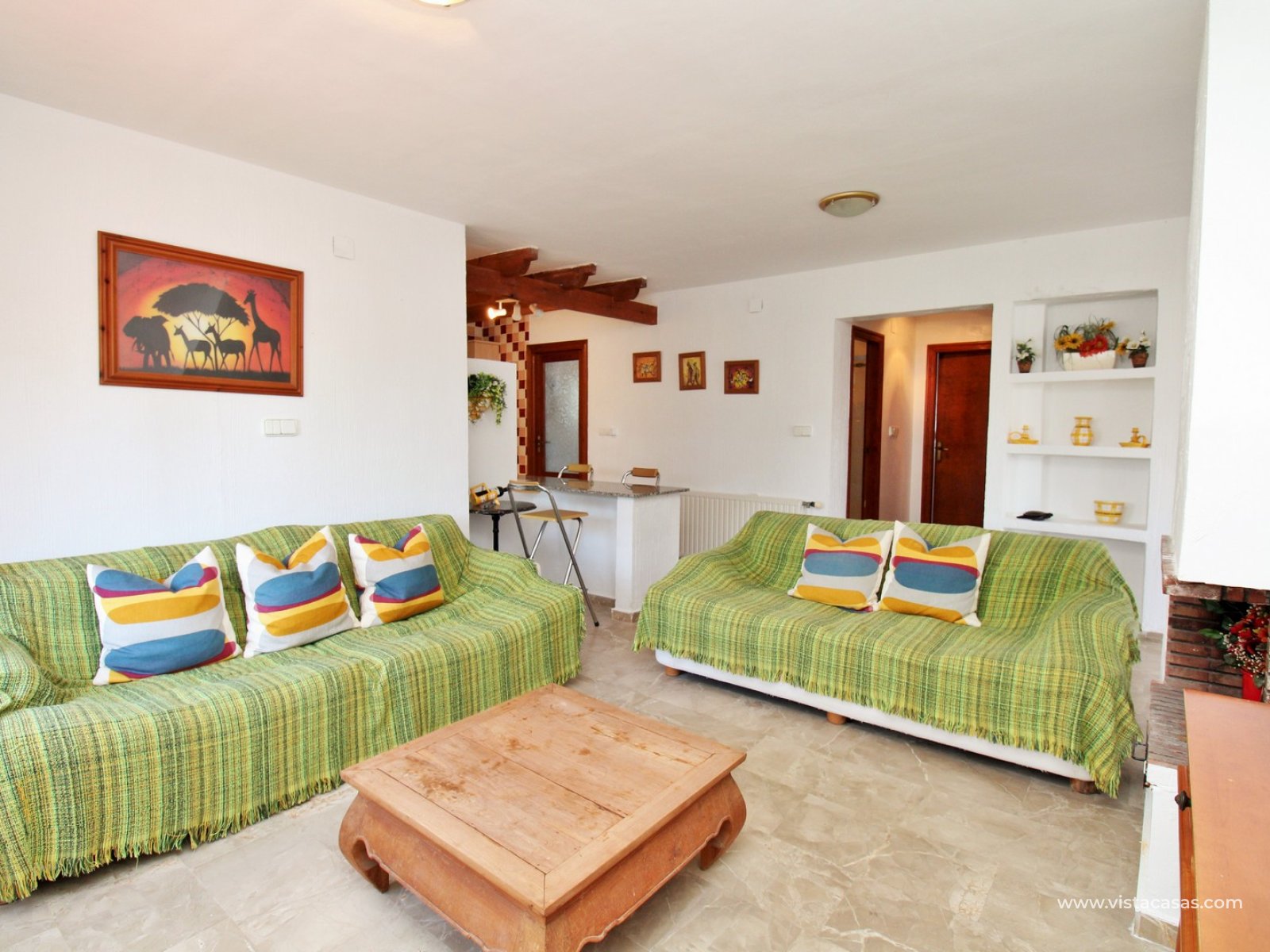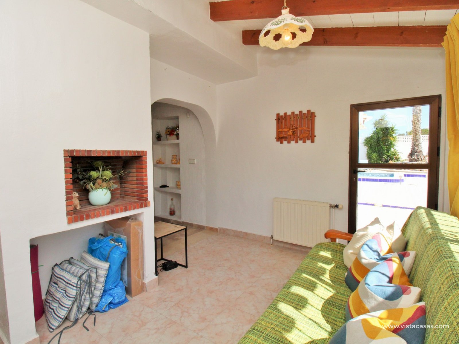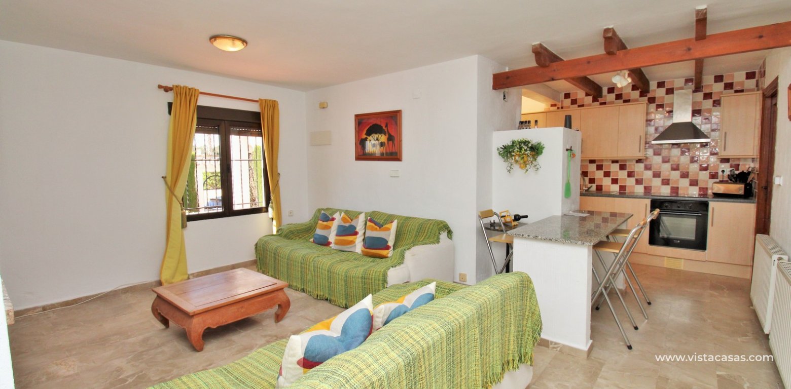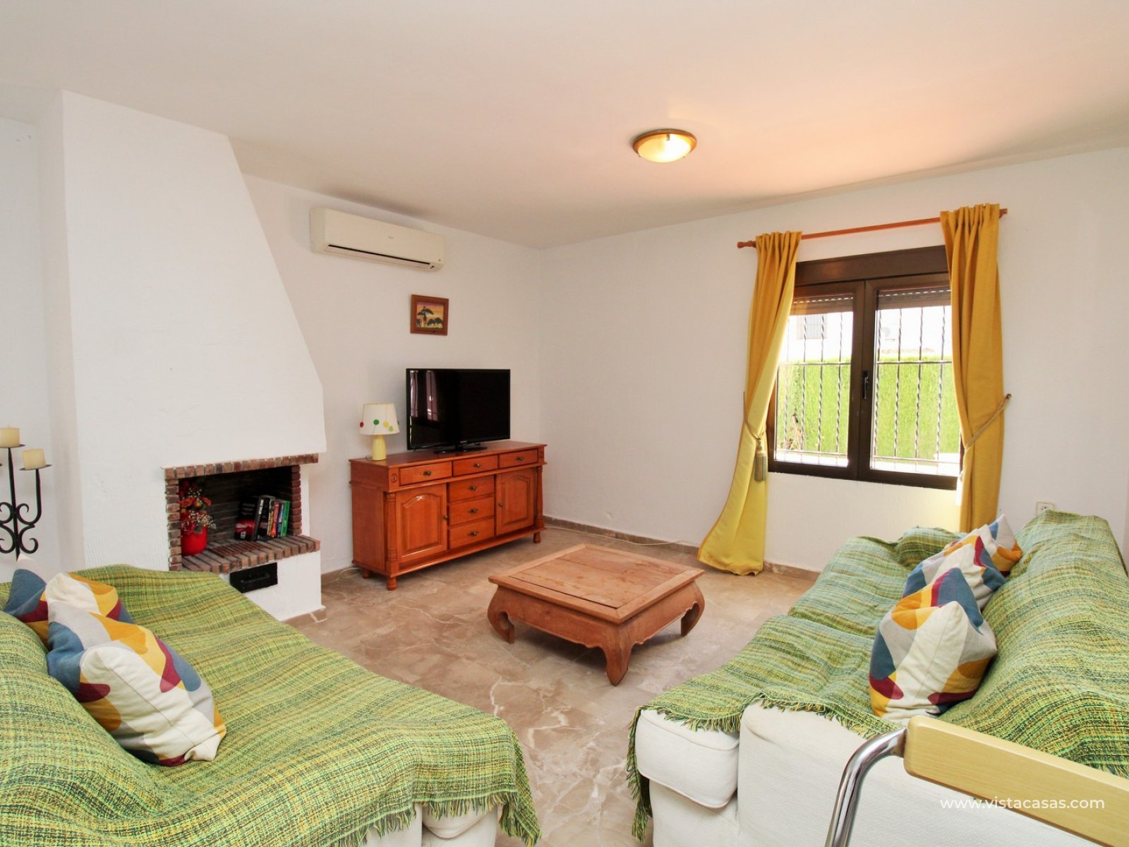 Inside, the accommodation is arranged over one level. An entrance hallway leads into a bright lounge and dining area, complete with feature fireplace, and a separate fitted kitchen. A small hallway connects two double bedrooms with built-in wardrobes, a family bathroom, and a second bathroom with walk-in shower and utility area. There is a second living area just off the main lounge, which could be converted into a third bedroom if desired. The property benefits from air conditioning and gas-oil central heating and is offered furnished, including white goods.