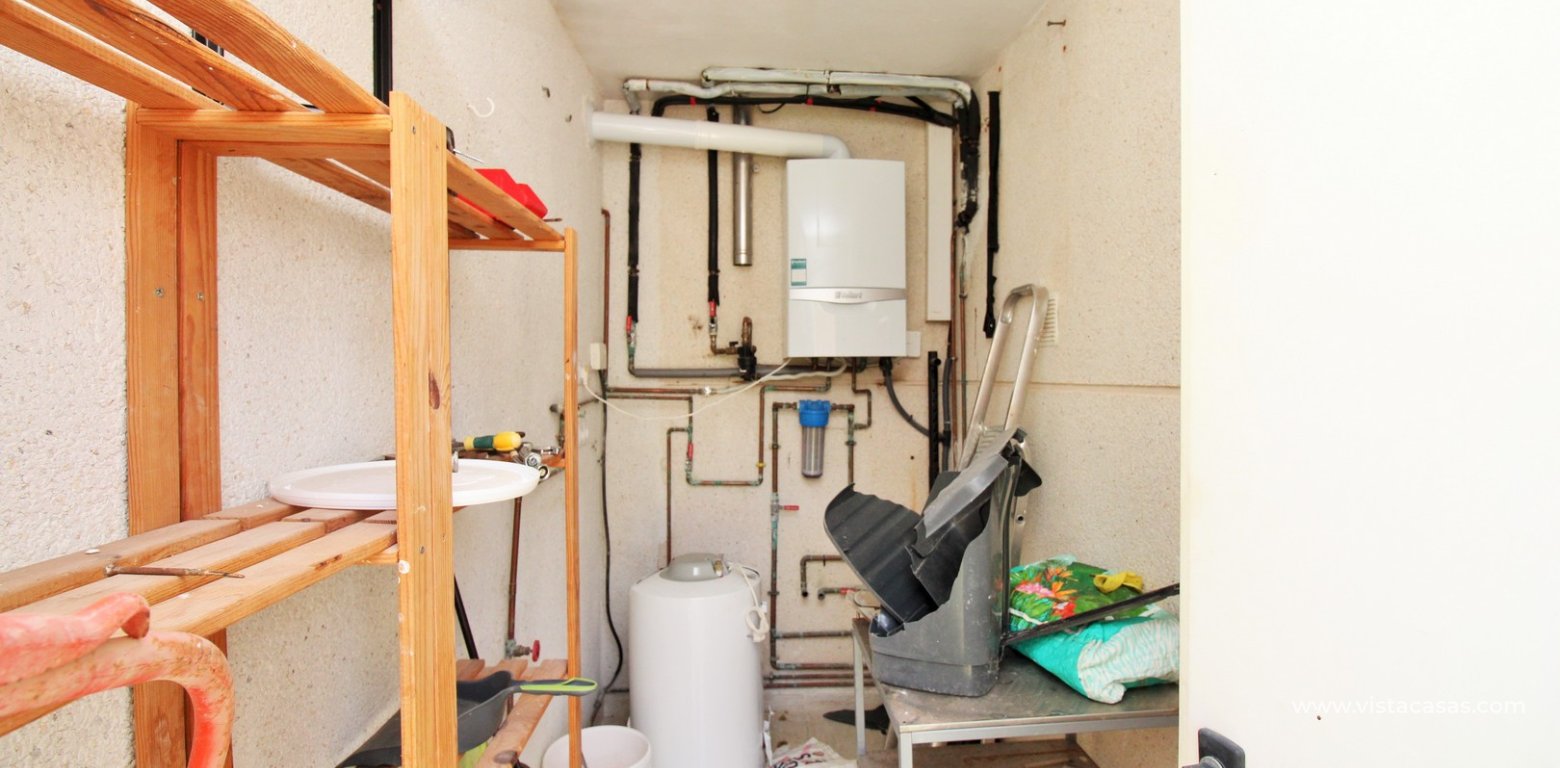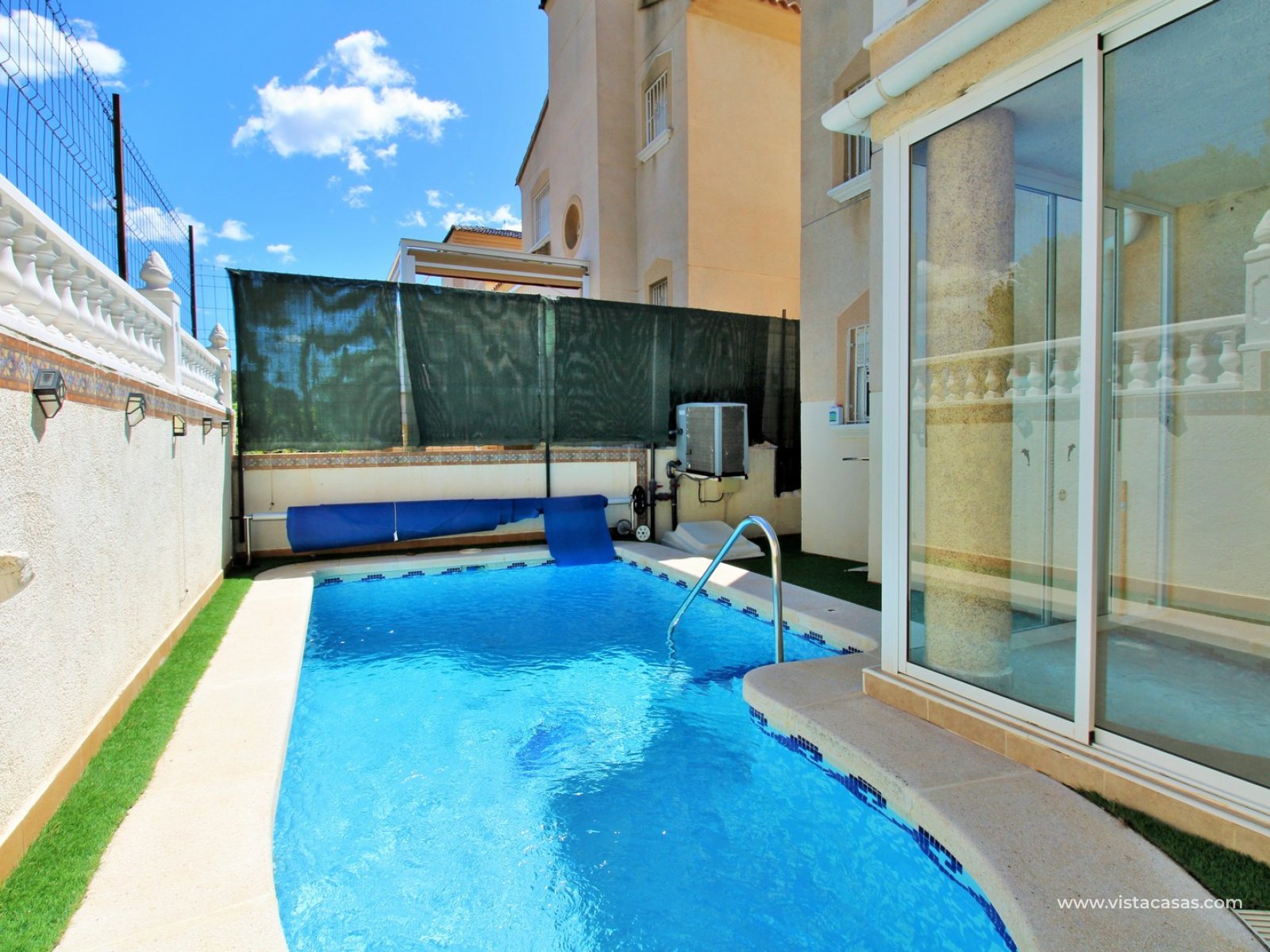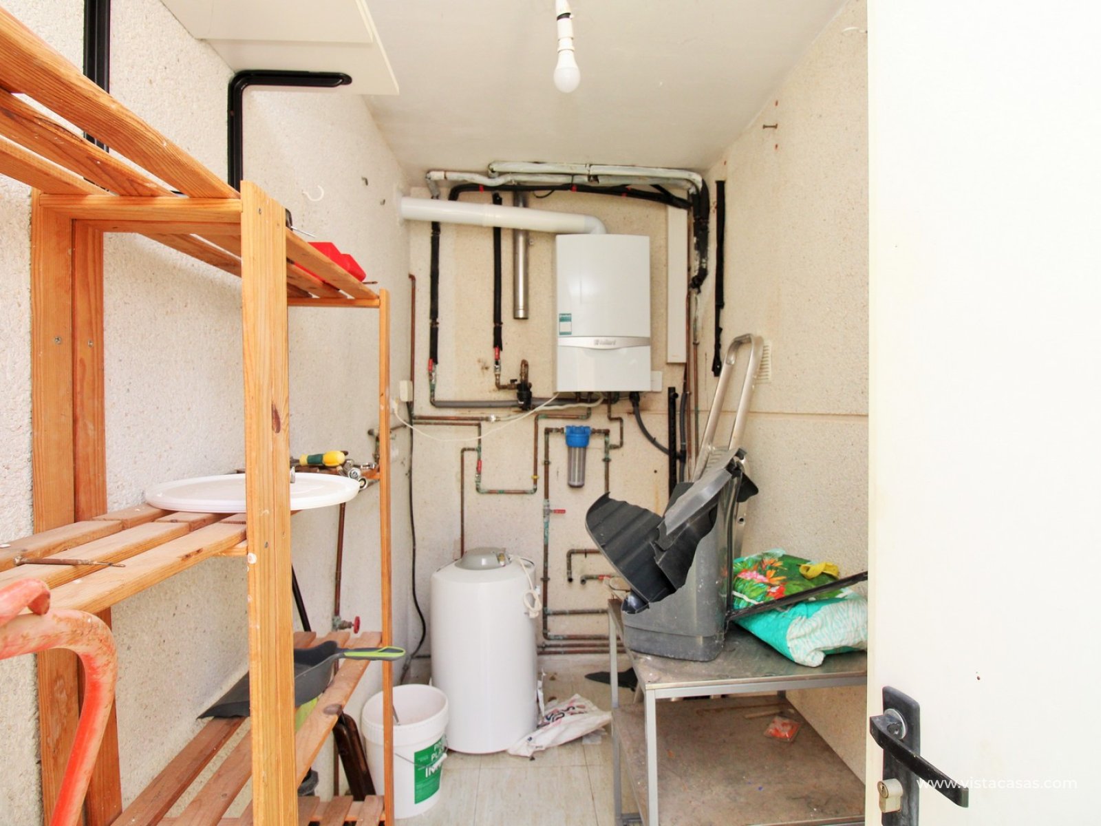 Additional features include a garden to the front and side with off-road parking, a storage room, hot and cold air conditioning throughout, gas central heating, a pellet burner for added comfort, and access to a well-maintained communal pool.