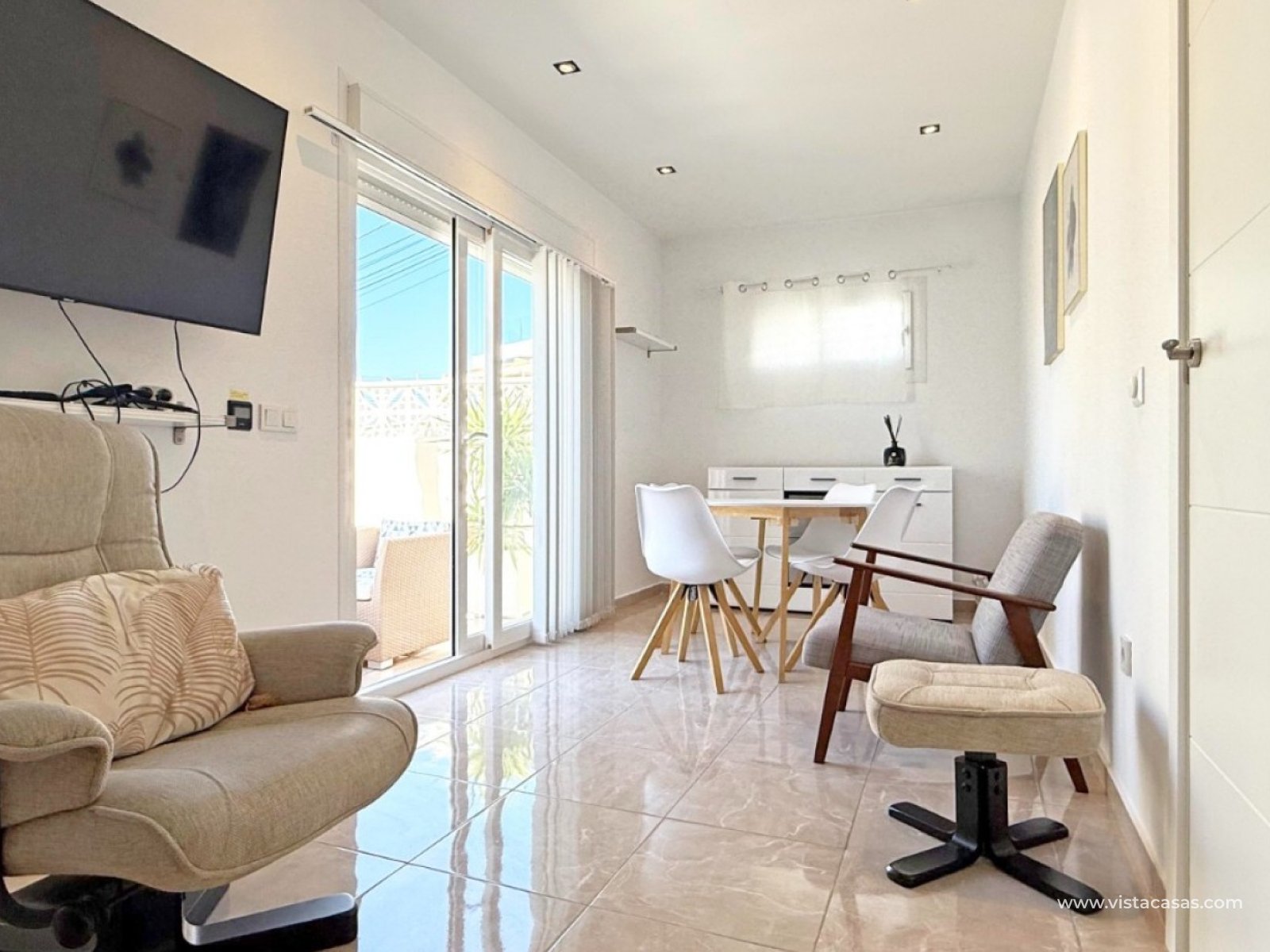 Discover this beautifully renovated ground floor bungalow, ideally located in a gated community in sought-after Torrelamata. Boasting a corner position with a spacious south-facing terrace, this home is perfect for enjoying the Mediterranean sunshine all year round. Inside, the property features 2 bedrooms and 1 modern bathroom, a large, bright living room, and a welcoming open-plan kitchen and dining area. A lovely conservatory adds extra living space, ideal for relaxing or entertaining. The home is sold fully furnished, and includes a private storage room for added convenience. The well-maintained community offers two beautiful pool areas—perfect for cooling off on warm days. Whether you're looking for a holiday retreat or a comfortable year-round home, this bungalow offers a perfect blend of comfort, style, and location.
