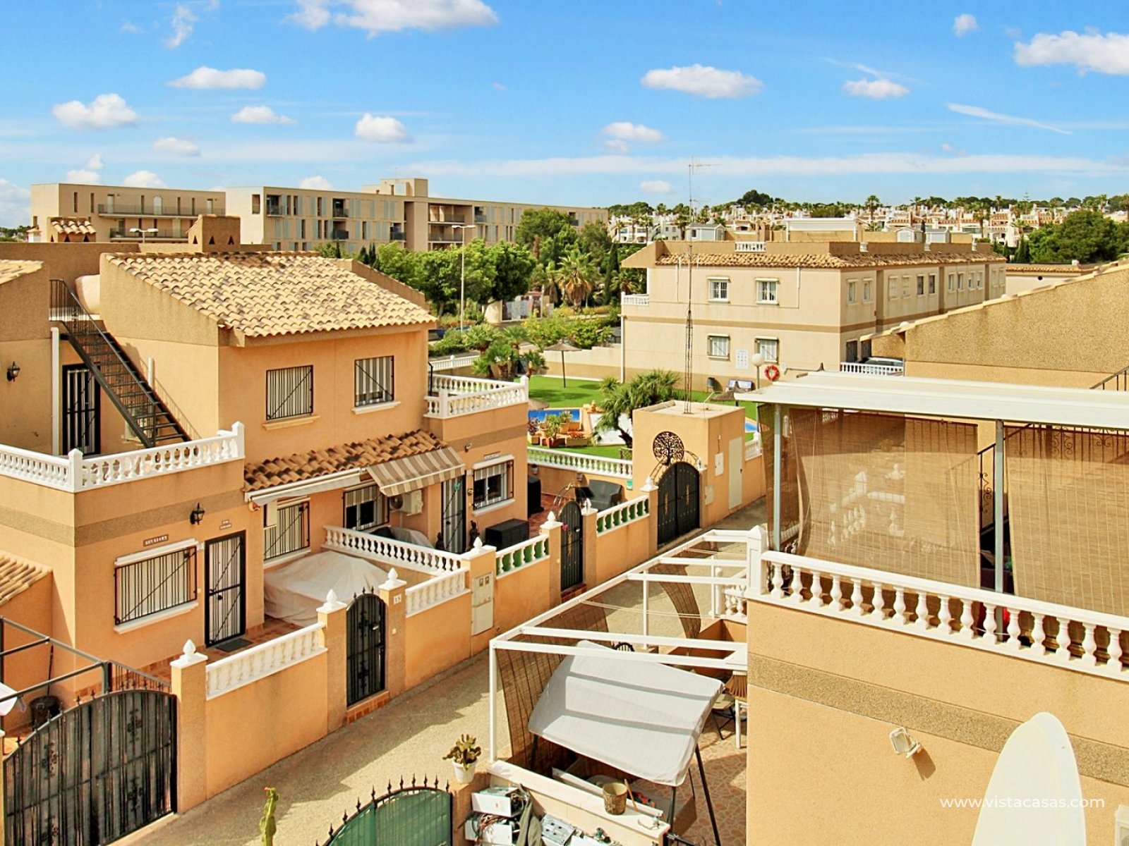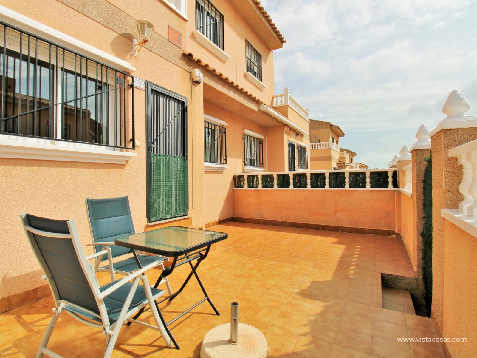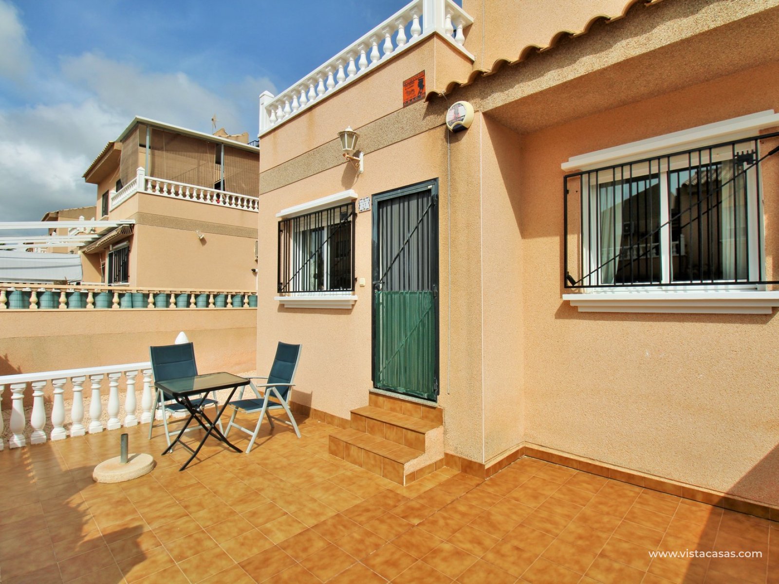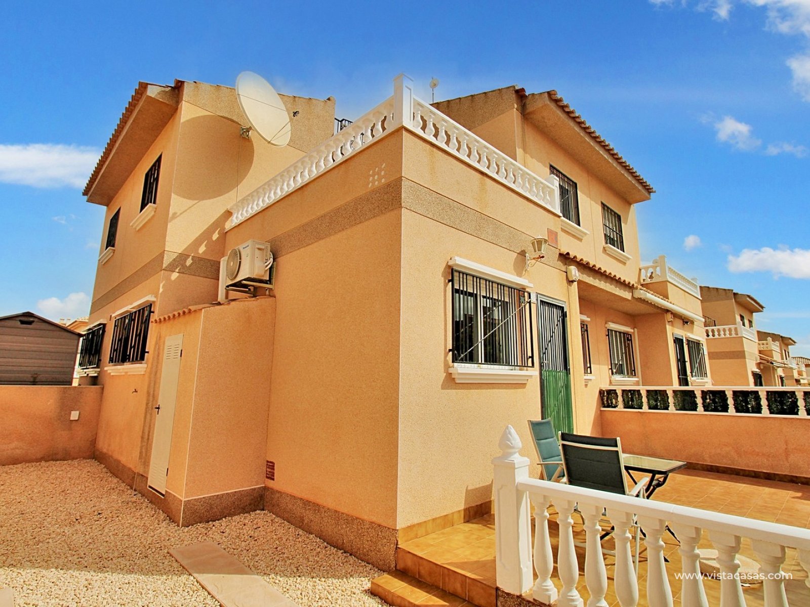 The ground floor comprises a comfortable lounge and dining area with an open-plan kitchen and adjoining utility space, one double bedroom, a modern bathroom with walk-in shower, and a useful under-stairs storage cupboard. Upstairs, there are two further double bedrooms with fitted wardrobes, a family bathroom, and access to a sunny balcony leading up to the rooftop solarium. The property is sold furnished, including white goods and air conditioning. It forms part of a well-kept community with a communal pool close by.