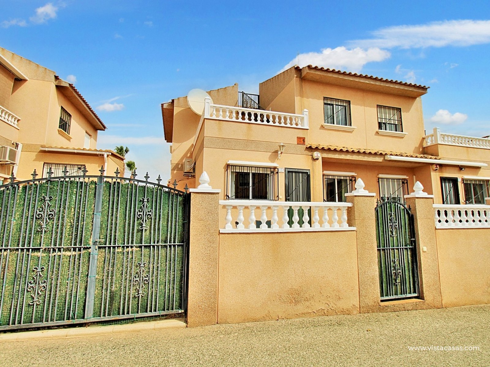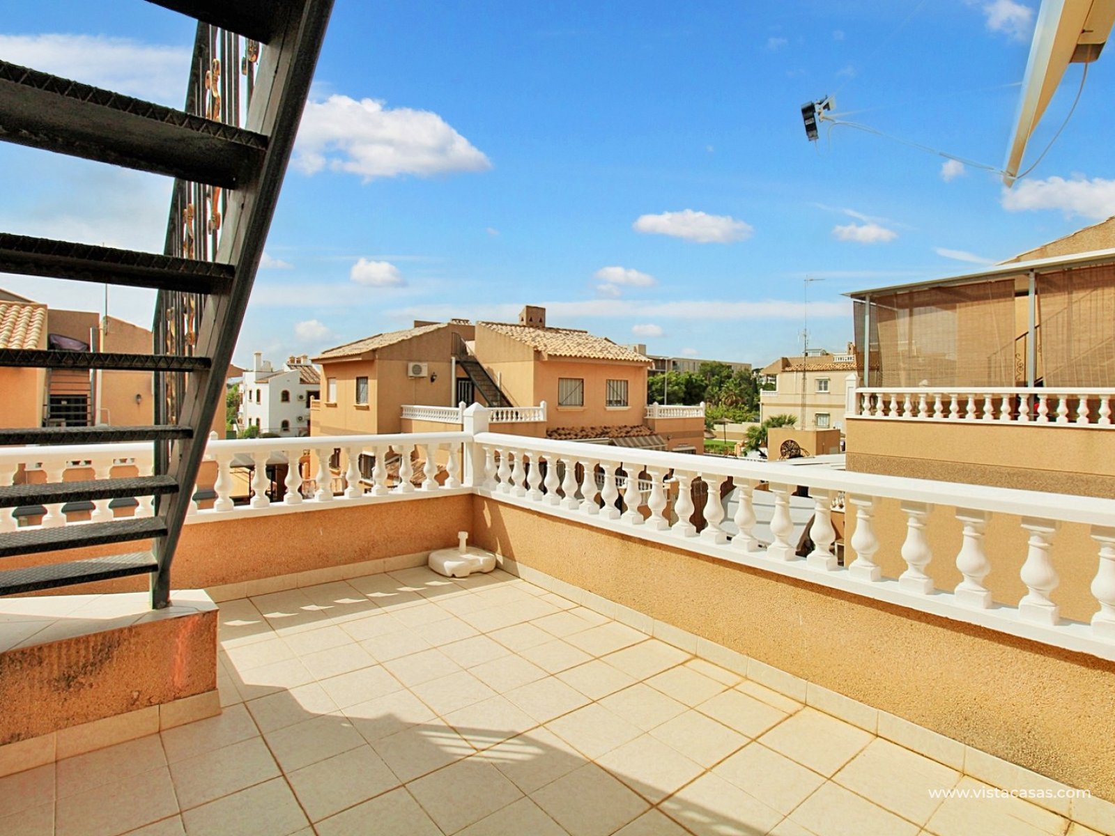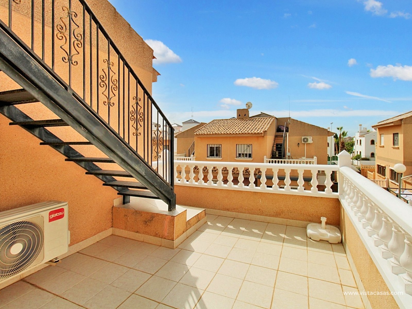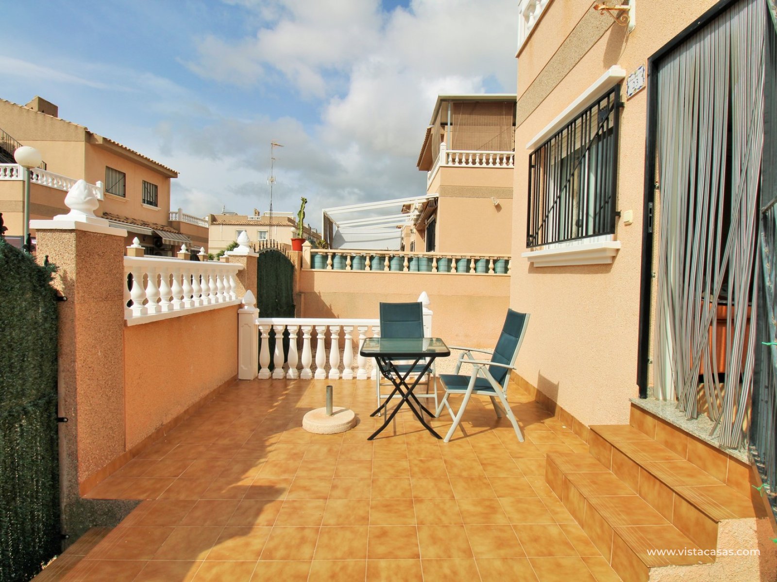 The ground floor comprises a comfortable lounge and dining area with an open-plan kitchen and adjoining utility space, one double bedroom, a modern bathroom with walk-in shower, and a useful under-stairs storage cupboard. Upstairs, there are two further double bedrooms with fitted wardrobes, a family bathroom, and access to a sunny balcony leading up to the rooftop solarium. The property is sold furnished, including white goods and air conditioning. It forms part of a well-kept community with a communal pool close by.