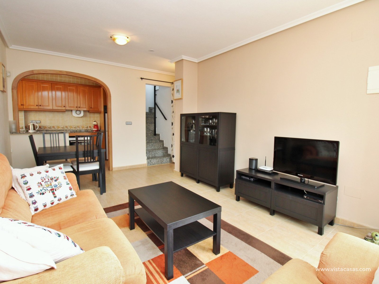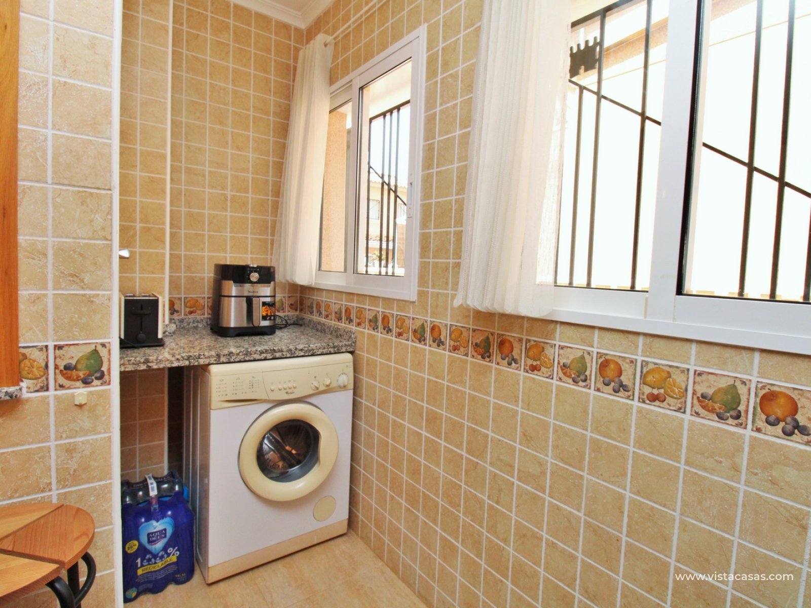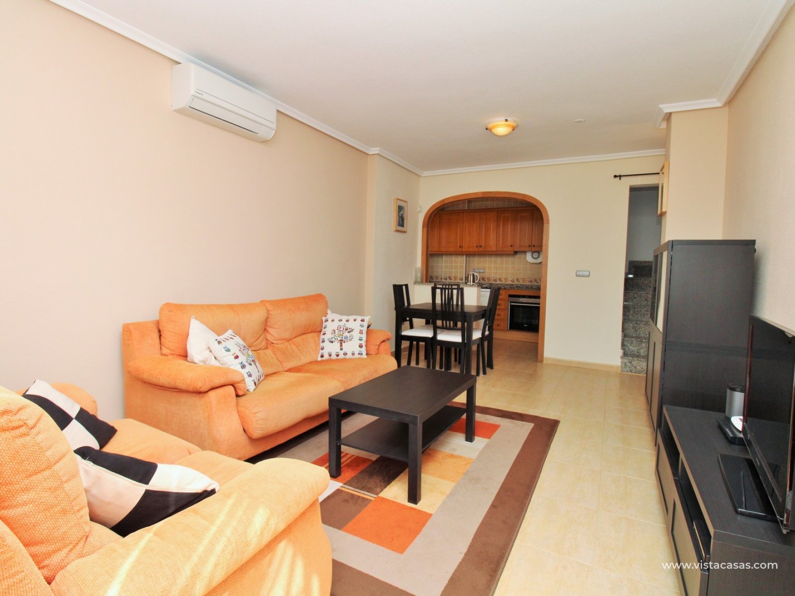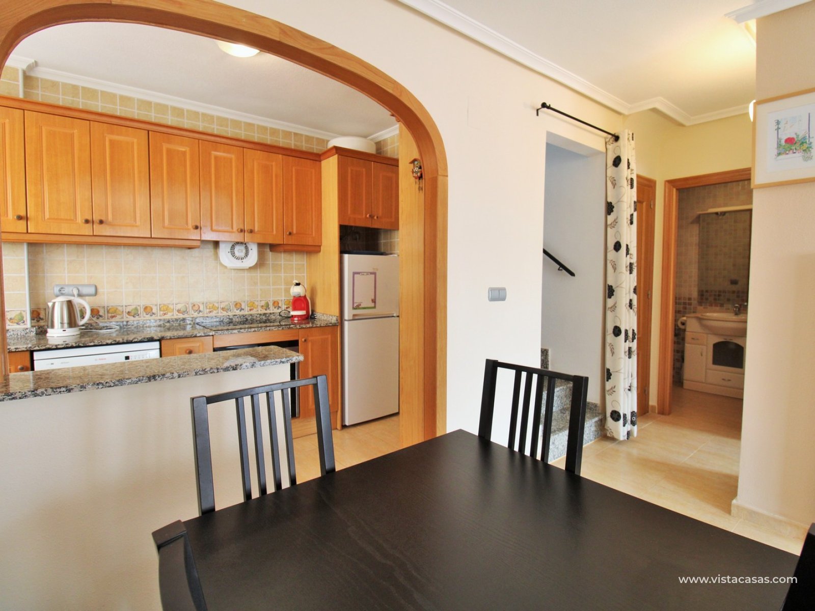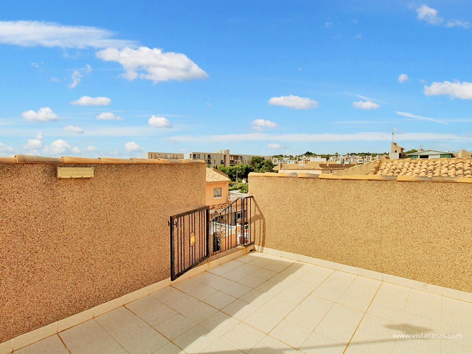 The ground floor comprises a comfortable lounge and dining area with an open-plan kitchen and adjoining utility space, one double bedroom, a modern bathroom with walk-in shower, and a useful under-stairs storage cupboard. Upstairs, there are two further double bedrooms with fitted wardrobes, a family bathroom, and access to a sunny balcony leading up to the rooftop solarium. The property is sold furnished, including white goods and air conditioning. It forms part of a well-kept community with a communal pool close by.