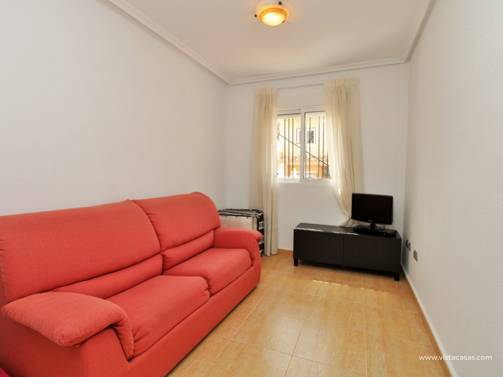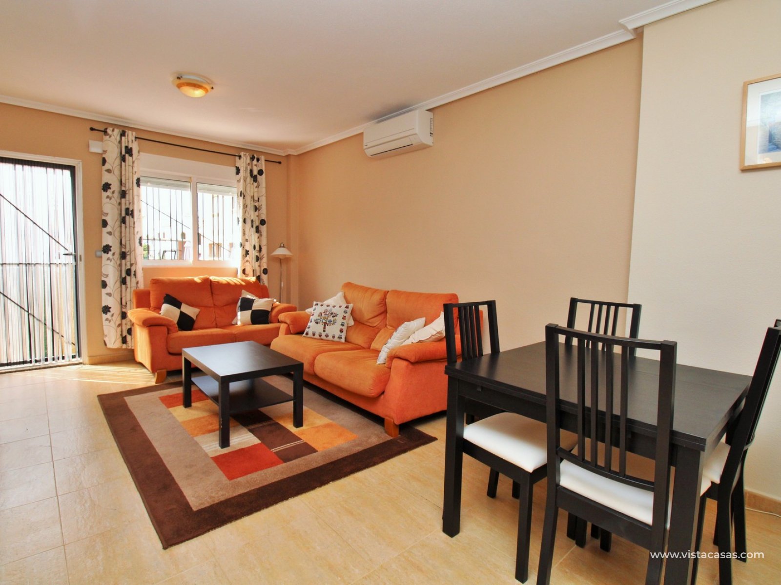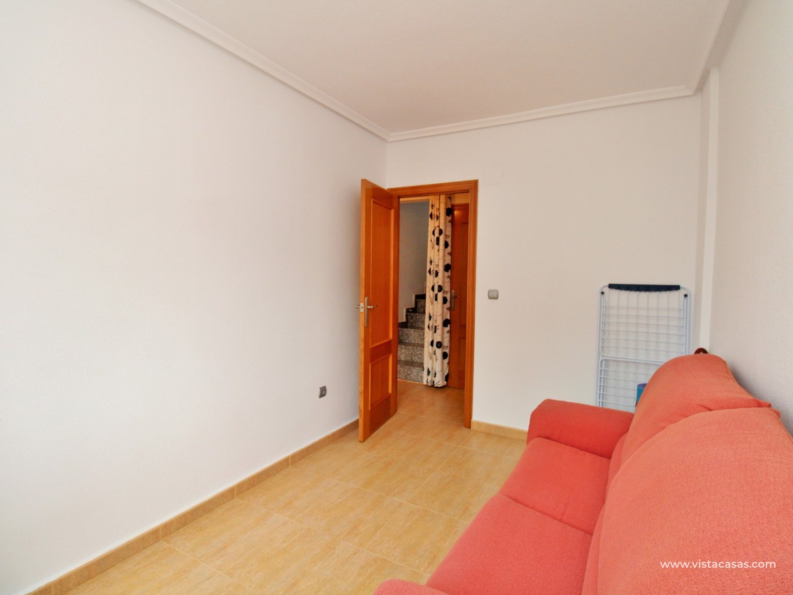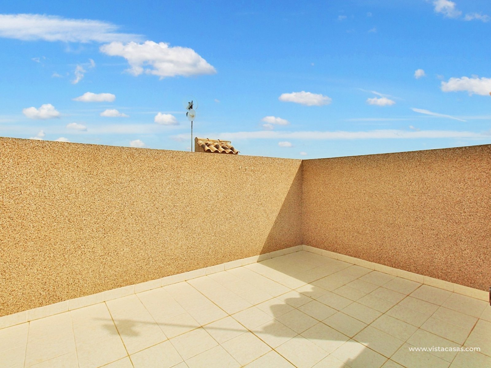 The ground floor comprises a comfortable lounge and dining area with an open-plan kitchen and adjoining utility space, one double bedroom, a modern bathroom with walk-in shower, and a useful under-stairs storage cupboard. Upstairs, there are two further double bedrooms with fitted wardrobes, a family bathroom, and access to a sunny balcony leading up to the rooftop solarium. The property is sold furnished, including white goods and air conditioning. It forms part of a well-kept community with a communal pool close by.