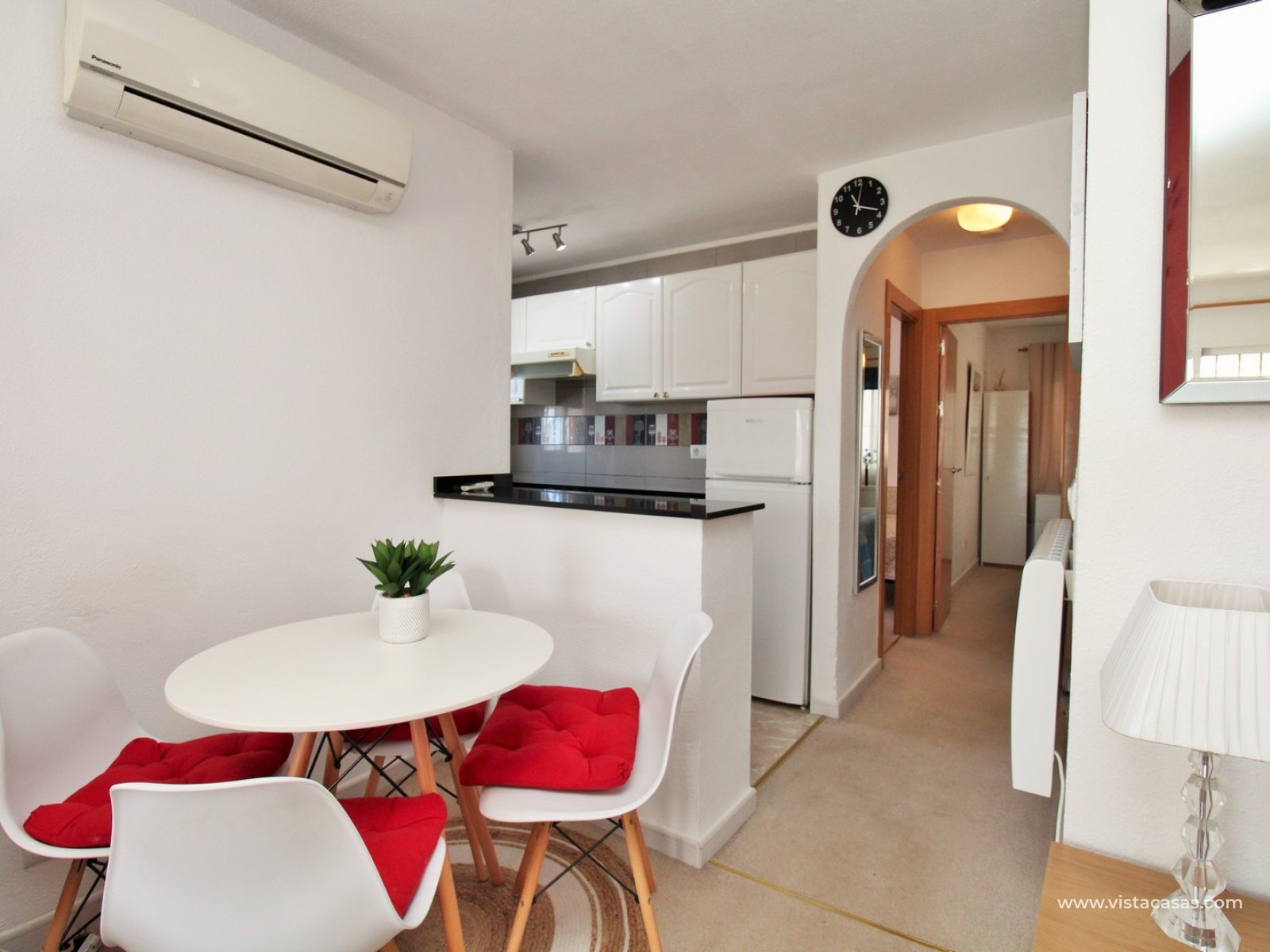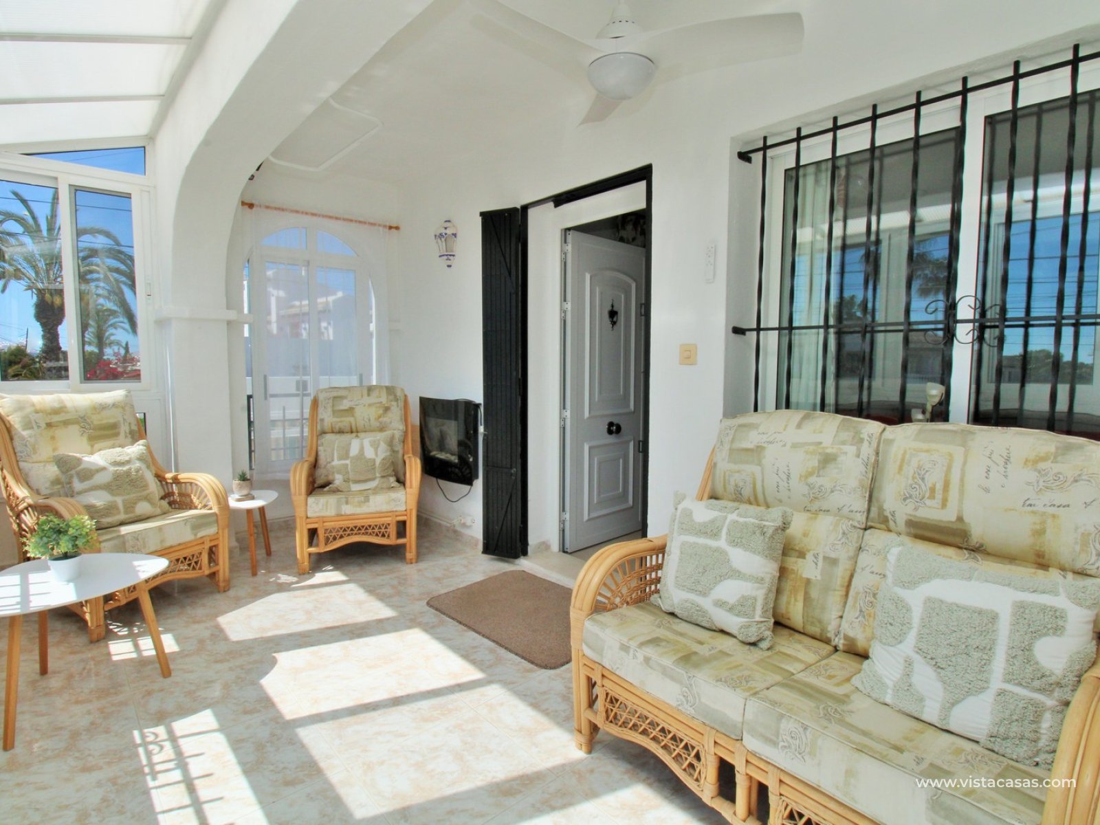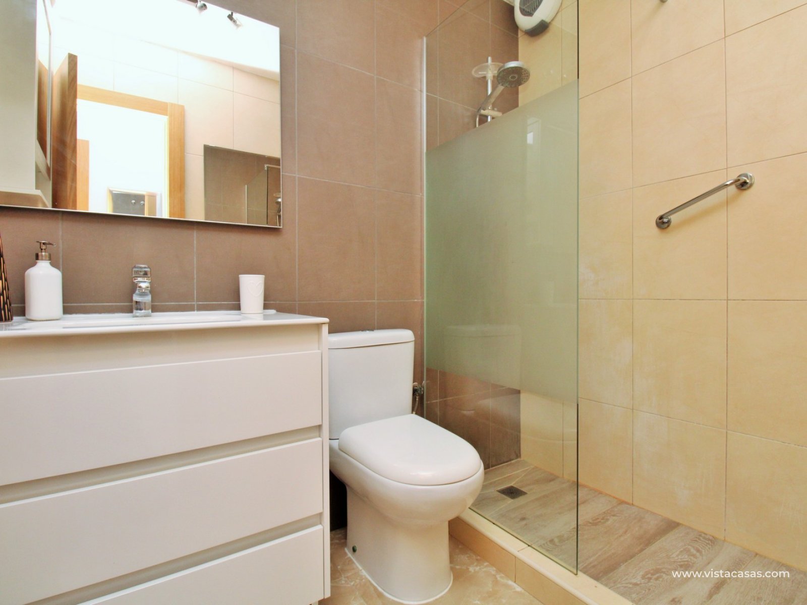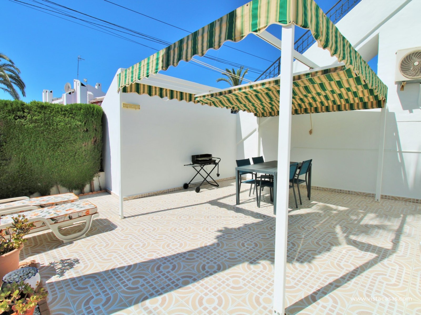 This well-presented ground floor corner apartment, complete with a private tiled garden and terrace, is located in the highly regarded Verdemar III development in Villamartin. The property offers a bright and airy open-plan kitchen and living/dining area with a fireplace, two double bedrooms with fitted wardrobes, and a newly renovated bathroom with a walk-in shower. To the front, the garden provides ample space for outdoor dining and sunbathing, with retractable awnings offering shade when needed. An enclosed terrace/porch creates a comfortable additional seating area, ideal for enjoying the outdoor space throughout the year.