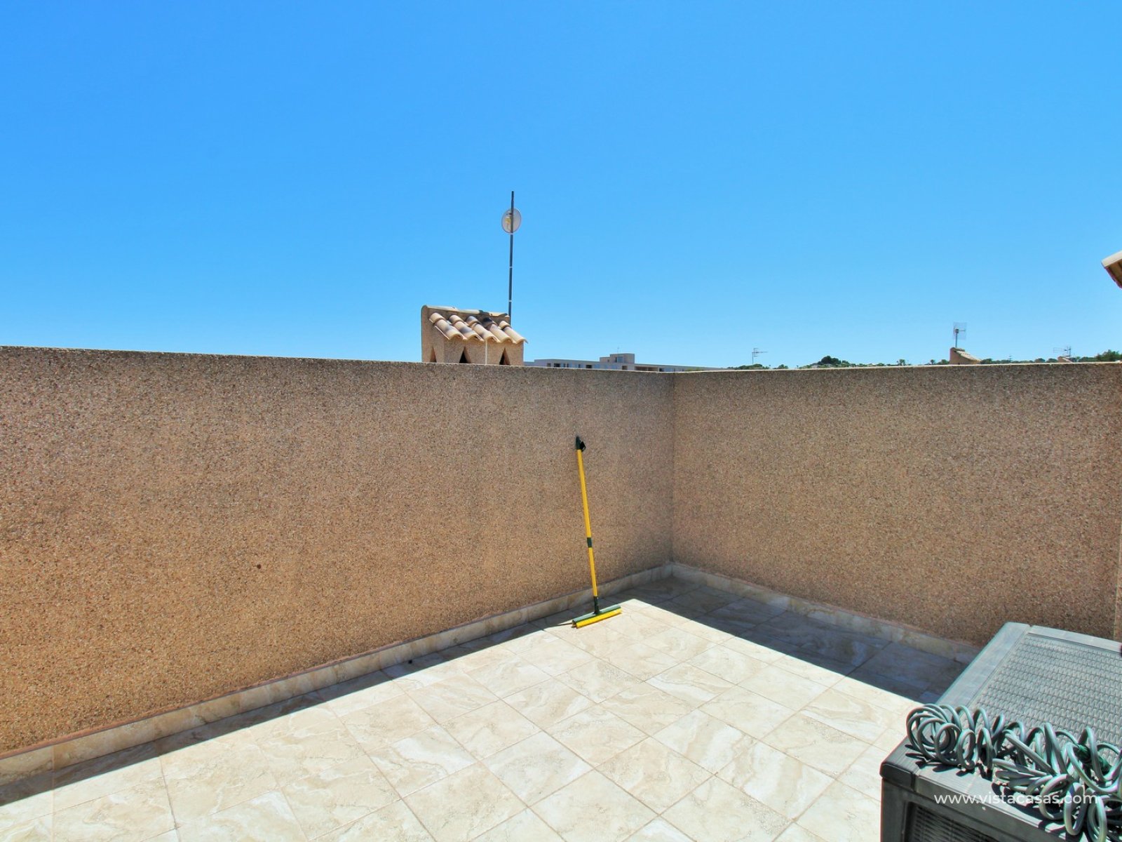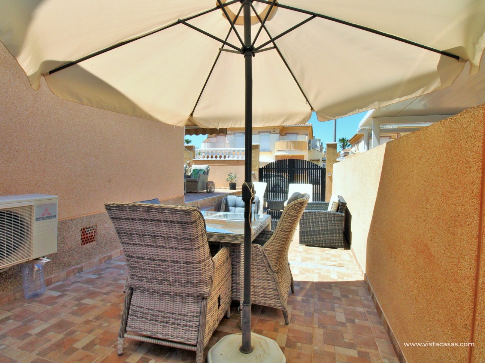 The ground floor comprises a comfortable lounge and dining area with an open-plan kitchen and adjoining utility space that has been refurbished, one double bedroom, a modern bathroom with walk-in shower, and a useful under-stairs storage cupboard. Upstairs, there are two further double bedrooms with fitted wardrobes, a family bathroom, and access to a sunny balcony leading up to the rooftop solarium. The property is sold furnished, including white goods and air conditioning. It forms part of a well-kept community with a communal pool close by.