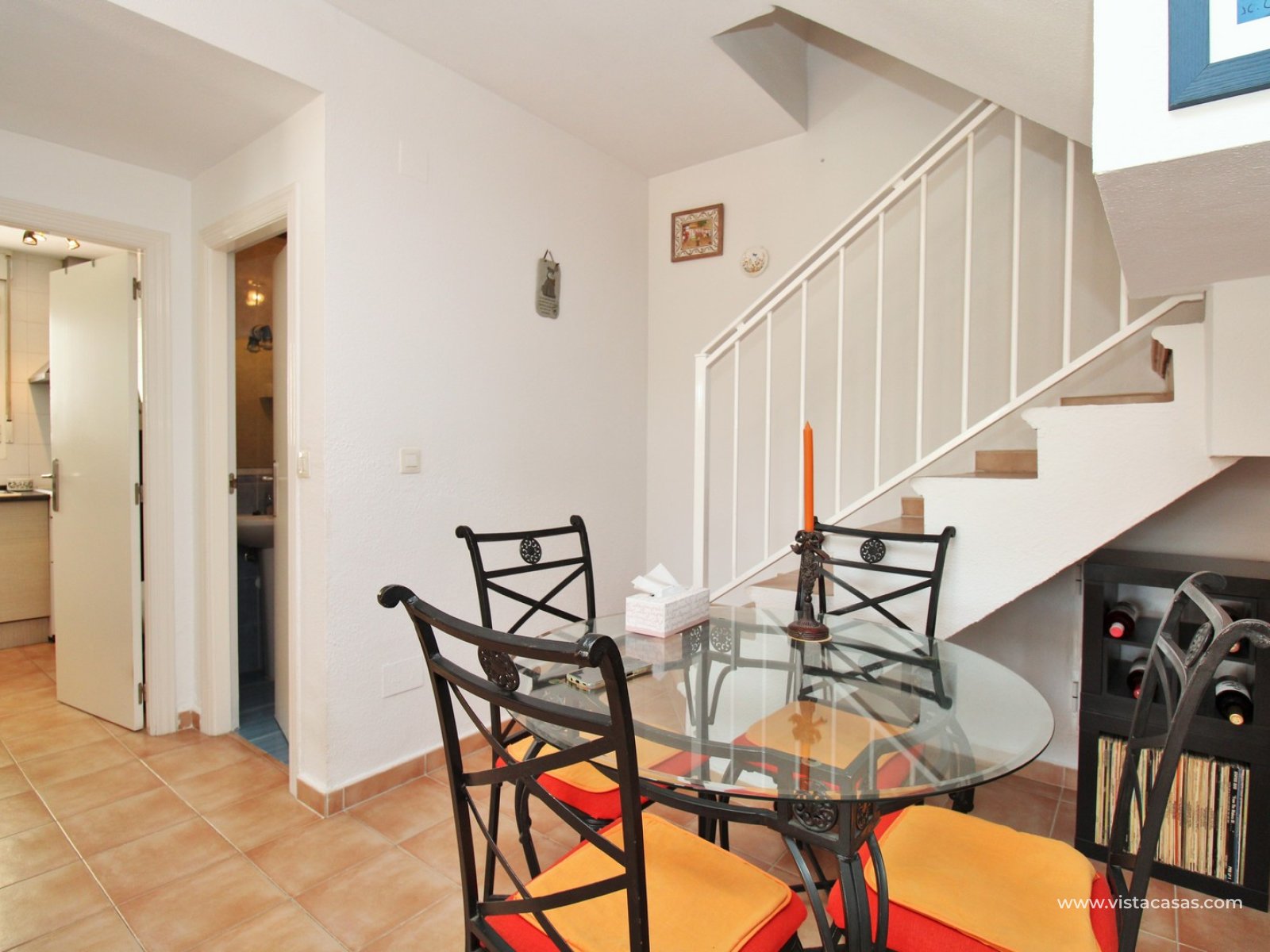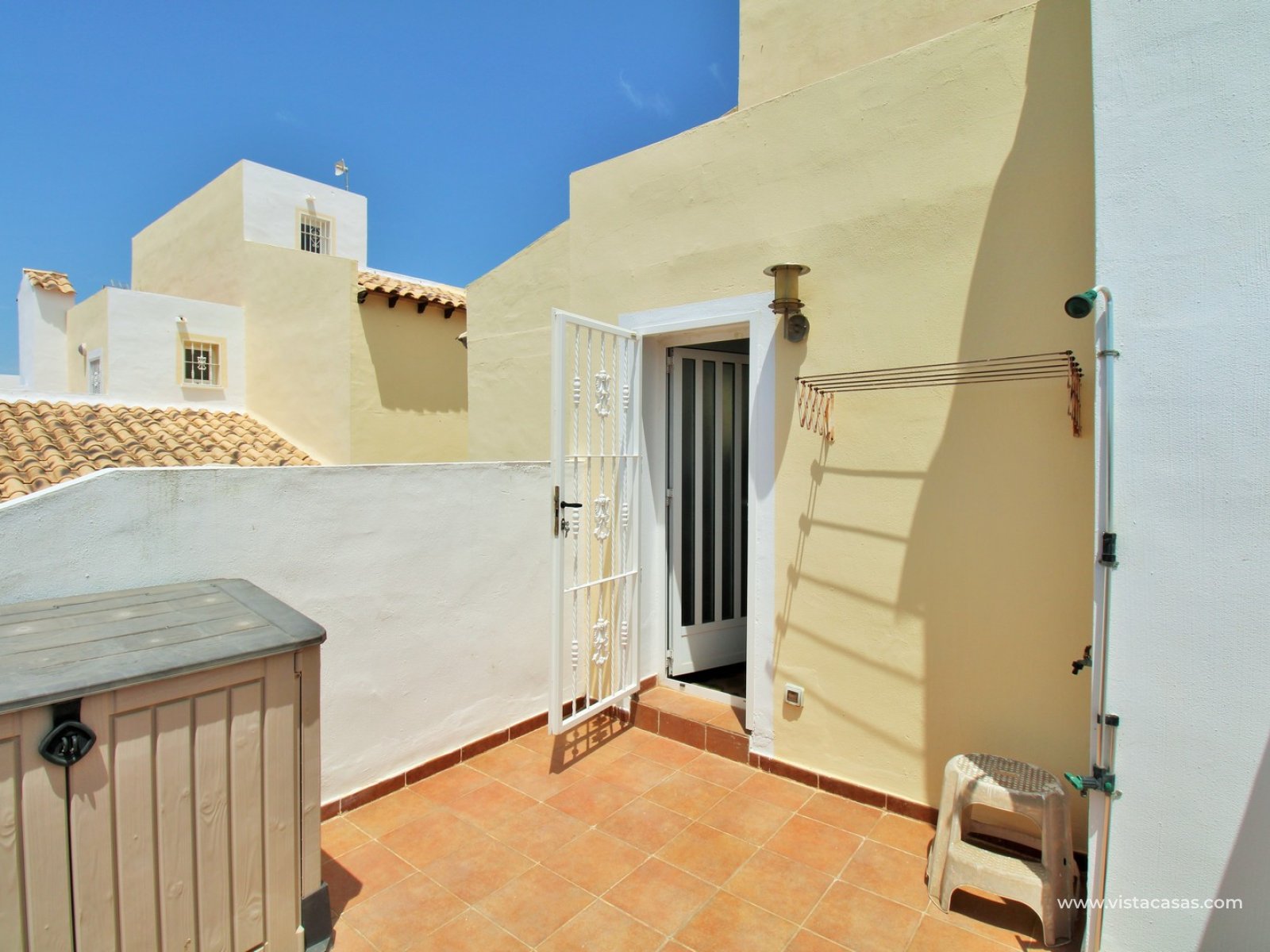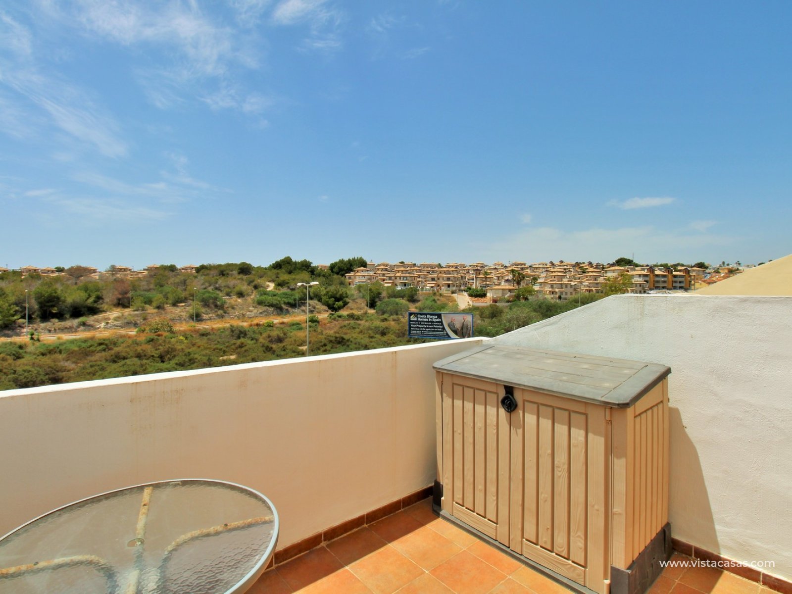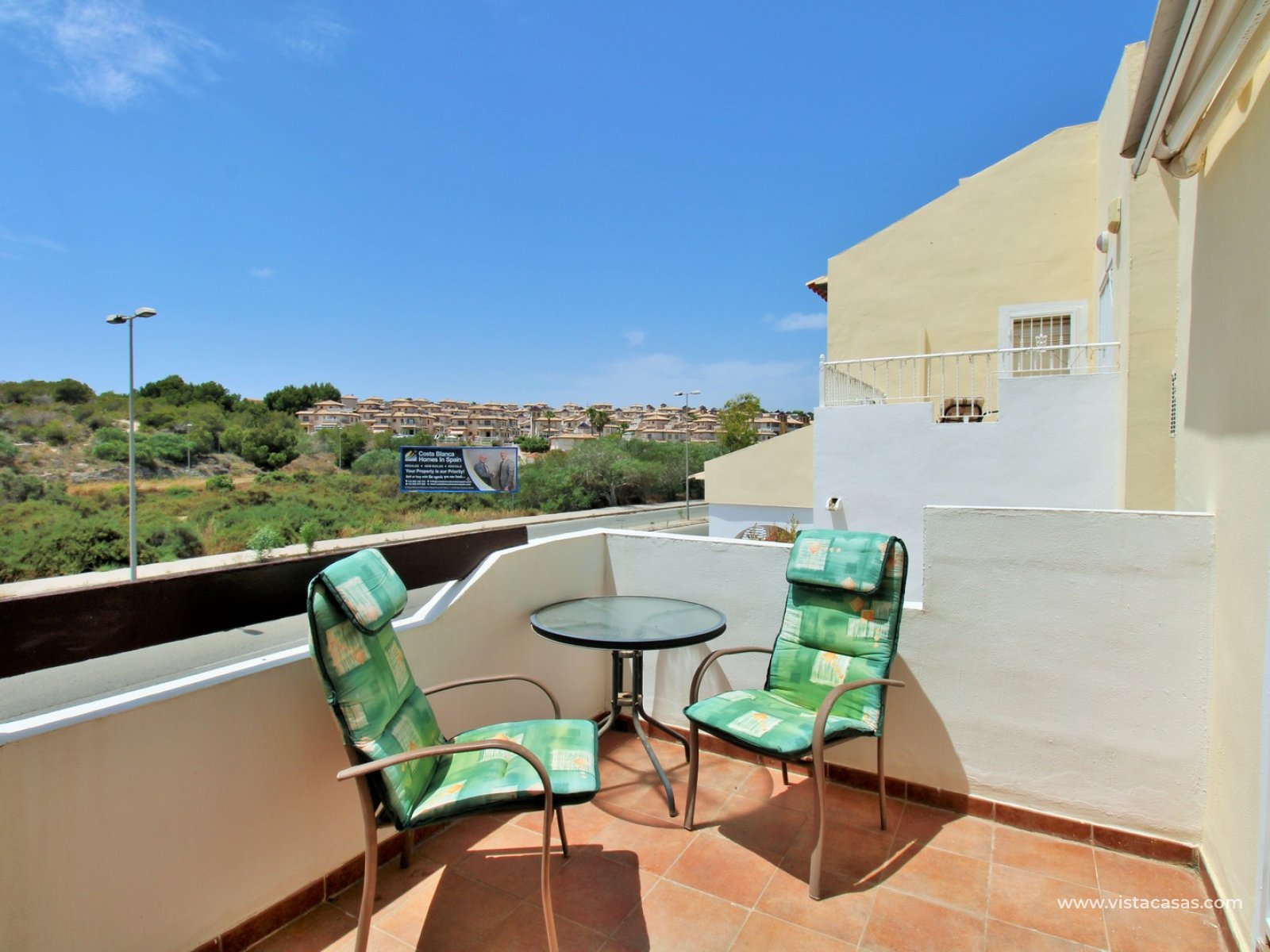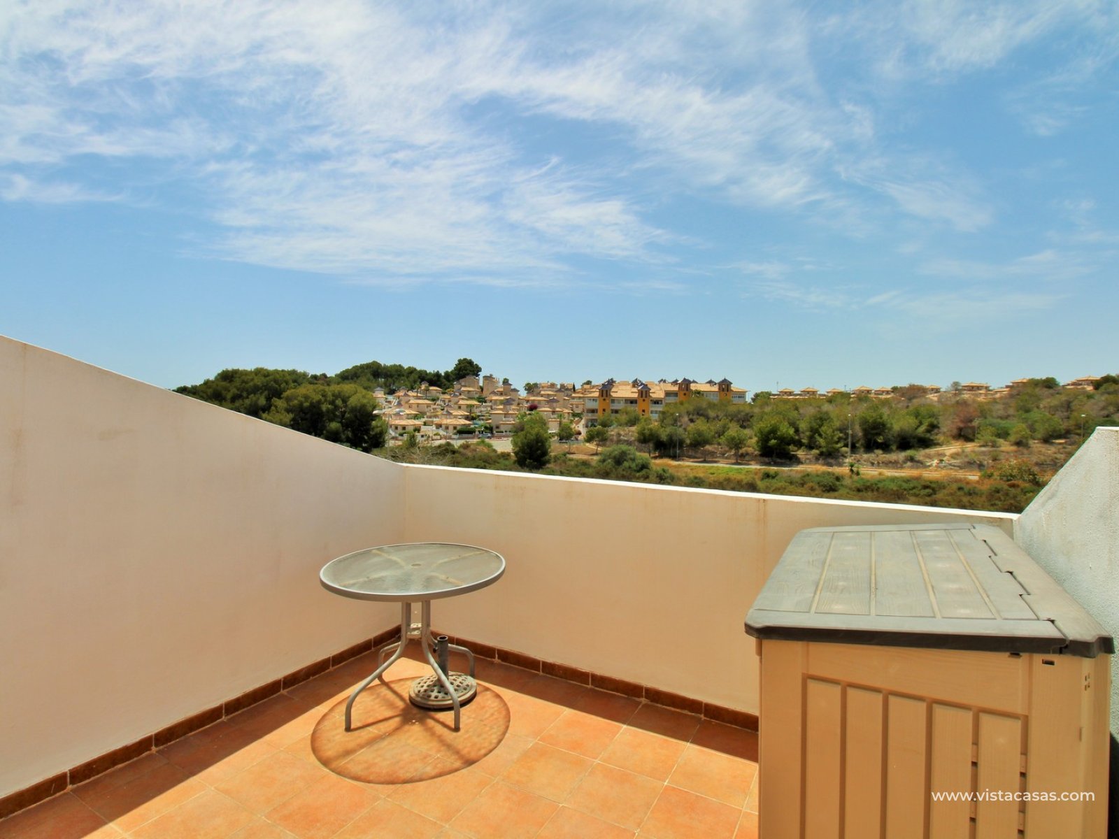On the ground floor, there is a spacious lounge-dining area leading to a separate, fully fitted kitchen with ample worktop space and plenty of storage. This level also includes a guest bedroom with fitted wardrobes and a bathroom with shower. The living area flows through to a covered porch area. Upstairs, there are two double bedrooms, both with fitted wardrobes and access to a shared South-facing balcony. A family bathroom serves this floor. A further staircase leads to a small landing with storage, and access to the private rooftop solarium, which offers open views towards the Villamartin golf course and surrounding area.