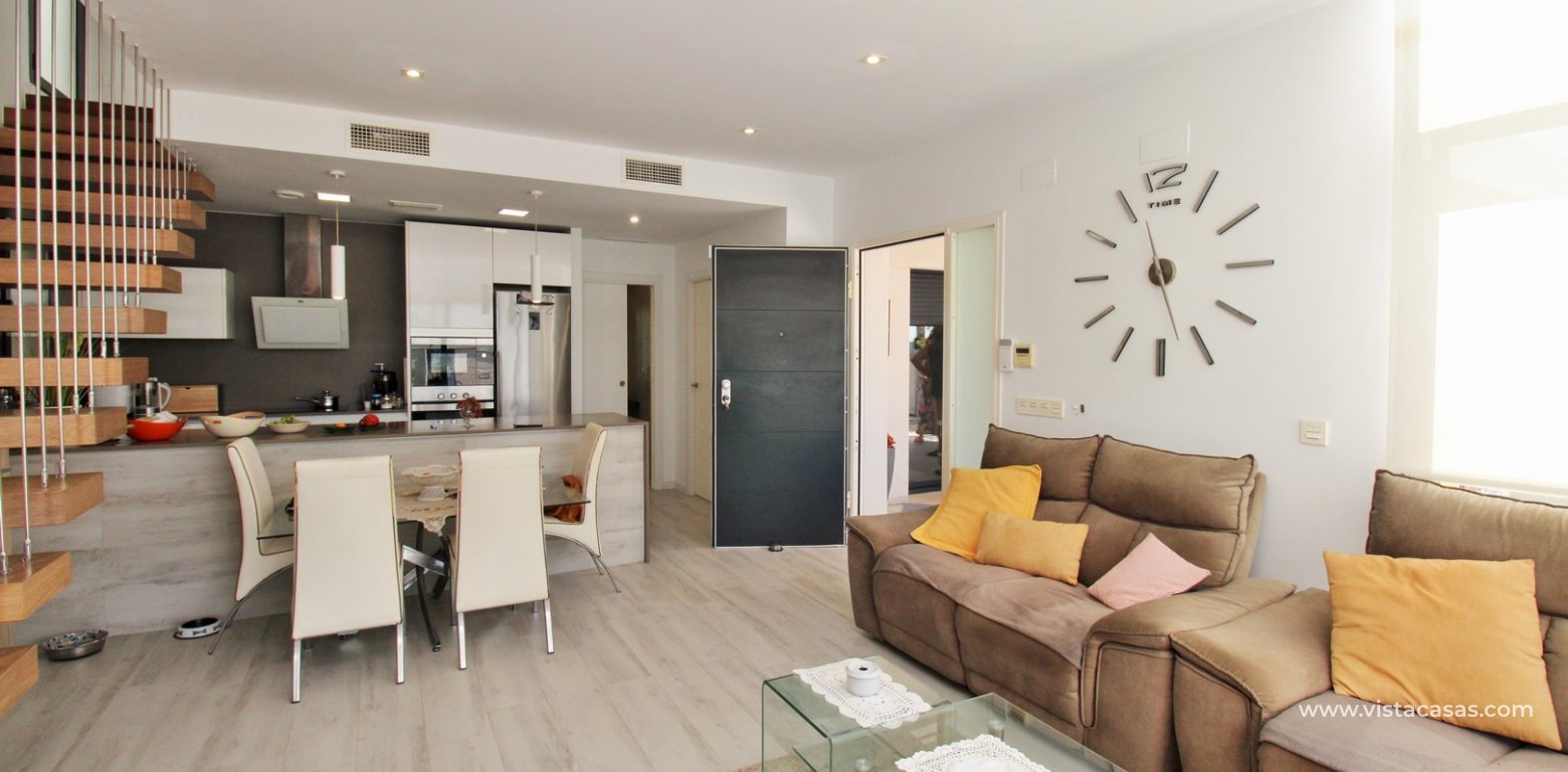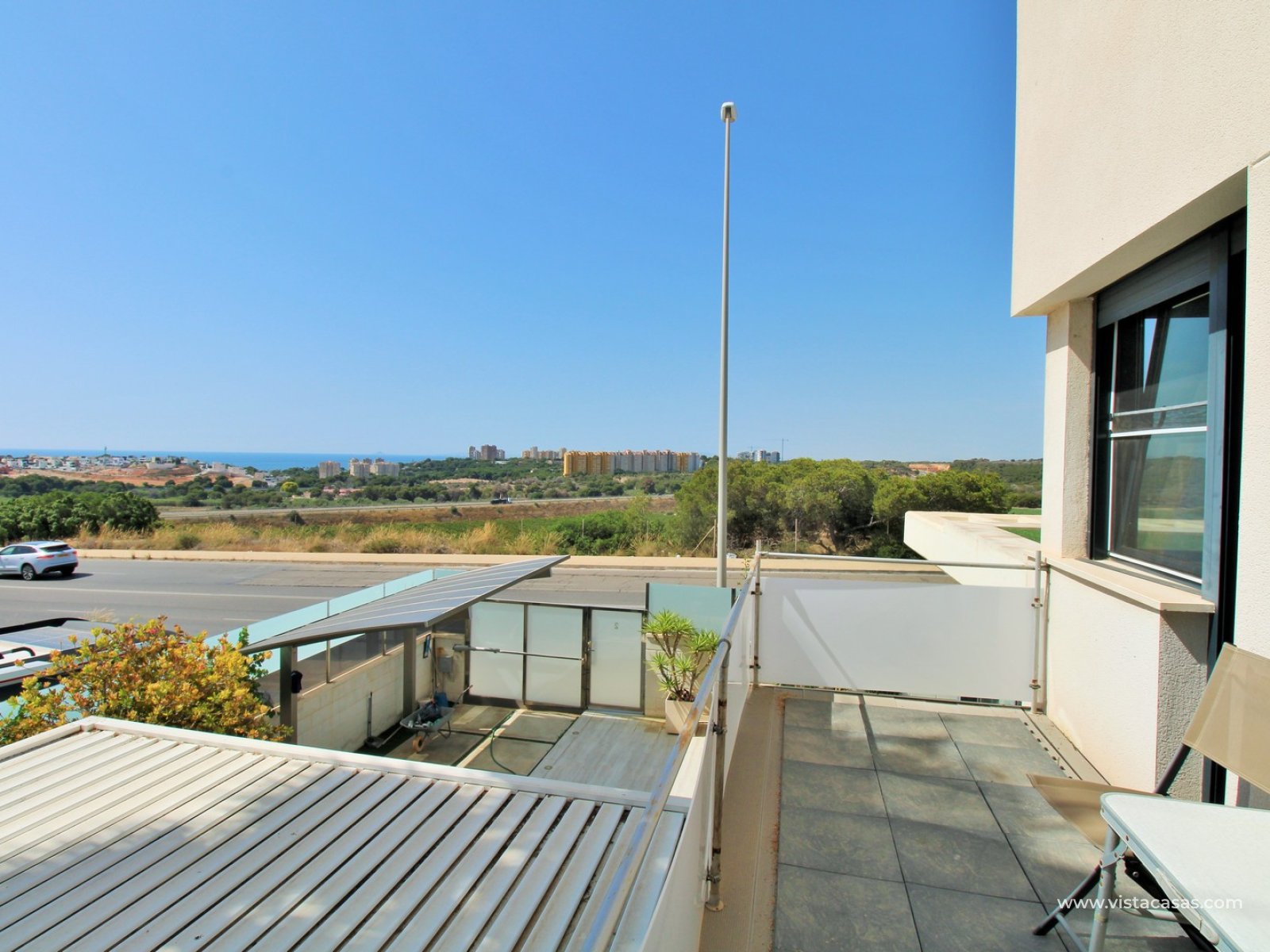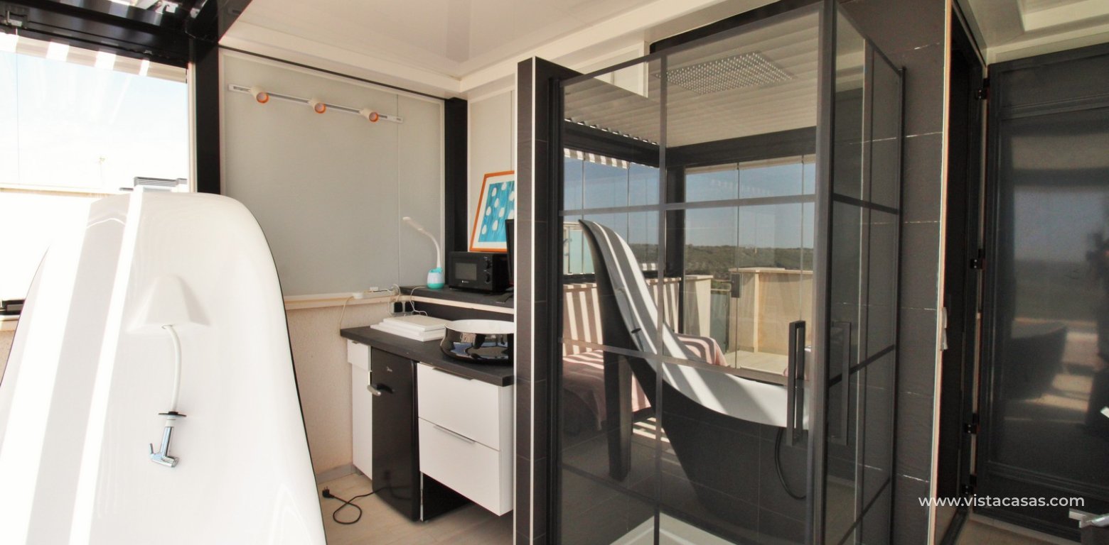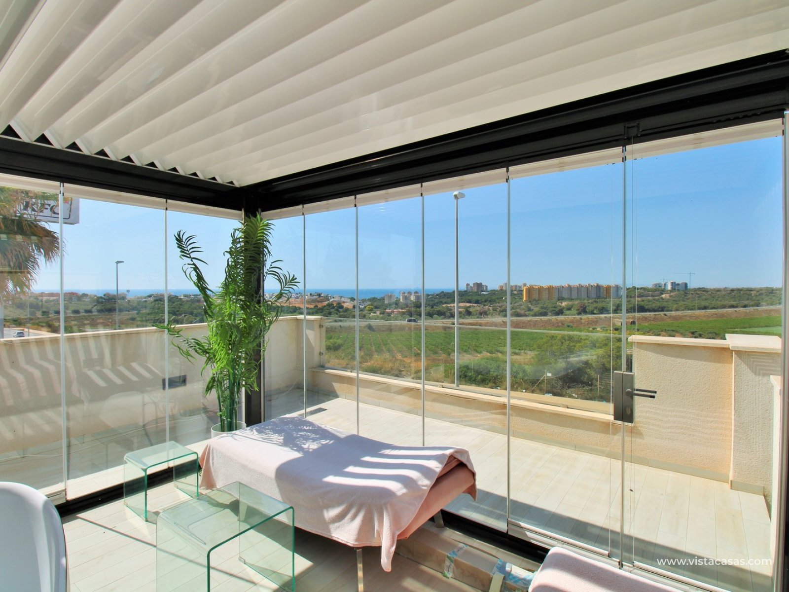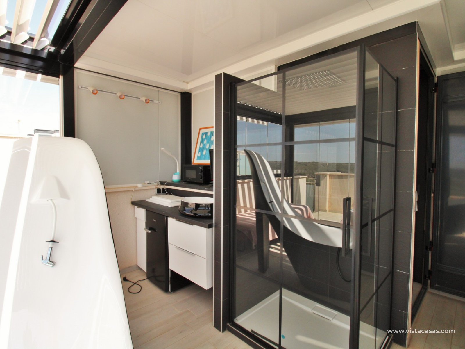 The ground floor comprises a bright open-plan lounge and kitchen, a double bedroom, and a modern bathroom with walk-in shower. Upstairs are two further double bedrooms with fitted wardrobes and a family bathroom. The master bedroom includes an en-suite shower room. All bathrooms benefit from underfloor heating. An external staircase from the first-floor landing leads up to the private solarium, which includes a glazed conservatory. The property is offered fully furnished, including white goods, and features ducted air conditioning throughout.