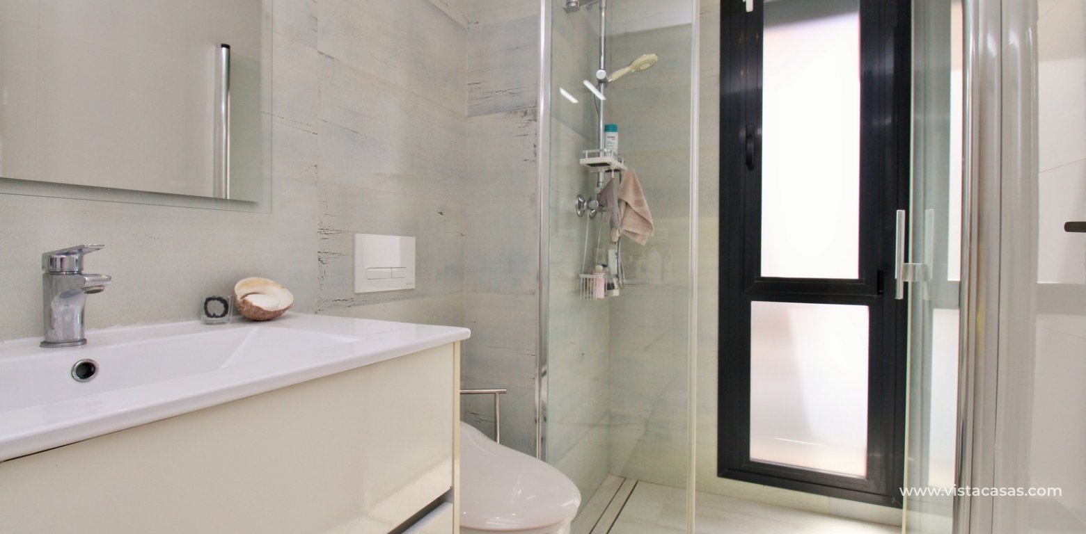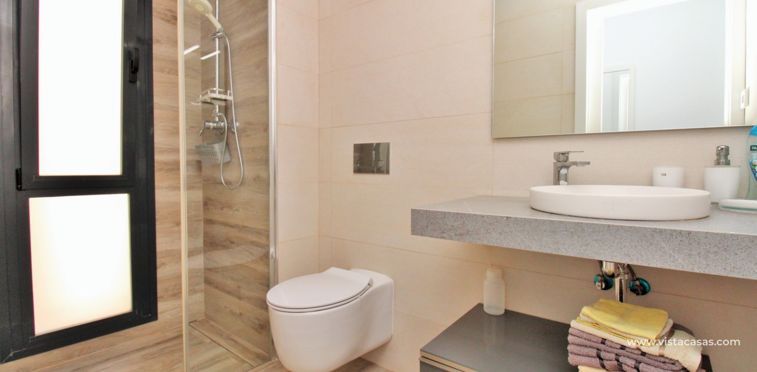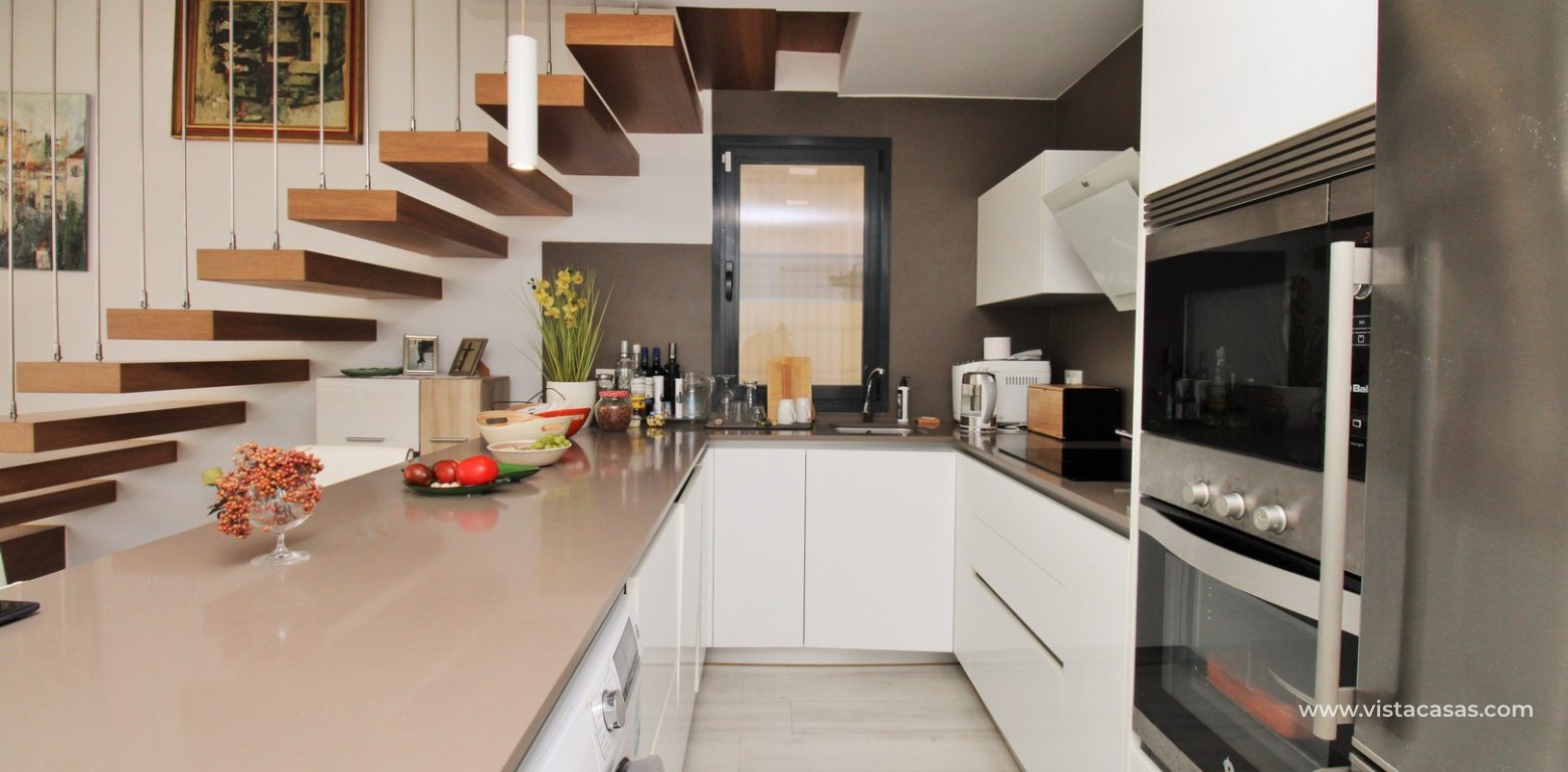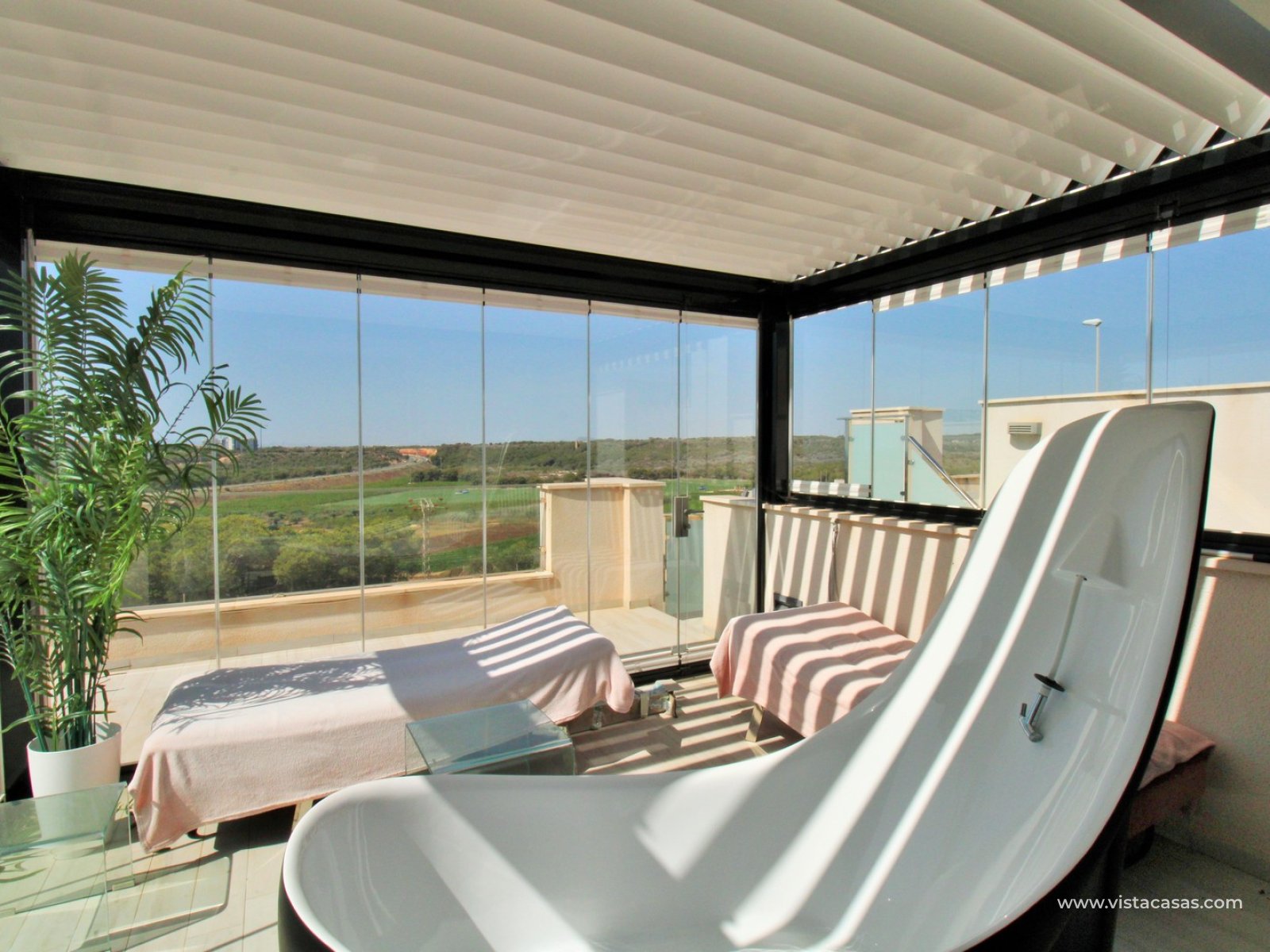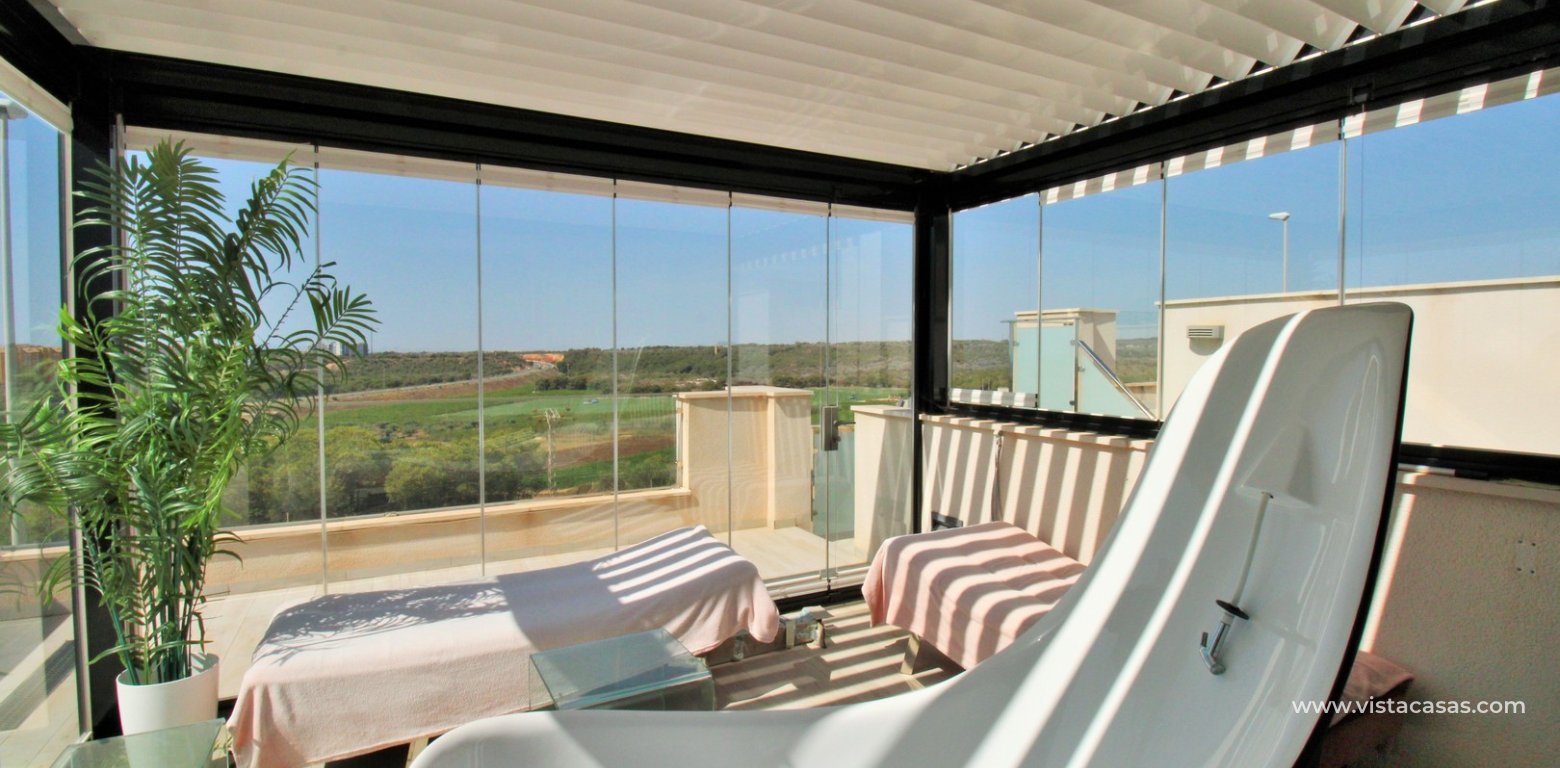 The ground floor comprises a bright open-plan lounge and kitchen, a double bedroom, and a modern bathroom with walk-in shower. Upstairs are two further double bedrooms with fitted wardrobes and a family bathroom. The master bedroom includes an en-suite shower room. All bathrooms benefit from underfloor heating. An external staircase from the first-floor landing leads up to the private solarium, which includes a glazed conservatory. The property is offered fully furnished, including white goods, and features ducted air conditioning throughout.