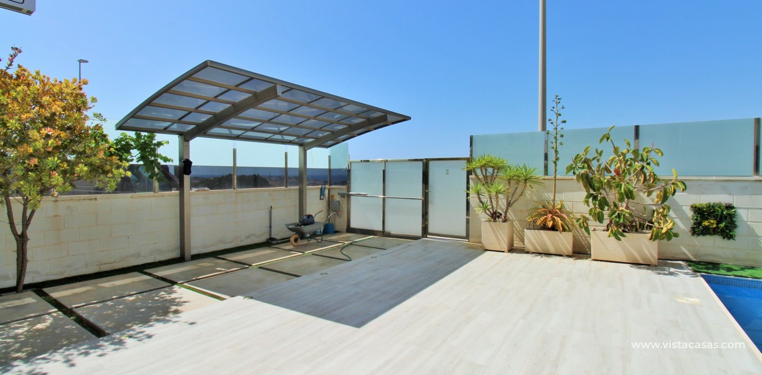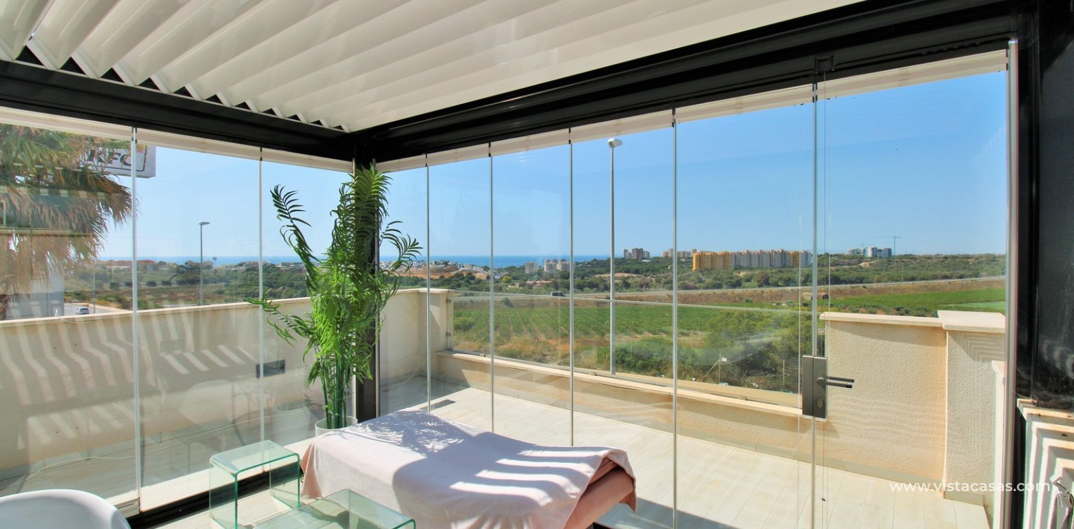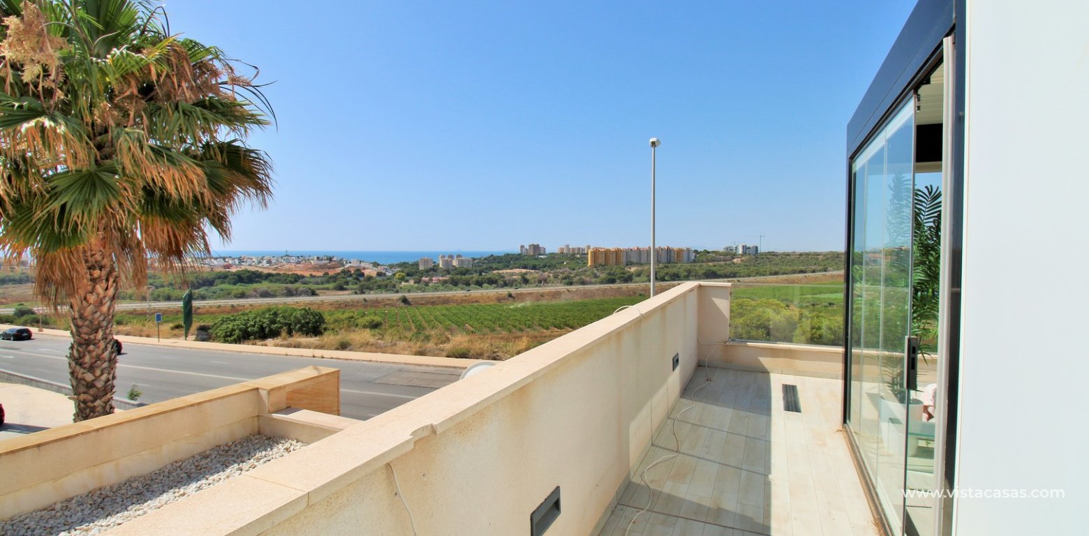 Built in 2018, the villa features generous outdoor space, including a spacious terrace with an electric pergola, a gated driveway, and a roof solarium with sea views.